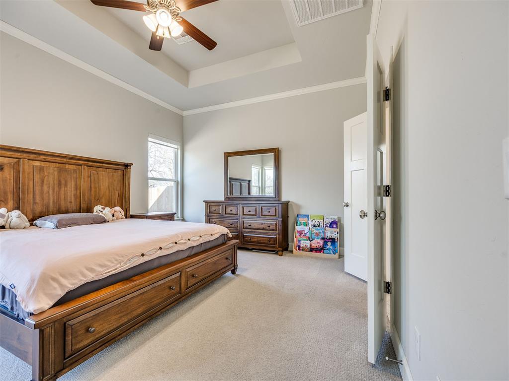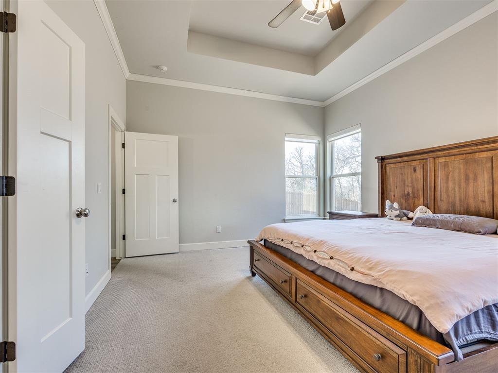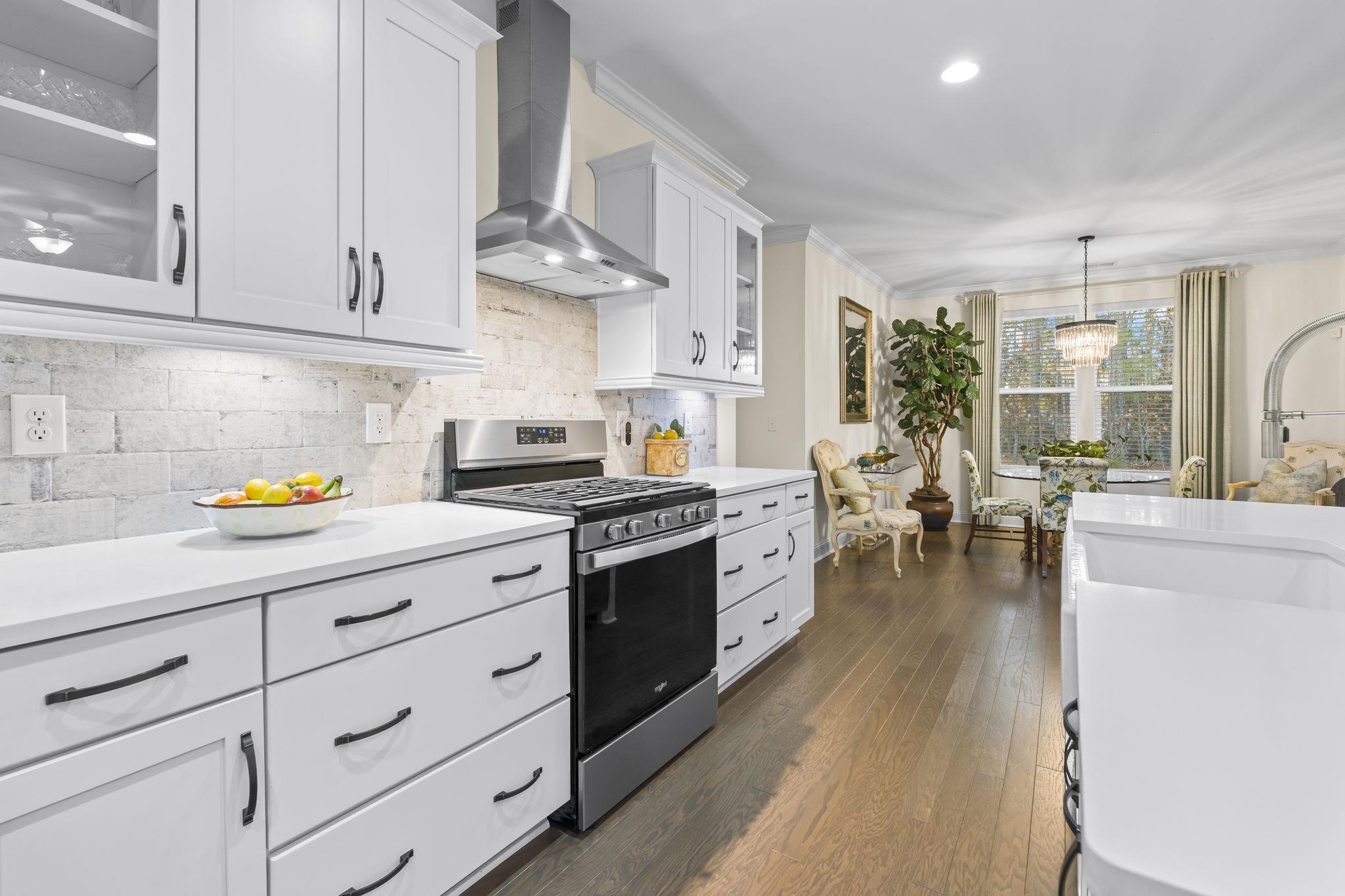 Beautiful ranch-style residence featuring 4 bedrooms and 2.5 baths, thoughtfully enhanced and impeccably maintained, truly move-in ready! This distinguished home offers expansive windows that bathe the interior in natural light, elegant tray ceilings, rich wood flooring throughout most of the home, upgraded tile, crown molding, and widened 36-inch doorways in many areas for enhanced accessibility.