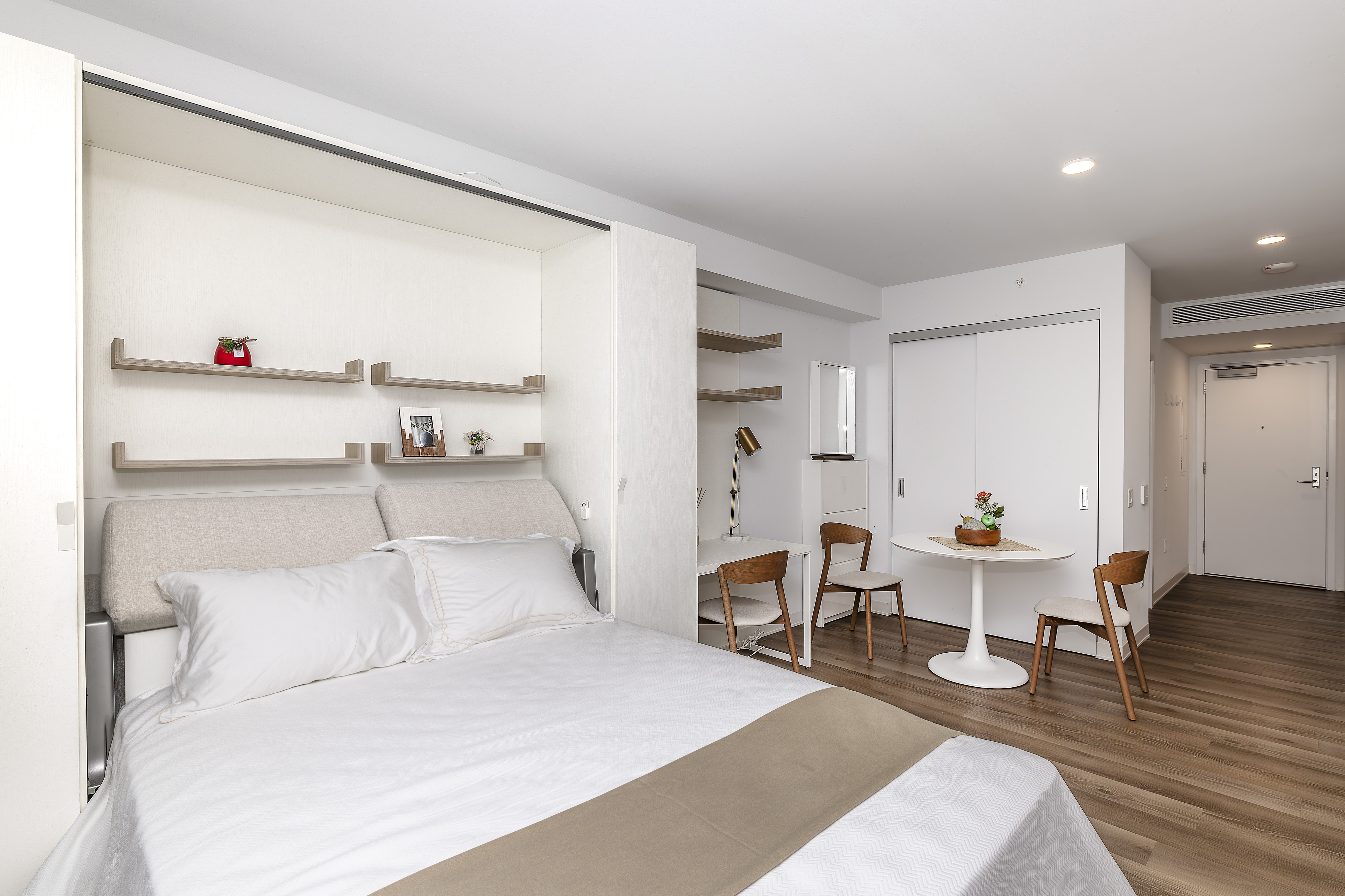 Discover the perfect blend of style and efficiency in this 363 SF studio at A‘ali‘i in Ward Village. Designed for smart living, it features a Murphy bed to maximize space and a spacious kitchen with marble countertops, sleek white enamel cabinets, and top-of-the-line Bosch appliances. For added convenience, enjoy the luxury of an in-unit washer & dryer.