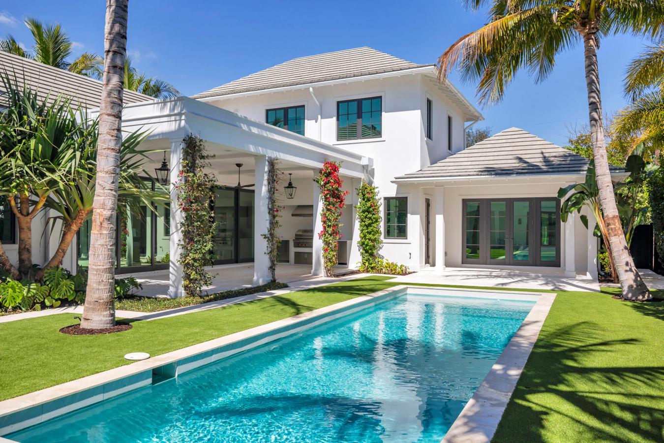 Situated on an oversized 13,425 sq. foot lot with a private back alley entrance to the properties three car garage, rests the stunning contemporary new construction home featuring 6 bedrooms, 7 full bathrooms and two 1/2 bathrooms. Architecture by Dailey Janssen, designed by Hive Palm Beach and built by the Cury Group, this luxurious designer made home is turnkey. Hosting the best of the best, the kitchen incorporates a 48 Wolf 8-burner gas range, a Bosch dishwasher, a Subzero fridge/freezer, and fixtures by Waterworks. Adjacent to the magnificent kitchen and great room is a thoughtful butlers pantry with quartzite countertops, an additional Bosch dishwasher and Subzero fridge & freezer drawers. This home incorporates two staircases each leading you to 2 separate guest bedrooms. Above the primary bedroom hosts 2 of the en-suite bedrooms while the other two guest bedrooms are uber private with a designated staircase above the living room overlooking the pool.With views of the lush landscaping, swimming pool and cabana from just about every angle, this home and its grounds are ideal for entertaining guests while also being perfectly proportioned to feel cozy and comfortable alone at home with family/ friends on the sofa. Close to area beaches, Worth Avenue shopping, A-rated restaurants, and top tier schools.