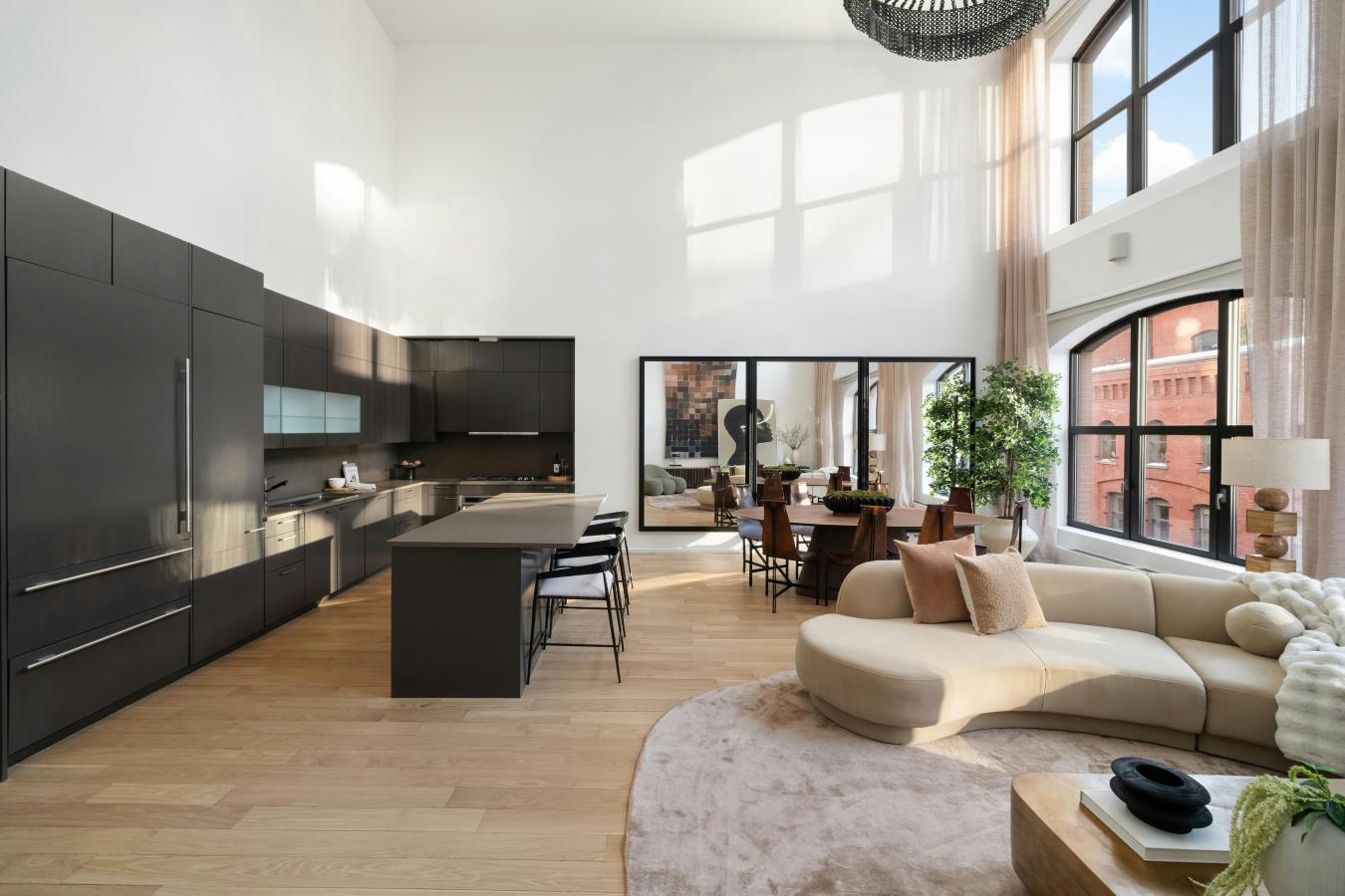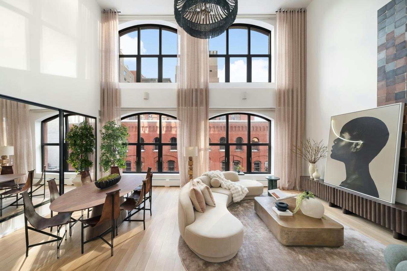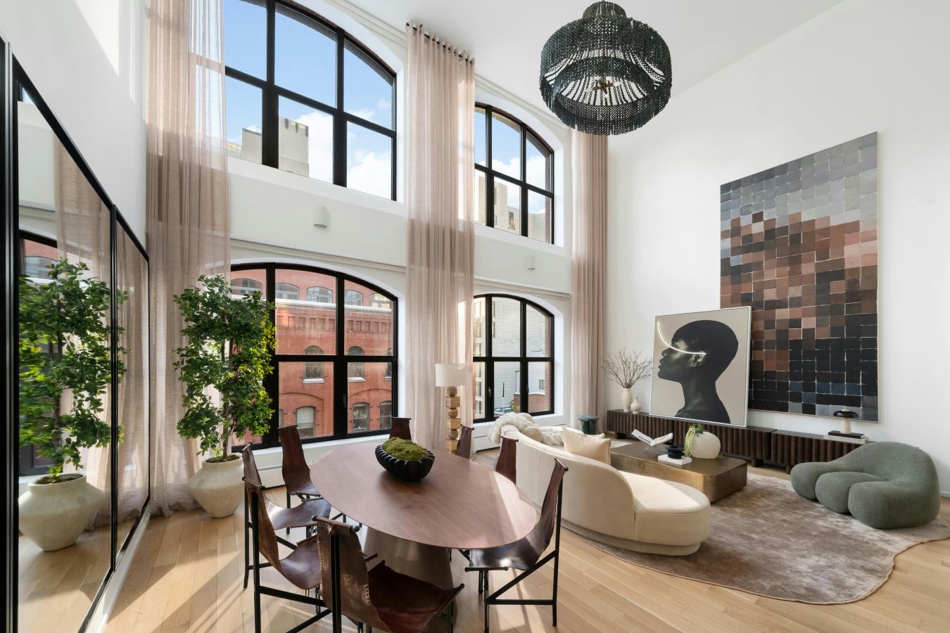 The moment the keyed elevator opens directly into 55 Vestry 5C, the feeling is immediate: air, light, and an uncommon sense of calm. 22-foot ceilings lift the great room into something far rarer than simple size: true volume. Golden western sunlight pours through two stories of oversized arched windows, drifting slowly across white oak floors as the day unfolds.