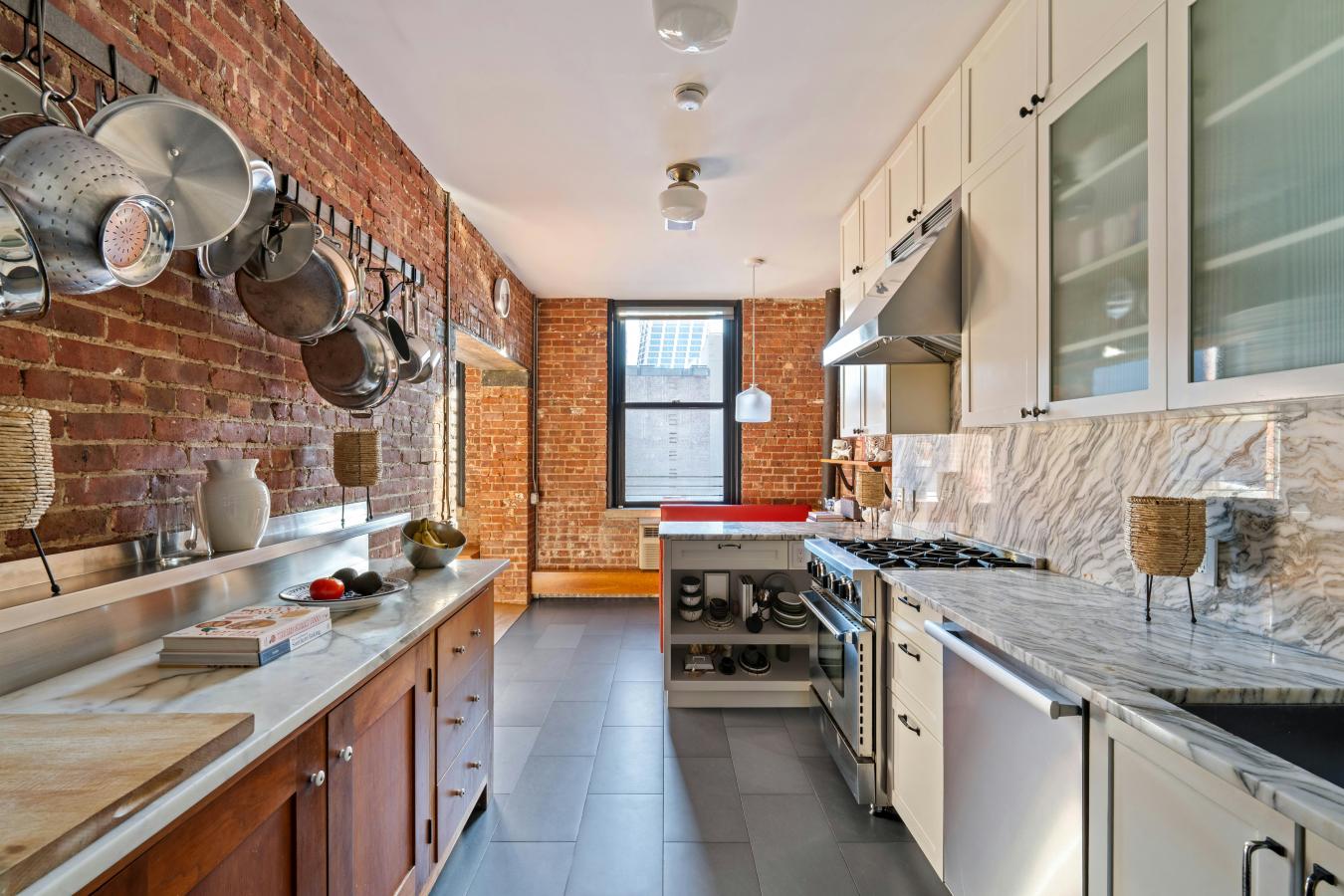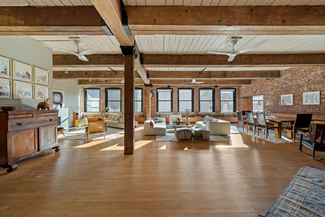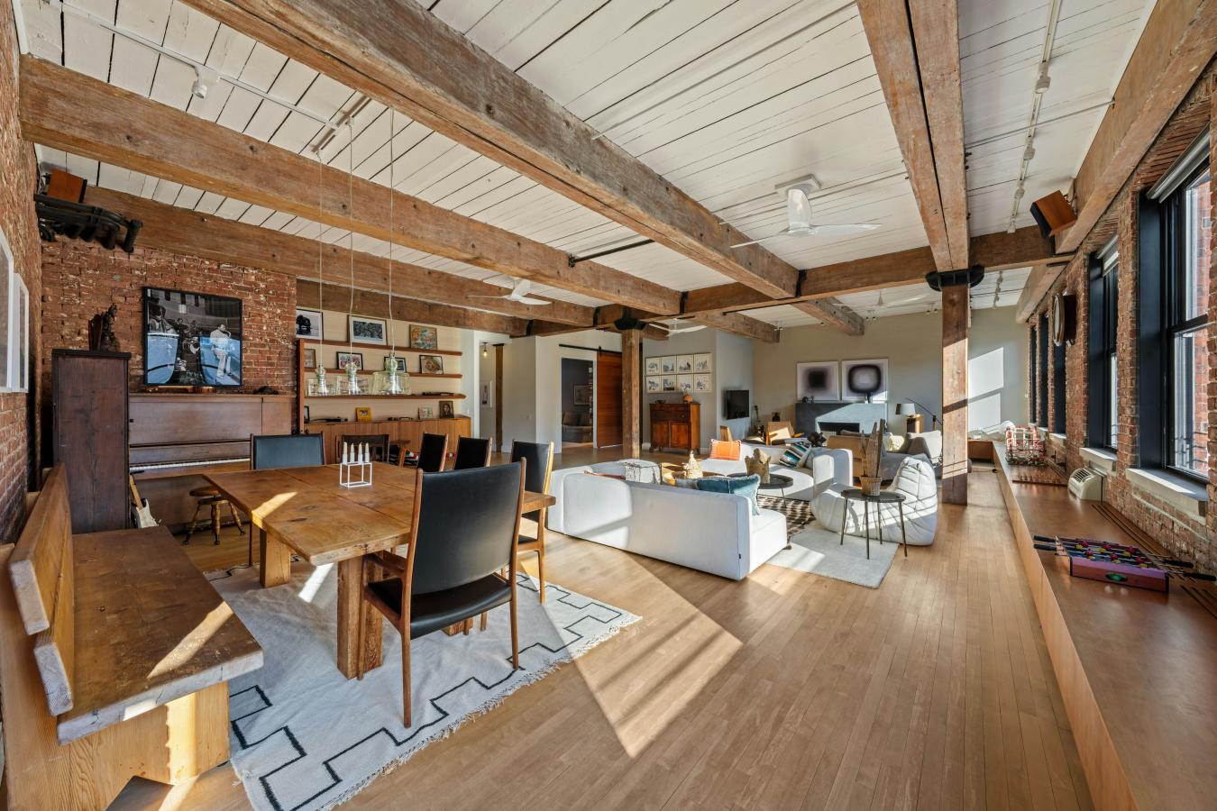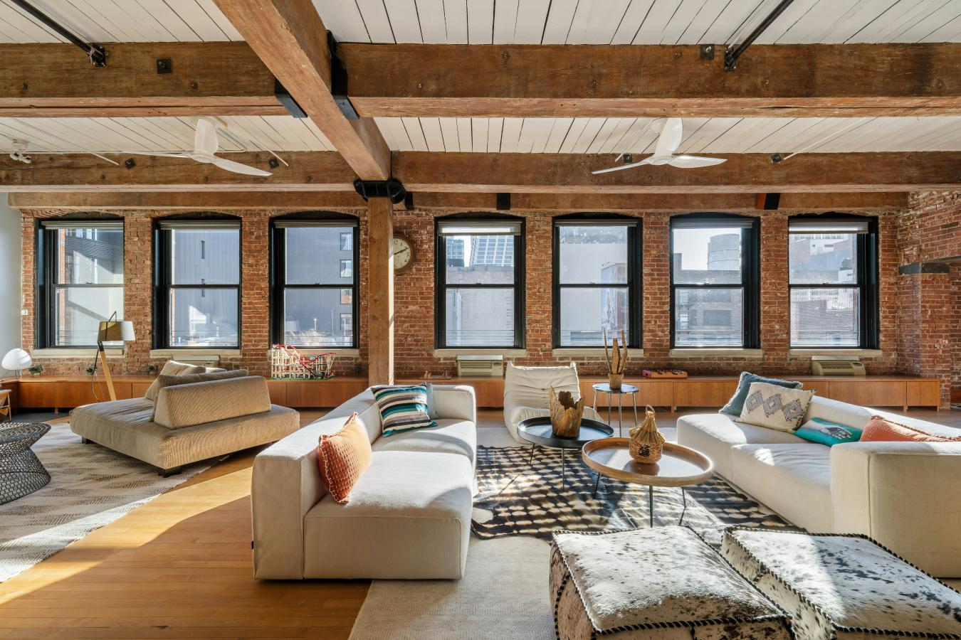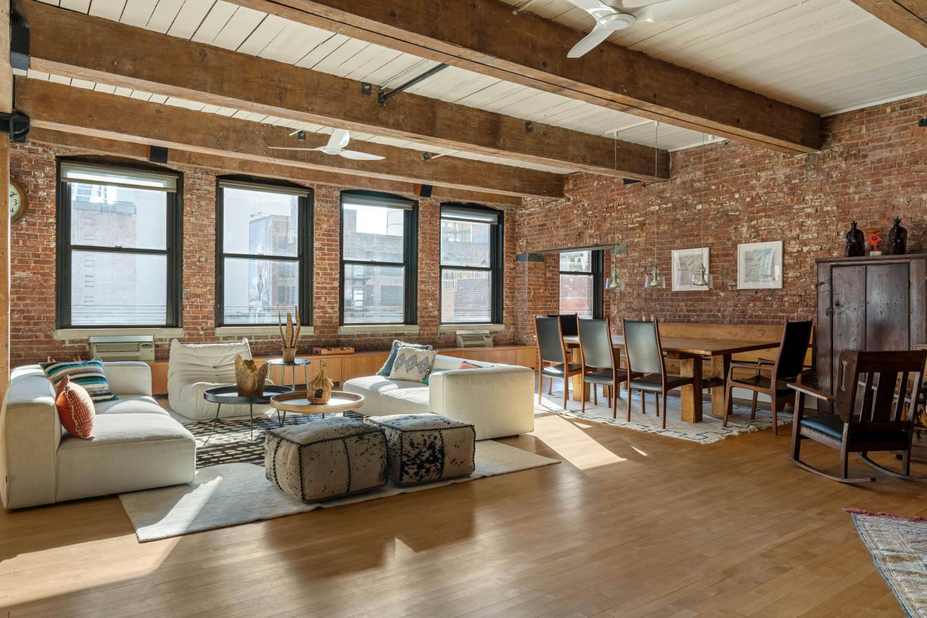 Sprawling 3-Bedroom Loft in the Heart of West Chelseas Gallery District Welcome to Residence 5A at The Spears Building - a former furniture warehouse constructed in 1880, now an intimate loft condominium abutting the High Line. Rich in provenance and architectural detail, this extraordinary 3,033-square-foot home embodies authentic industrial character with exposed brick walls, massive first growth wood beams and columns, cast iron column caps, high wood plank ceilings, and 13 oversized windows. At the center of the home is a dramatic 42-foot great room, illuminated by seven south-facing windows that flood the space with natural light throughout the day. Designed for both grand entertaining and everyday living, this expansive room offers multiple seating areas, a wood-burning fireplace, a generous dining area, and even space for a grand piano. Custom cabinetry runs the length of the room beneath the windows, providing abundant storage and built-in bench seating. Just off the great room are two versatile bonus spaces: a cozy media room and a handsome study with custom built-ins. The windowed kitchen is thoughtfully appointed with extensive cabinetry, a 178-bottle wine refrigerator, and charming built-in booths that comfortably seat four. A long gallery-style hallway lined with bookshelves leads to the private bedroom wing. The primary suite is generously scaled with a walk-in closet in addition to a full wall of floor-to-ceiling closets in the dressing area - ensuring that living space is never compromised by storage. The second bedroom is cleverly designed with a lofted bed and integrated storage below, maximizing flexibility and function. A third bedroom and two full baths, both with double vanities, complete the wing. Additional highlights include a rare, oversized "urban garage" off the foyer - ideal for bikes, recreational equipment, or seasonal items - as well as a dedicated laundry room with sink, folding counter, and extensive shelving. Converted to 30 residences in 1996, The Spears Building retains its historic charm while offering modern conveniences. Once outfitted with loading docks that allowed furniture to be transferred directly into boxcars along the High Line, the building now enjoys a unique relationship with the park - its eastern facade serving as a backdrop to one of the High Lines beloved seating areas. Amenities include doorman, basement storage, and a beautifully landscaped rooftop terrace. Perfectly positioned in the heart of West Chelsea, moments from world-renowned galleries, Hudson River Park, Chelsea Market, Hudson Yards, The Shed, Chelsea Piers, Avenues School, PS 11, Clement Clarke Moore Park, and neighborhood favorites like Empire Diner and Cookshop.