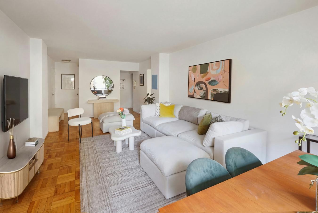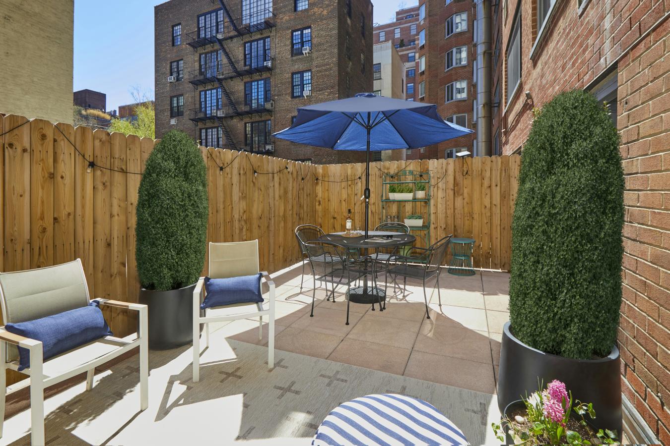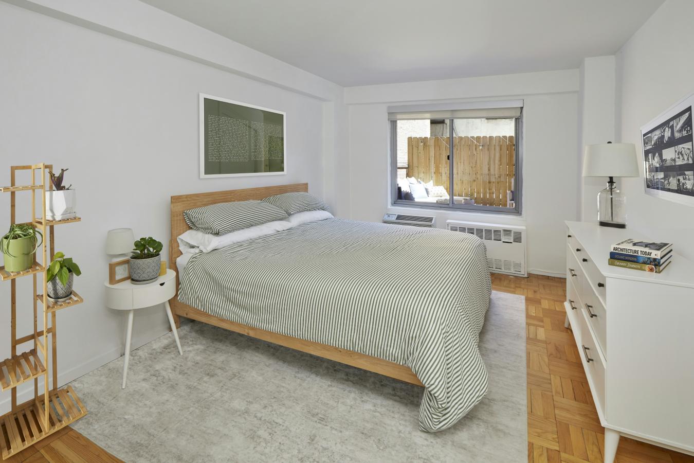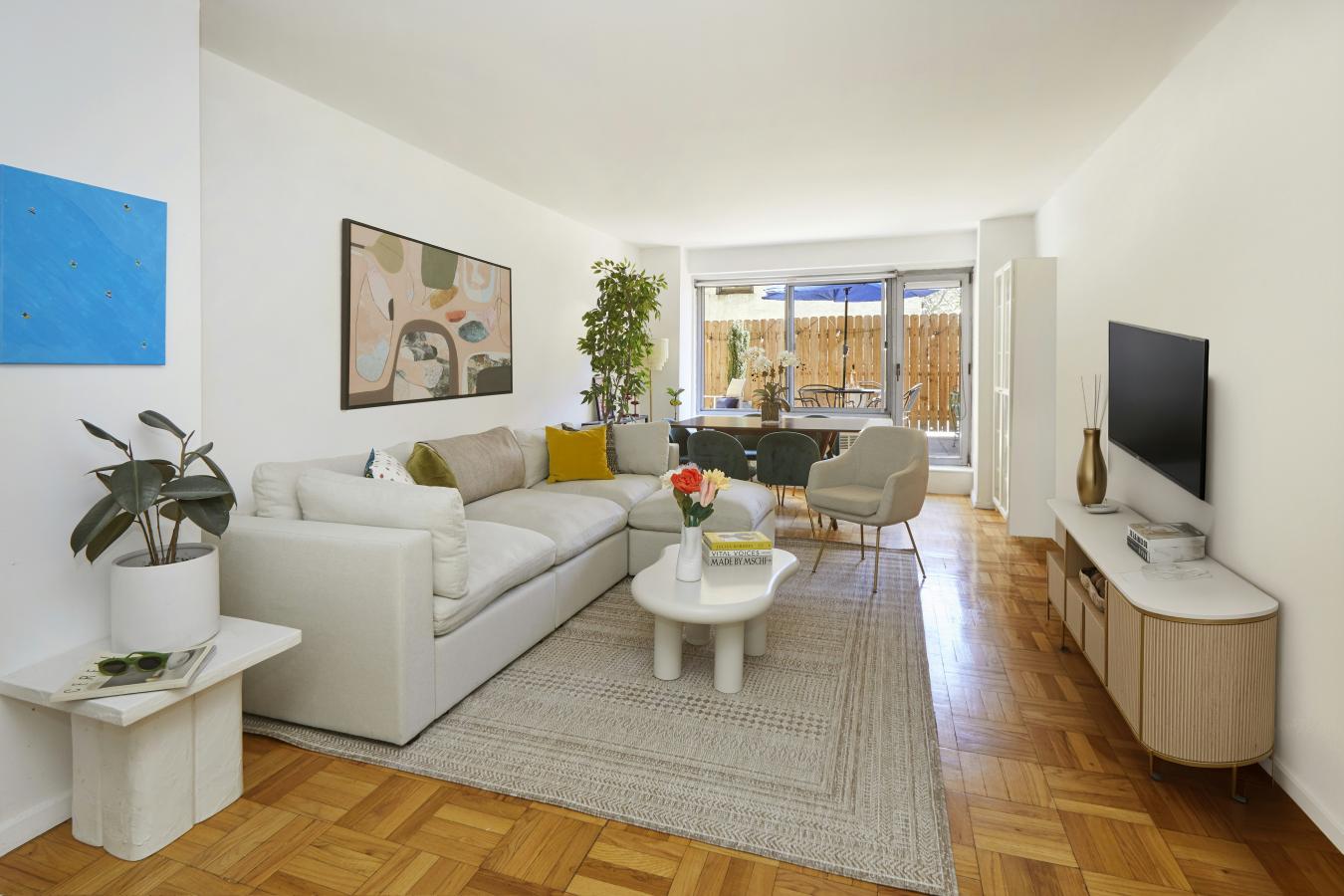 Rarely available one-bedroom CONDO with a serene quiet private terrace at the nexus of the West Village and Greenwich Village! Upon entry, you are greeted with a 26-foot long great room with the backdrop of your own Southeast-facing private terrace (approx. 300 SF). This large room offers distinct spaces for both a spacious living room and comfortable dining area with easy access to the terrace for a peaceful retreat in the heart of Greenwich Village. The large bedroom facing the tranquil terrace is spacious enough for a king-size bedroom set, dressers and a desk so you can WFH. The long separate kitchen is fitted with white-on-white appliances complimenting the white cabinets and large quartz countertops. Adjacent to the bedroom, the bathroom features a newly reglazed iron cast shower tub and stone tile floor throughout. Along with 5 closets and hard oak floors complete this lovely home. Located where the Gold Coast of Greenwich Village meets the West Village, you will be hard-pressed to find a better location than 175 West 12th Street, next to St. Vincents Triangle Park, easy walking distance to Meatpacking District and Hudson River Park. An express subway station is adjacent to the building entrance, buses are just steps away, and all other subway lines and PATH trains are within a few blocks. The condo is surrounded by the charming historic district filled with award winning restaurants, boutique shops and health clubs (TMPL, Equinox, SLT NYC, etc.). 175 West 12th Street is a full-service, pet-friendly Condominium offering 24-hour doorman, live-in superintendent, handyman and porters. Amenities include central laundry room, bike room and garage parking access. Hallways and lobby have been recently renovated adding a contemporary update to the buildings mid-century charm.