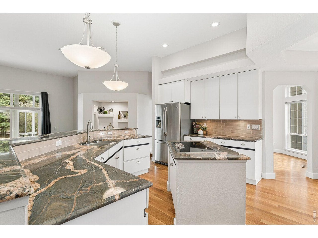 SLEEK SERENITY MOMENTS FROM JORDAN CREEK. Step into this modern beauty to experience the cascade of natural light flowing through a massive wall of windows, w/stunning views rarely found near so many comforts. Top to bottom slate tile encases the gas linear fireplace, highlighting soaring ceilings, clean lines, and incredible open span of the living room. The expansive marble island is perfect for hosting and the custom cabinetry, bespoke backsplash, and stainless hood provide a contemporary aesthetic sure to please any chef, and the generous pantry, 5 burner top, ice maker, and wine fridge provide function they deserve. Large dining area leads to private office suite, equipped with private bath. Step into the primary ensuite for breathtaking views, walk in tile shower, spacious boutique closet, and deck access. Lower level walkout fts 2-tiered wetbar, 4 bdrms, 2 addl bathrooms and large great room, incredible for those that love to host. Out back youll find a 20x40 heated pool with inlay stone surround LED lit retaining wall for a soft glow in the night. Epoxied 3 bay garage, irrigation, and fenced yard. Waukee schools, moments from shopping, restaurants, and more!