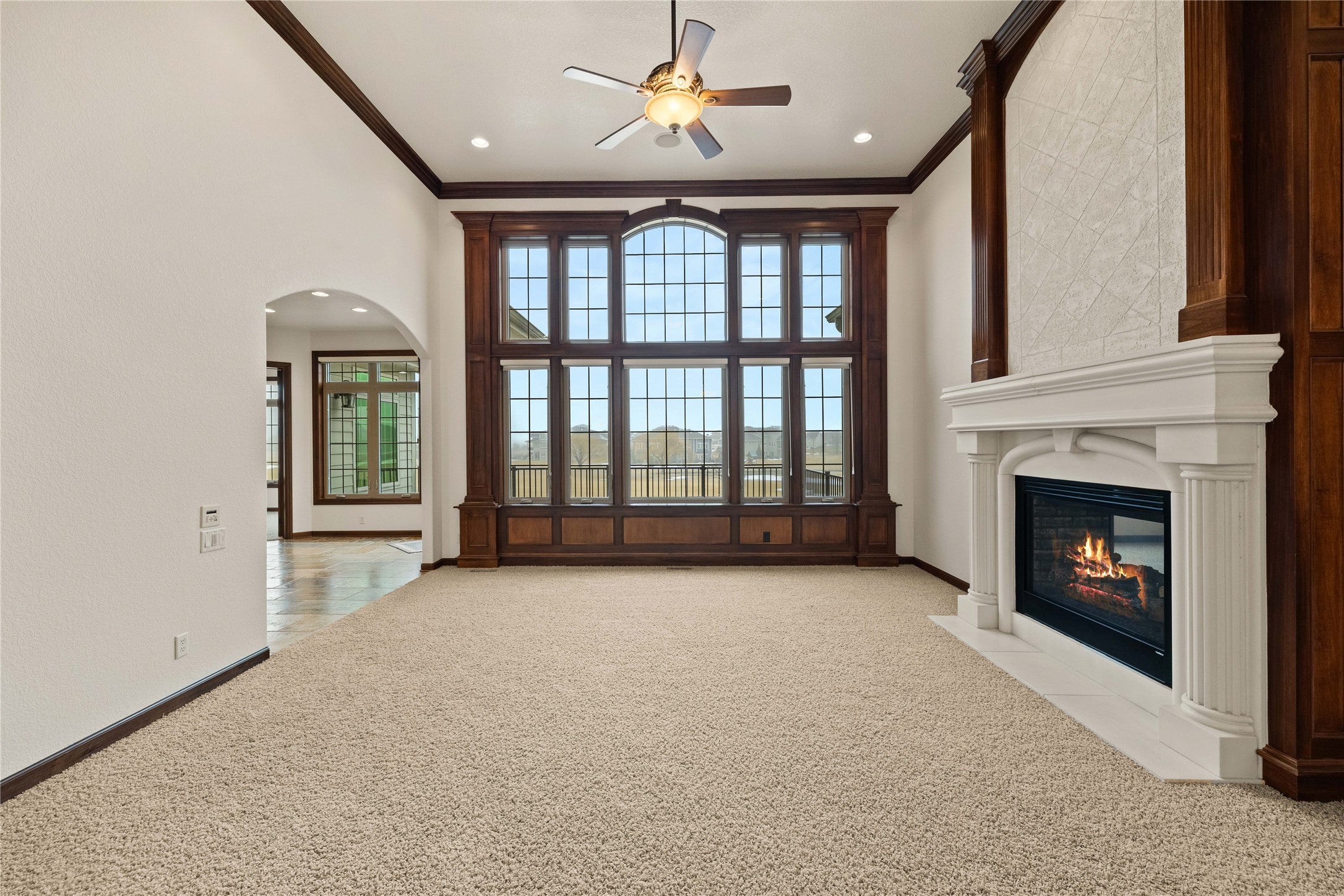 Executive Kimberley resale backing Otter Creek Golf Course on over half an acre with just under 5,000 total sq ft. The home features a dramatic living room with soaring 17-foot ceilings, a formal dining area, and a beautifully appointed kitchen with rich wood cabinetry, granite countertops, a large center island, tile flooring, and high-end stainless appliances.