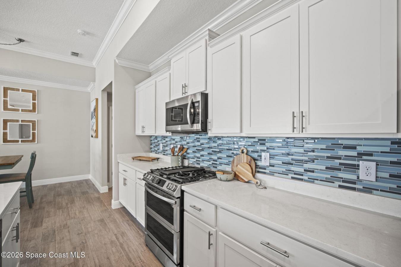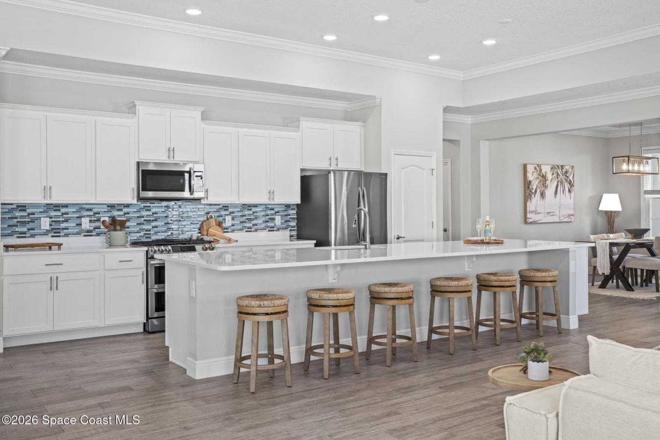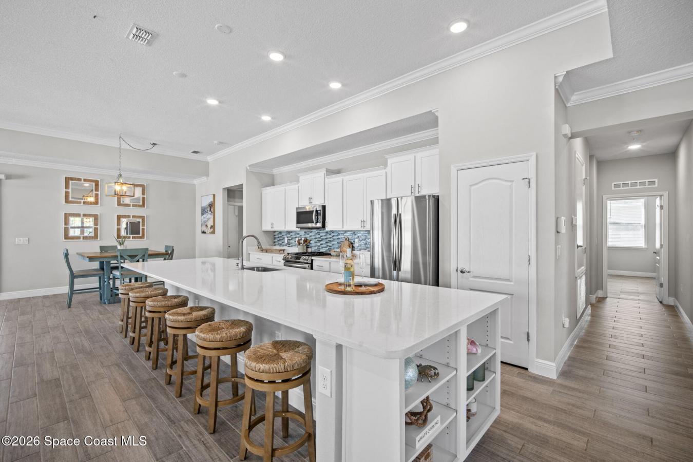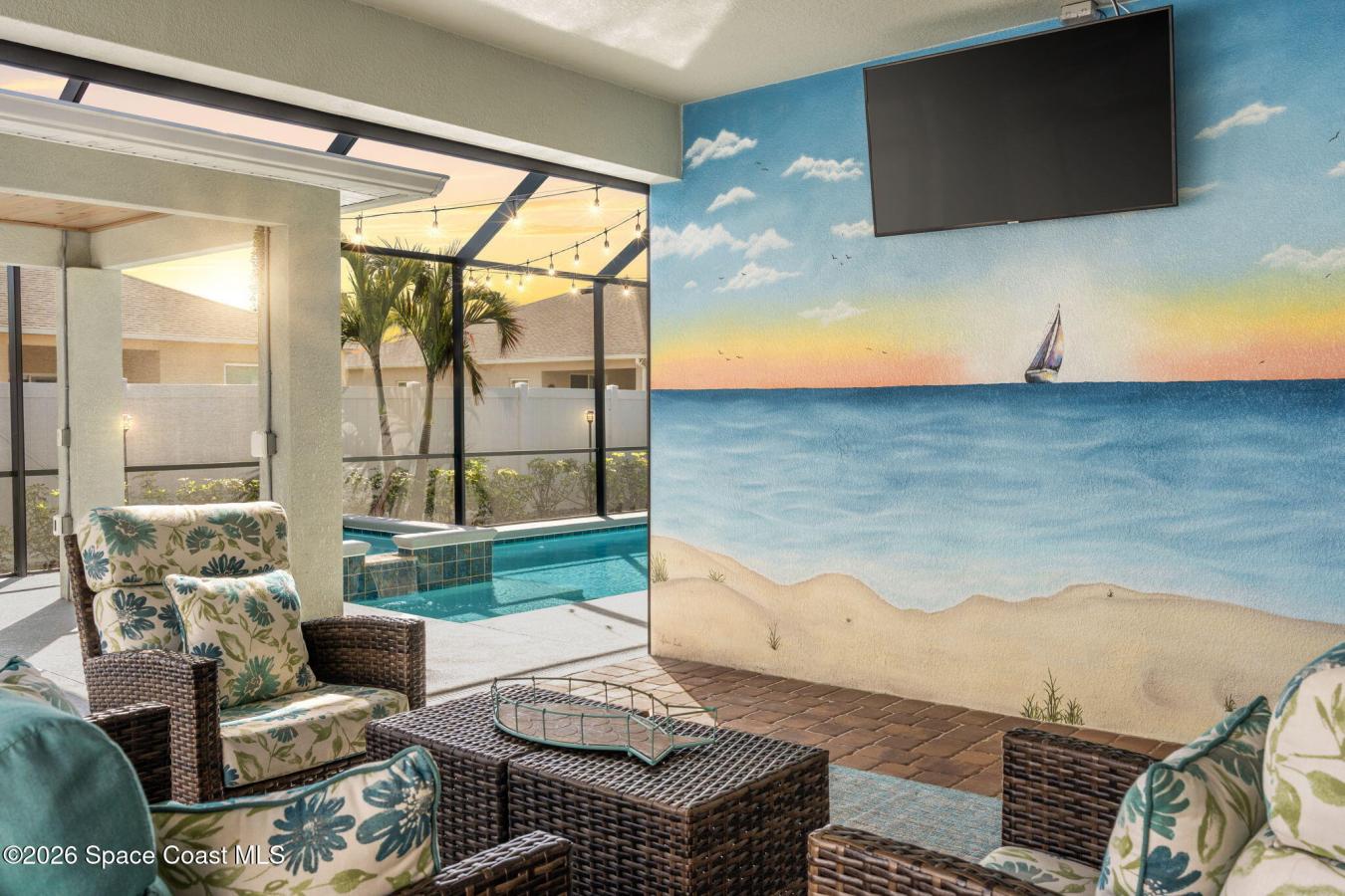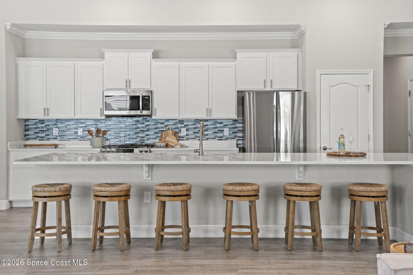 Step into the Space Coast lifestyle youve been dreaming of in N Merritt Island! Offering just over 3,000, 4BR, 3BA Office & 3 Car Garage. Soaring 12 ceilings with tray accents, crown molding throughout & a bright open floor plan. Chefs Kitchen features quartz counters, 42 solid wood cabinets, custom backsplash, Energy Star SS appliances, a wine fridge, and an oversized 14 island for everyday living & entertaining. Wired for Whole Home Audio/Video, Smart Garage Opener & Gas Tankless WH. Primary Suite offers a massive walk-in CA closet & spa-style bath w/ dual sinks, quartz counters, & walk-in shower w/ dual shower heads. Backyard retreat that lives like a private resort, with a screened-in, gas-heated pool and spa, custom CBS gazebo, & Kevlar hurricane retractable screens and a Key West-style mural in the patio area so it feels like your own beach escape. Impact Windows Storm Shutters for peace of mind. Approx. 10 min to KSC, 20 min to Cocoa Beach & 40 min to MCO.