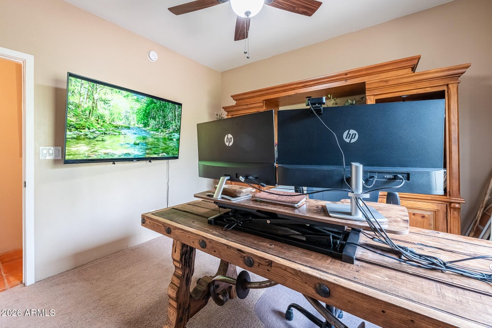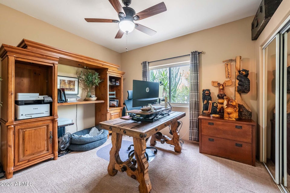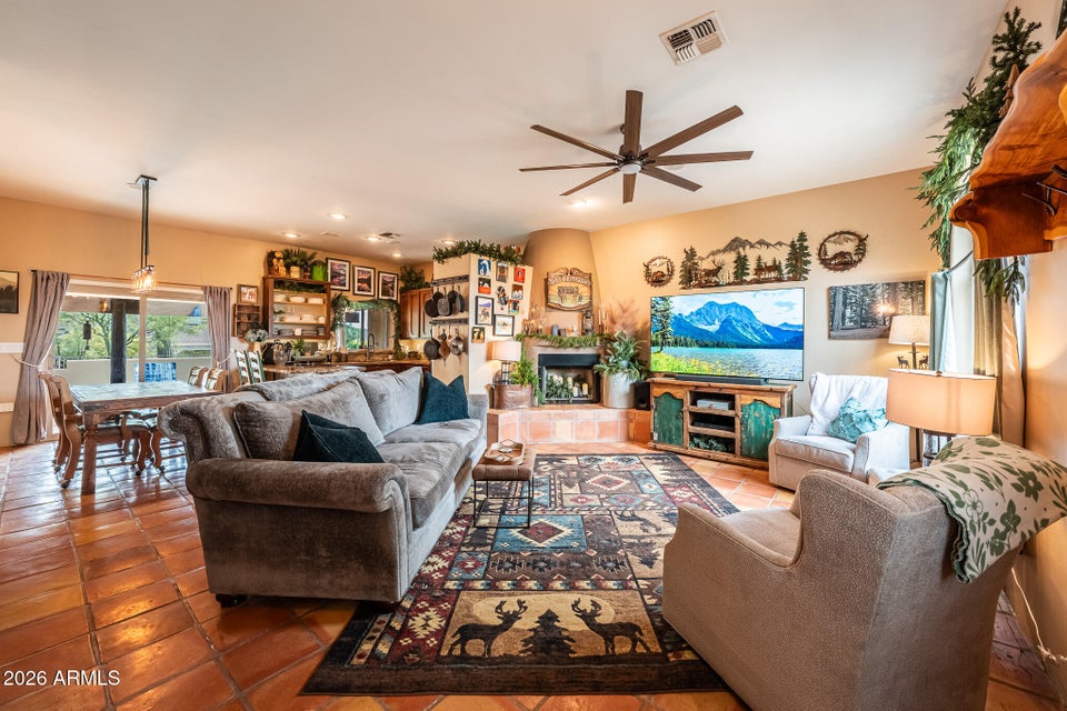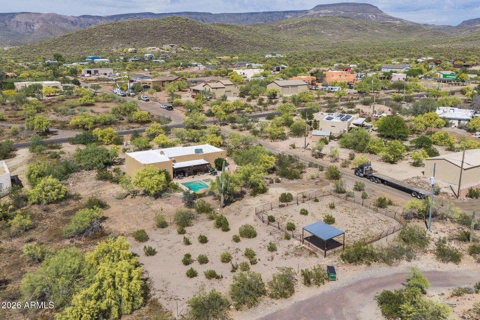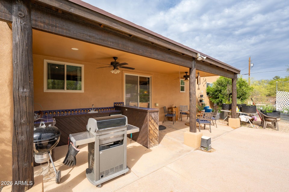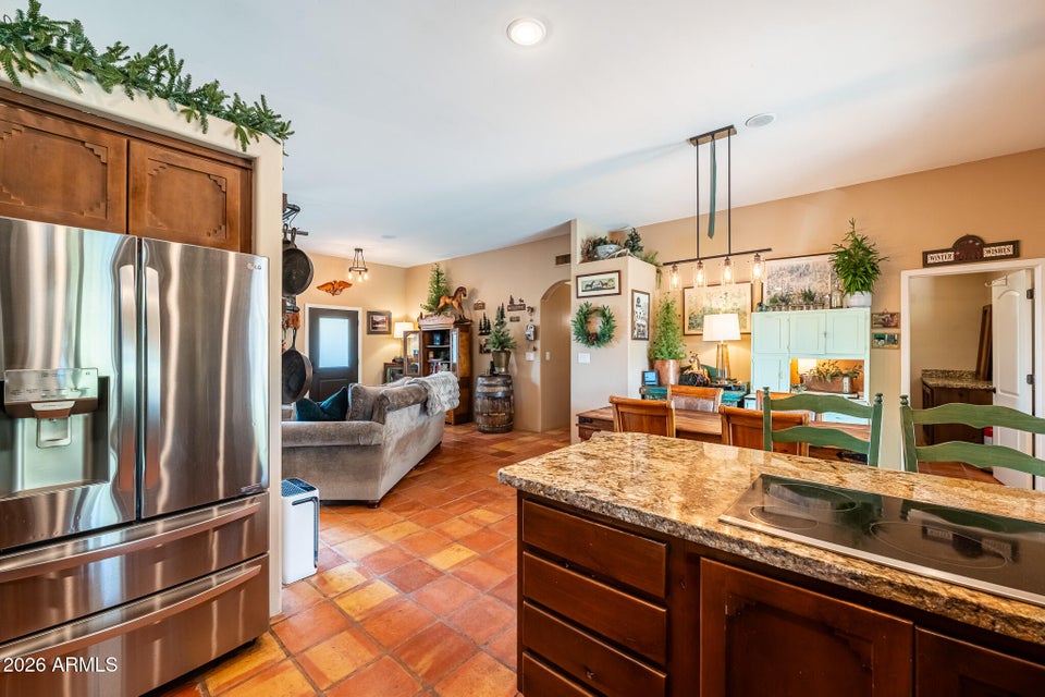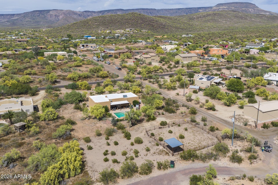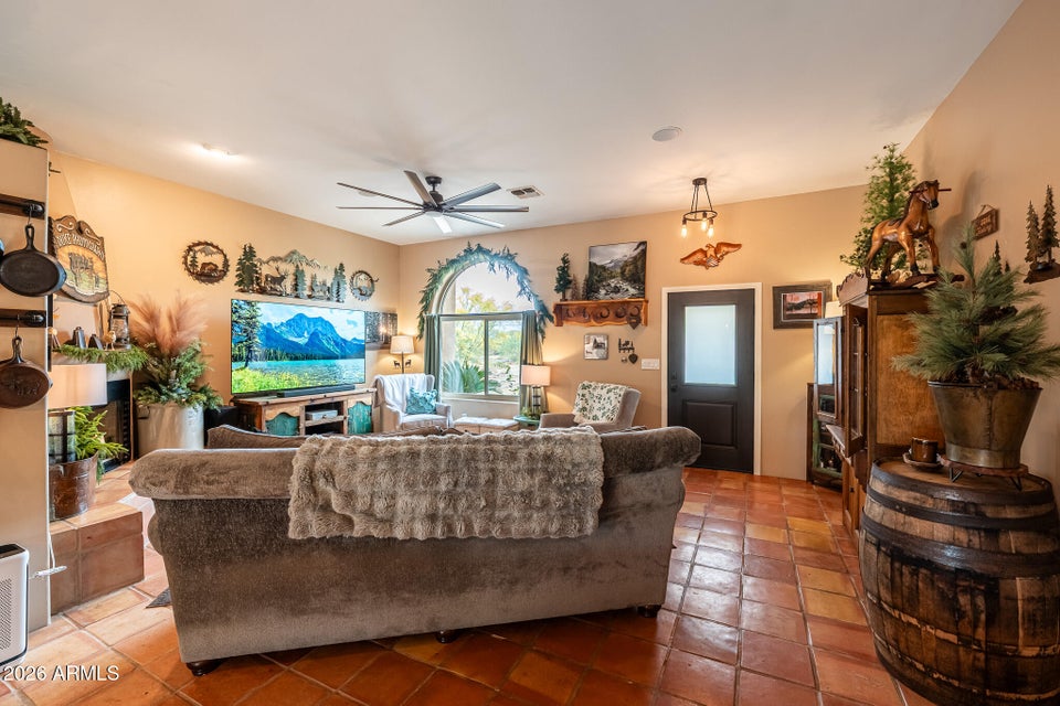 Experience the perfect blend of Arizona lifestyle, privacy, and functionality with this beautifully maintained 4-bedroom, 2-bath custom home situated on 1.06 acres in one of the most desirable areas of New River--on the east side of Circle Mountain, known for its exceptional aquifer and clean, great-tasting water. From the moment you arrive, youre welcomed by a charming front sitting area with a tranquil koi pond, setting the tone for what truly feels like a private retreat reminiscent of a high-end bed and breakfast. Inside, the home features 10-foot ceilings, Saltillo tile flooring throughout with new luxury vinyl plank flooring in owners suit , granite countertops, GE Profile appliances, and a stunning travertine backsplash. The inviting living room showcases a beautifulfireplace, creating warmth and character. Major upgrades provide peace of mind, including all new dual-pane, low-E windows and sliding glass door (2022), new front door and casing (2023), water heater (2023), new roof (2026), complete exterior paint and wood staining (2025), and all Viga poles were replaced (2026). Additional improvements include a newer AC , garage door opener, and updated pool equipment (approx. 5 years).The outdoor living space is designed for true Arizona enjoyment, featuring a resort-style pool and spa, outdoor kitchen and barbecue area, covered patio, and multiple areas to relax and take in the breathtaking mountain views and unforgettable sunsets. The property has a turn out area, and plenty of room to build a mare motel or more for horse enthusiasts with access to endless riding, hiking, and biking trails throughout the New River mountain range, with views of Pyramid Peak, Table Mountain, and beyond. The grounds also include mature lemon and pomegranate trees and a dedicated gardening area, adding to the propertys charm and sustainability. A rare opportunity to own a true desert sanctuary where comfort, character, and wide-open living come together--this is more than a home, its a lifestyle.
