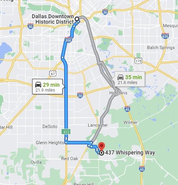 From I-35 go East on Ovilla Road and make a left onto Pratt Road. Turn right onto Hidden Creek and then left onto Whispering Way. The house will be on the left.