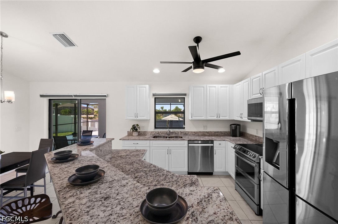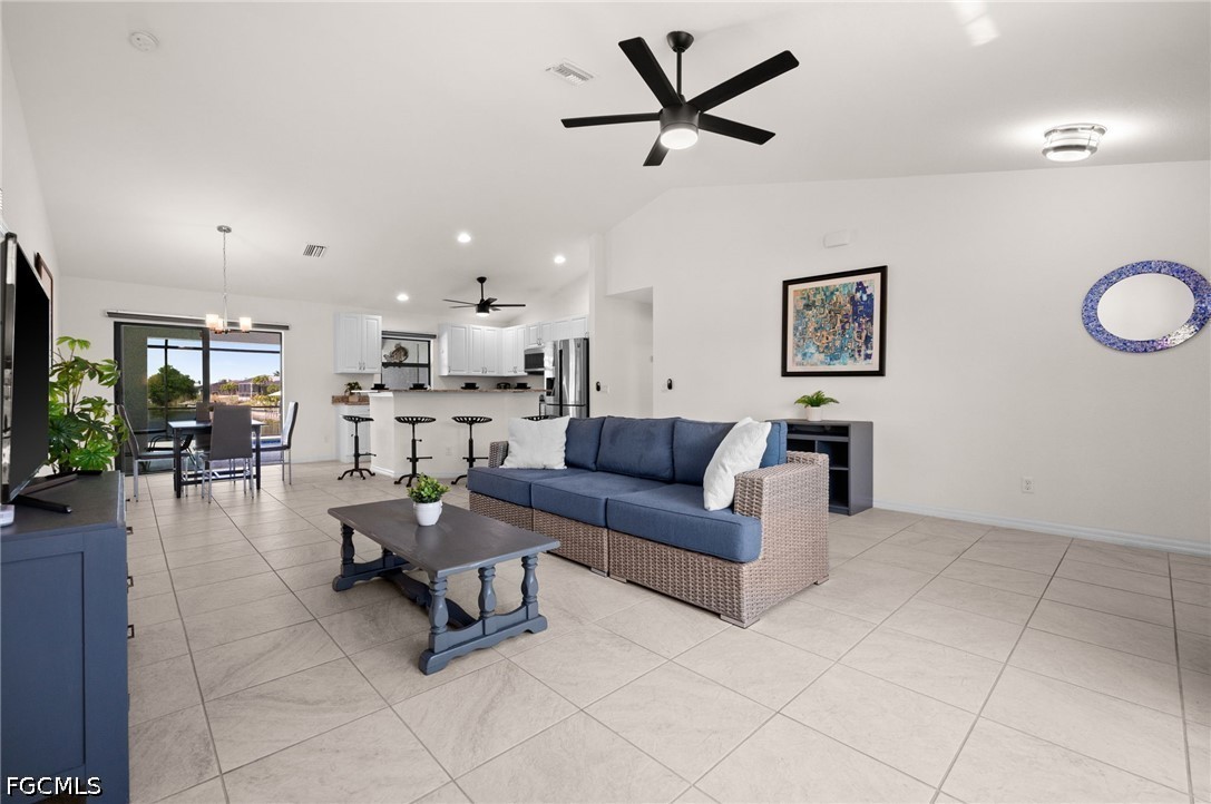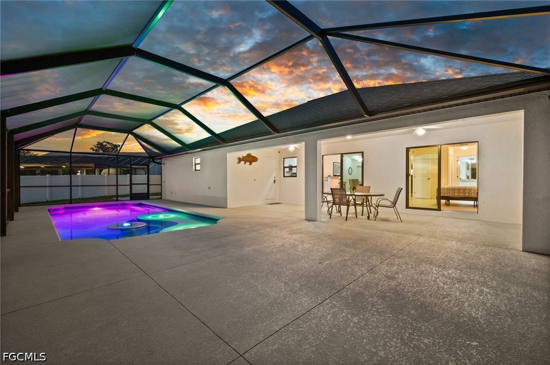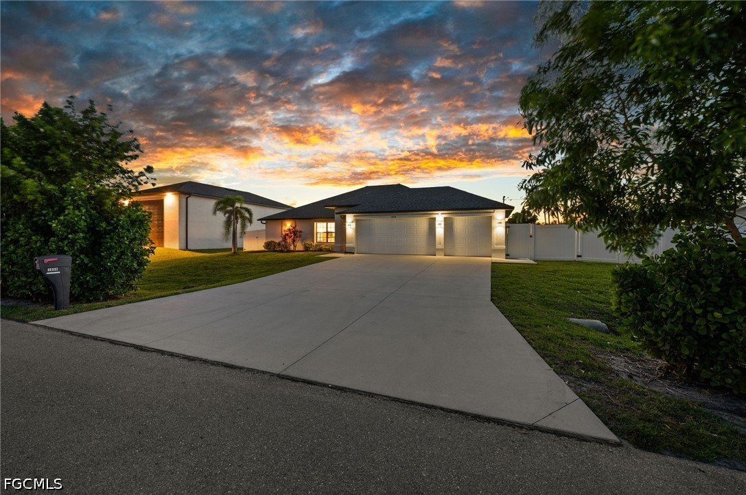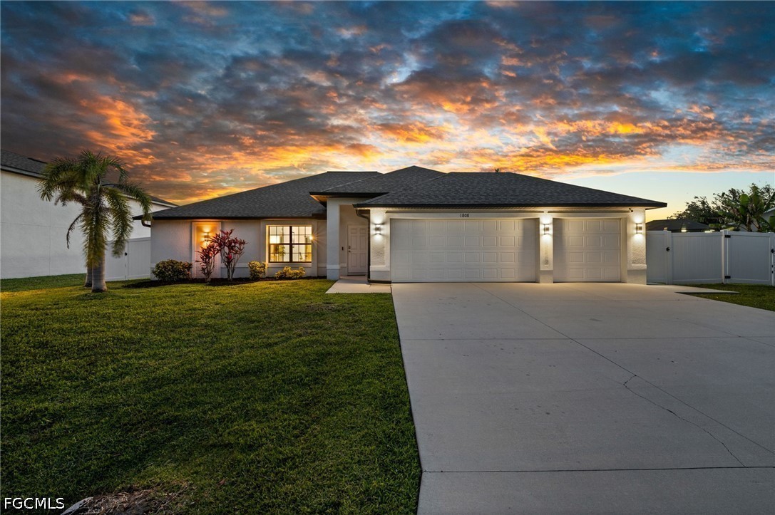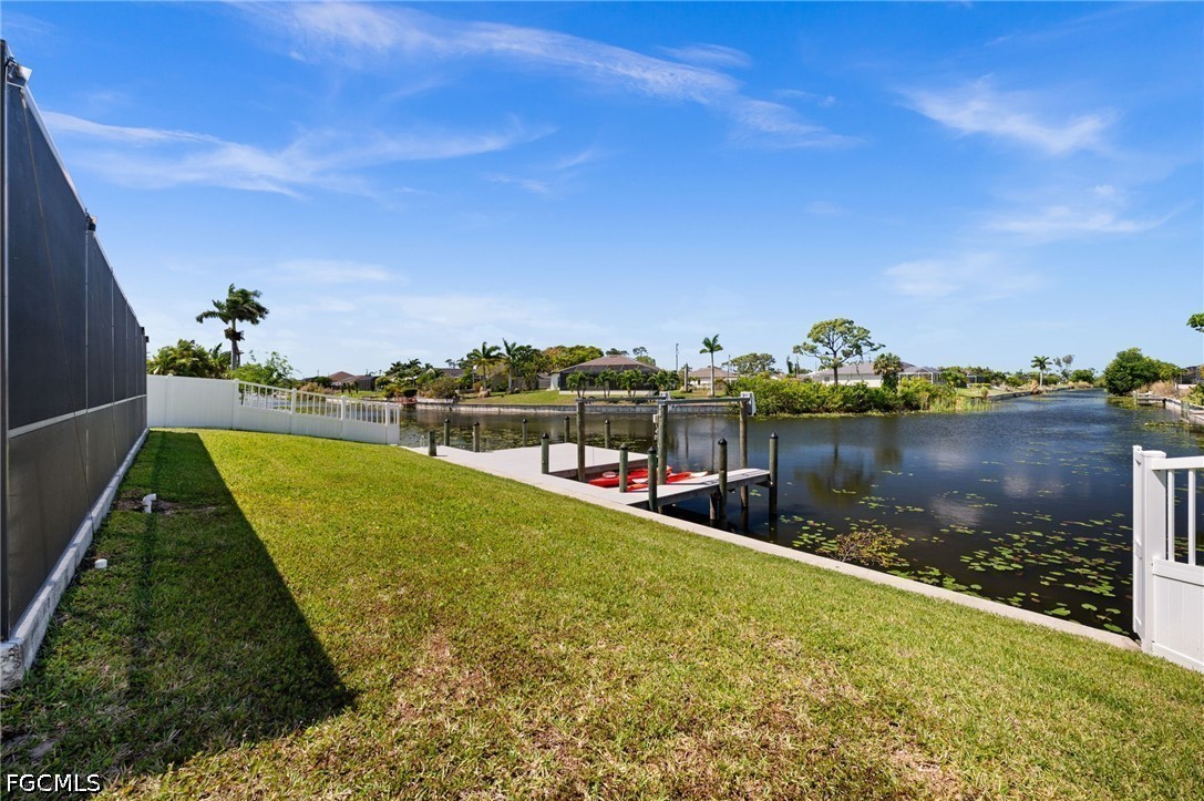 LONG WESTERN CANAL VIEWS on an INTERSECTING CANAL! 2020 BUILT HOME with CUSTOM, HEATED SALTWATER POOL, DOCK WITH BOAT LIFT, AIR-CONDITIONED 3-CAR GARAGE, and OVERSIZED LOT. Welcome to 1808 SW 8th Pl, a 4 BEDROOM, 2 bath waterfront home BUILT IN 2020 offering 1,718 sq ft of living space on a beautiful INTERSECTING FRESHWATER CANAL with spectacular long water views. Situated on an oversized lot of more than a quarter acre, this property offers an uncommon amount of outdoor space along with privacy created by a fully FENCED YARD and lush landscaping in front. WESTERN EXPOSURE provides incredible sunset views down the canal every evening. The outdoor living area is designed to take full advantage of the waterfront setting. The large SCREENED LANAI features a CUSTOM, HEATED SALTWATER POOL built in 2022 with a unique swim-up table, integrated umbrella stand, water features and tanning shelf, all overlooking the water views. The pool system is SMARTPHONE APP CONTROLLED, allowing you to easily manage heating, lighting, and pool features from anywhere. Just beyond the pool, the property includes a 40 x 20 DOCK WITH BOAT LIFT installed in 2022, offering excellent freshwater fishing for Peacock and Largemouth bass or easy access for kayaking and cruising the canal system. Inside, the home features tile flooring throughout, high ceilings, and an open split-bedroom floor plan. The kitchen offers granite countertops, stainless steel appliances, an island with breakfast bar, and a great view down the canal. The adjacent dining area includes sliding glass doors that open directly to the lanai and pool area, making indoor-outdoor living easy. The spacious primary suite enjoys water views and direct lanai access through sliding glass doors, along with two walk-in closets and an en-suite bath with dual sinks and a tiled shower. On the opposite side of the home, the 3 ADDITIONAL GUEST BEDROOMS are arranged for privacy, with 2 ADJOINING ROOMS that work well for guests or families. The guest bathroom also functions as a convenient POOL BATH. Additional features include a 3 CAR GARAGE WITH MINI-SPLIT A/C (2021), laundry room with washer and dryer, and a large FENCED SIDE YARD that provides excellent space for storage, equipment, or additional outdoor use. The home also includes SMART HOME FEATURES, with app-controlled pool equipment, smart door locks, and smart lighting that allow convenient control and monitoring from your phone. The pool and lanai were added in 2022, the dock and lift in 2022, and the fence in 2021. Located in the heart of SW Cape Coral, this home offers easy access to shopping, dining, schools, and parks while enjoying one of the best long canal views in the area. The property is NOT IN A FLOOD ZONE AND HAS NOT FLOODED IN ANY HURRICANE.