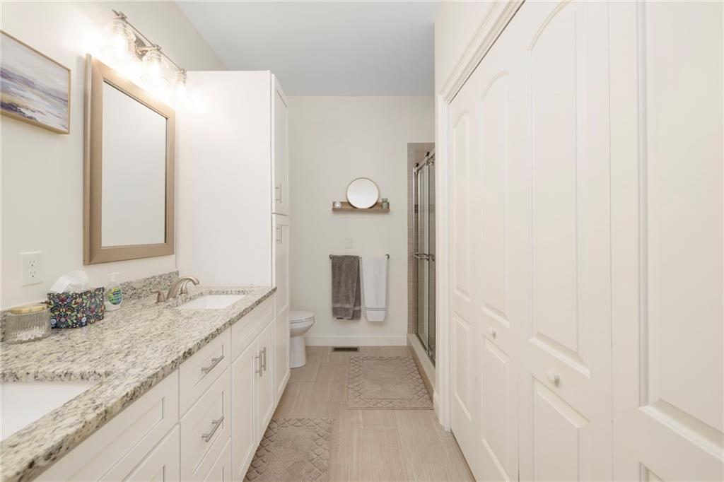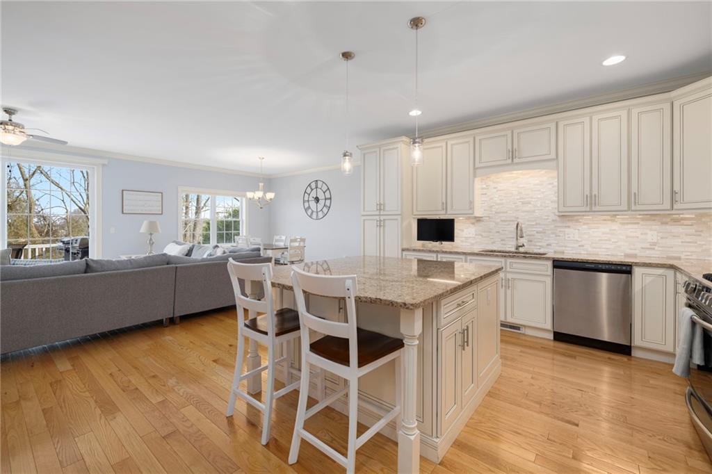 Welcome to this stunning one-level living condo, nestled on a private, dead-end cul-de-sac. The home offers incredible curb appeal with a brick entryway, double-car garage, and beautifully manicured grounds. Step inside to gleaming hardwood floors, soaring 9-foot ceilings, and a thoughtfully designed layout made for easy living. The main level offers everything you need, including a luxurious primary suite with a walk-in closet and a full bath featuring a double vanity and stand-up shower. A second bedroom also includes its own walk-in closet and connects to a full bathroom. Convenient main-level laundry, located in the primary suite, makes everyday living effortless. The open-concept kitchen, dining, and living area is the heart of the home, showcasing granite countertops, modern lighting, and a gas fireplace. Oversized sliding doors lead to a Trex deck with elevated, peaceful views—perfect for quiet mornings or relaxing evenings. Upstairs offers additional flexibility with a bonus room and a third bedroom. The walk-out basement provides excellent potential for future finishing while still offering plenty of storage space. Ideally located in central Rhode Island with easy highway access, commuting anywhere in the state is simple and convenient. Additional highlights include a Navien energy-efficient heating and hot water system, a security system, and a generator hookup—offering comfort, efficiency, and peace of mind.