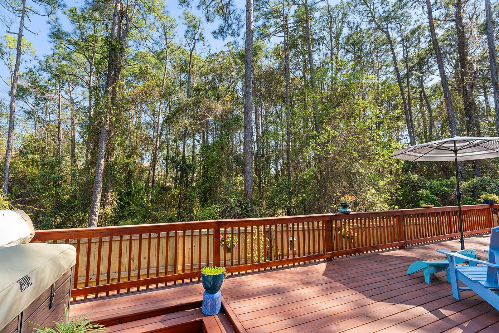 Downsize the Right Way! This very popular home offers stunning wooded views, flexible open-plan living, and a spacious primary suite...all tucked away on a quiet cul-de-sac. Enjoy outdoor living on the 24 x 14 covered deck featuring electric service, grill area, stairs leading to a fenced backyard with prolific flowering plants and a stamped concrete patio.