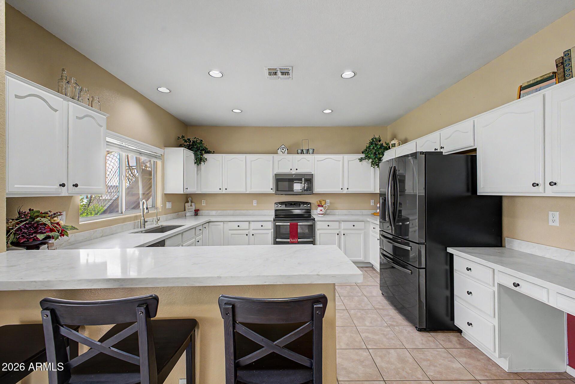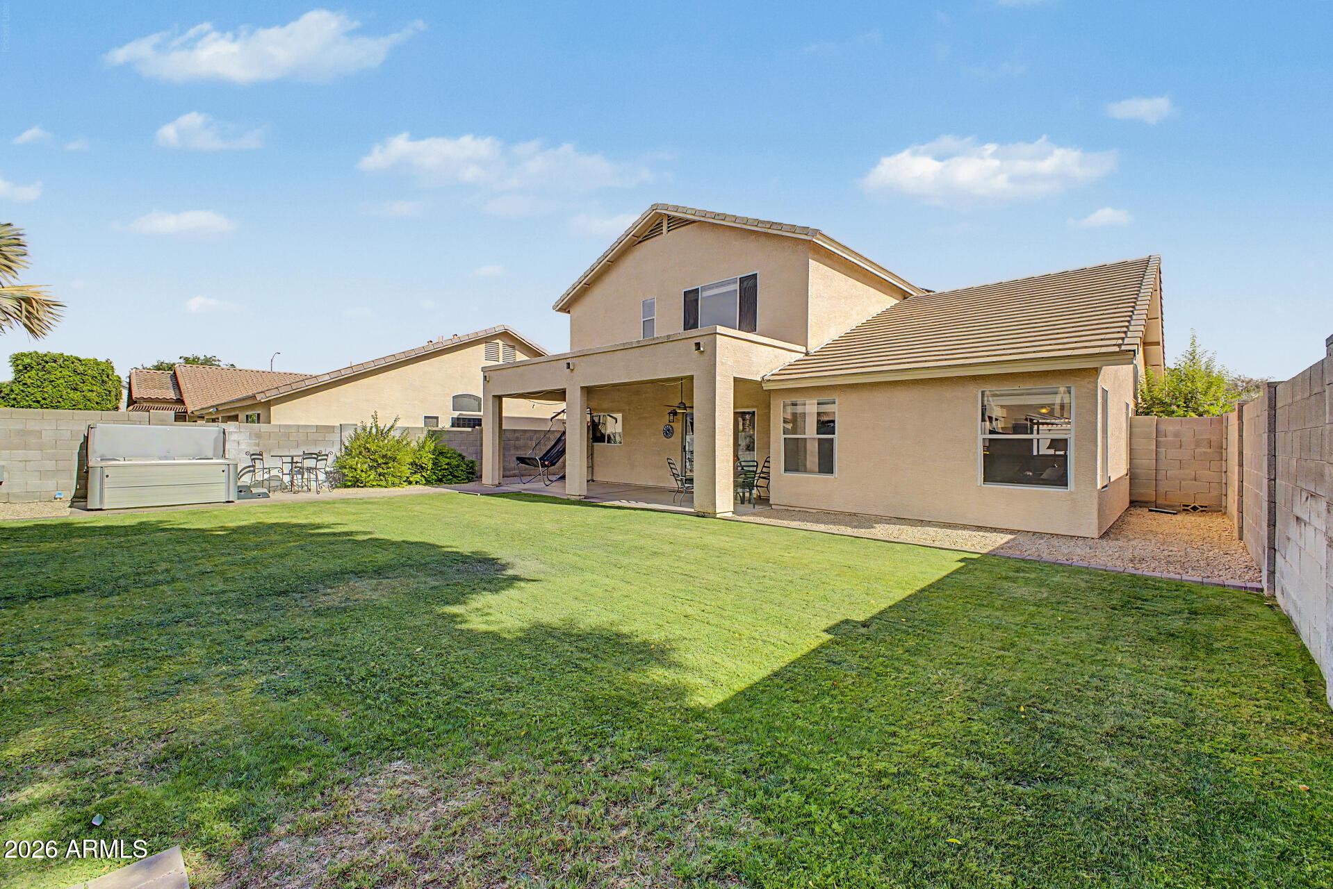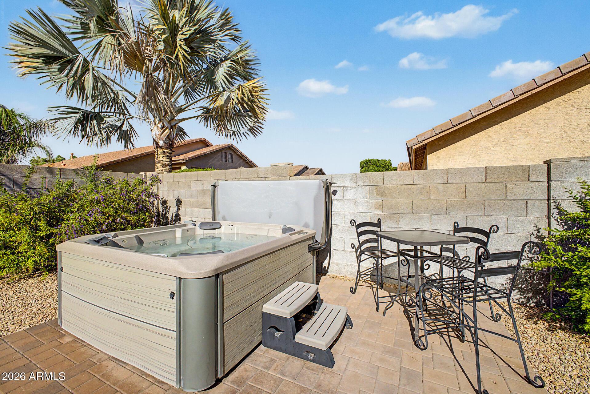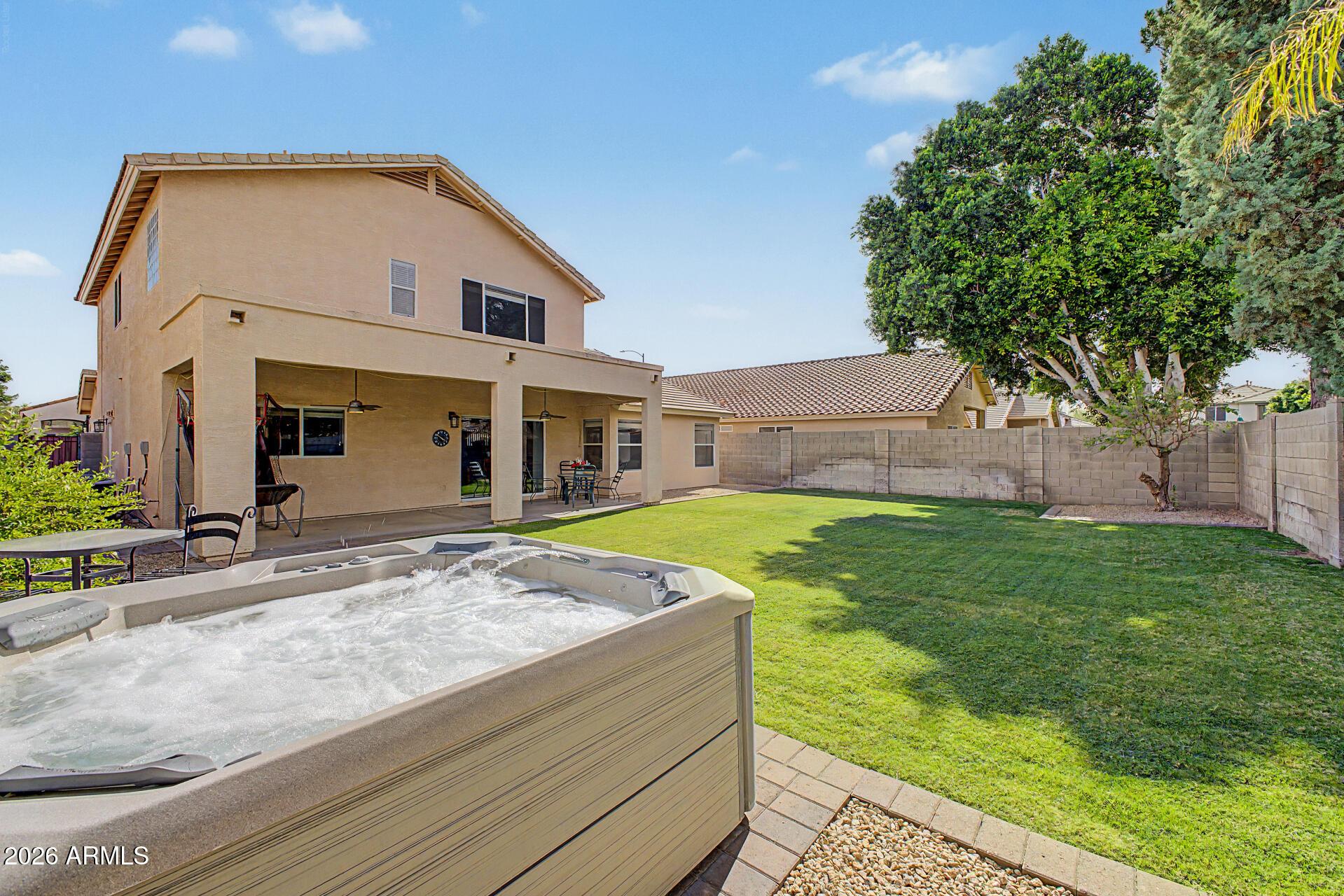 Original owners who meticulously maintained & upgraded house.Owned solar panels, saving hundreds of dollars per month on electricity.Upstairs bathrooms redone with easy to clean tub/shower and master walk in shower. New granite countertops, sinks, hardware, and painted cabinet vanities.Large kitchen with many cabinets, drawers, & counter space. Raised eat-in bar. Large pantry with additional shelves put in for storage.Kitchen cabinets painted and new quartz countertops. Large single bowl stainless steel sink, new refrigerator and washer/dryer convey.New fans and fixtures throughout house, including the back patio w/mister system.New salt water, hot water tank, & reverse osmosis. Gas line to dryer is included. Backyard newly redesigned with pavers, lush bushes, green grass & saltwater spa.Large 3 car garage with cabinets for storage.Low traffic street with New River walking path at the end, Rated A schools.