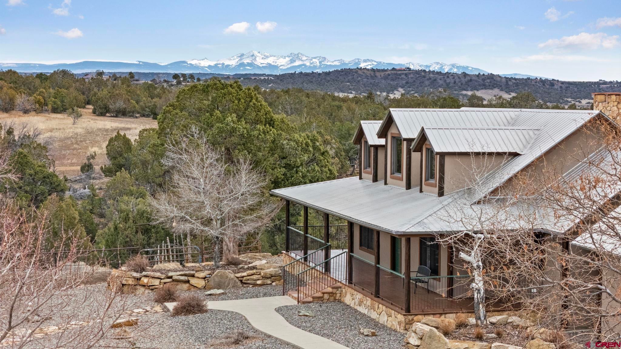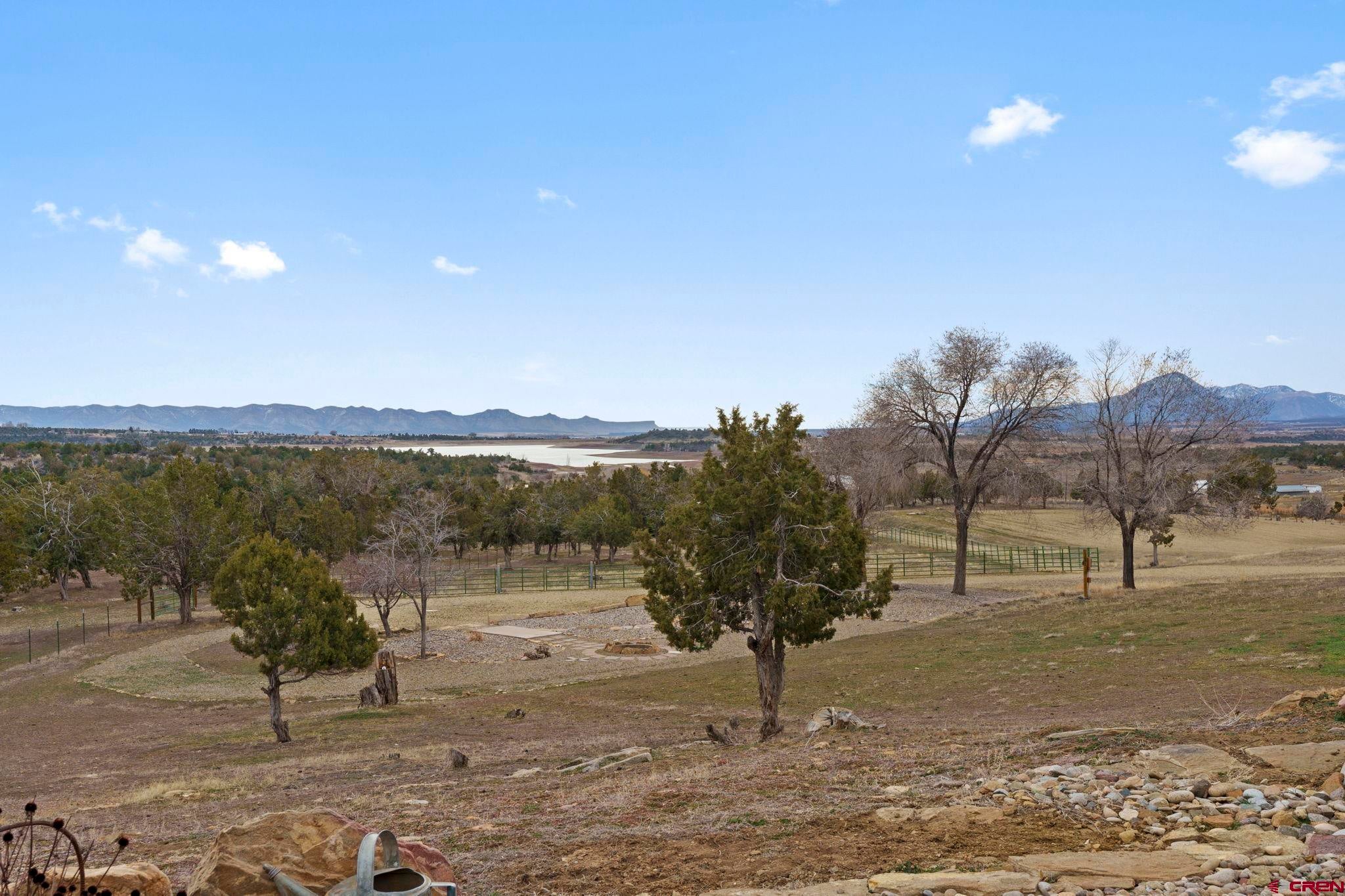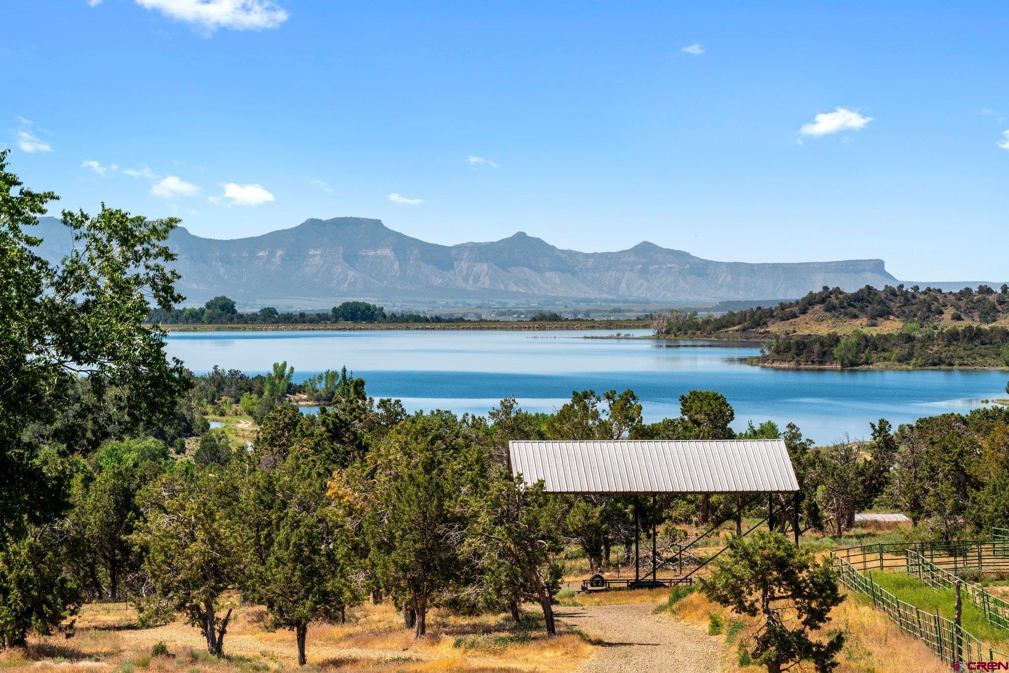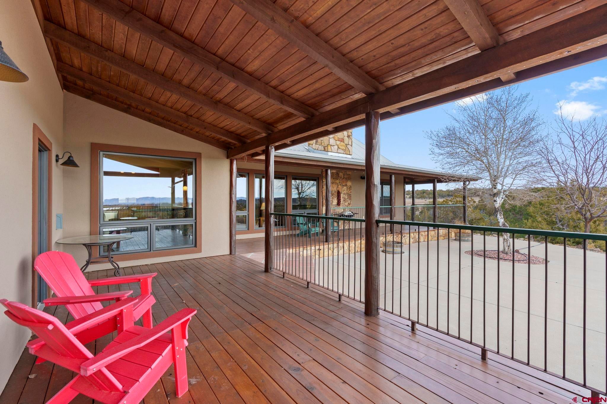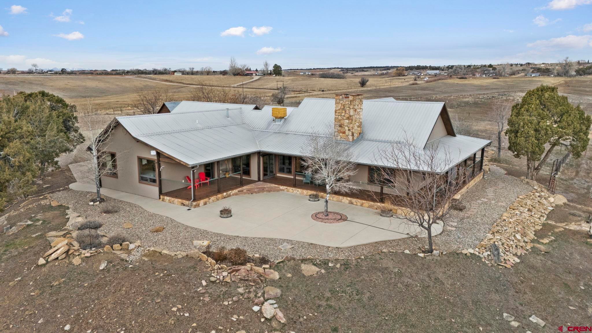 Colorado ranchers paradise on 172 breathtaking acres overlooking Narraguinnep Reservoir. This custom-built, recently updated single-level home offers 3 bedrooms, 2 baths, and 2,733 square feet of refined mountain living. Framed by Mesa Verde, Sleeping Ute, and the La Plata Mountains, the property delivers exceptional privacy, valuable water features, functional ranch infrastructure, and borders 897 acres of public land. A 1,385-square-foot wraparound deck embraces much of the homean ideal setting for sunrise coffee and unforgettable Southwest sunsets. Inside, rustic elegance defines the open living room with reclaimed barn wood floors, exposed Douglas fir beams, soaring cathedral ceilings, and a dramatic moss rock fireplace with pellet stove insert. Expansive windows capture panoramic mountain views. The gourmet kitchen features stainless steel appliances, new granite countertops, updated tile and cabinetry, a walk-in pantry, an island with prep sink, and a generous laundry/mudroom designed for everyday ranch life. The primary suite is privately positioned apart from two additional bedrooms and a full bath, providing ideal separation for family or guests. Both the primary bedroom and the charming dining nook open directly to the covered back porch for effortless indoor-outdoor living. Recent improvements include remodeled bathrooms, fresh interior paint, new wood flooring in the bedrooms, new carpet, a new garage door, and updated stucco siding with exterior stain. Ranch amenities include a livestock shelter and holding pen, large hay barn, workshop, fenced and cross-fenced pastures, two ponds, a year-round live spring, improved internal road system, designated riding arena site with panels included (not installed), and a full RV pad with hookups or potential space for future guest quarters. Rolling meadows dotted with pion, juniper, and cedar complete this extraordinary propertyrich with wildlife and classic Southwest Colorado beauty.