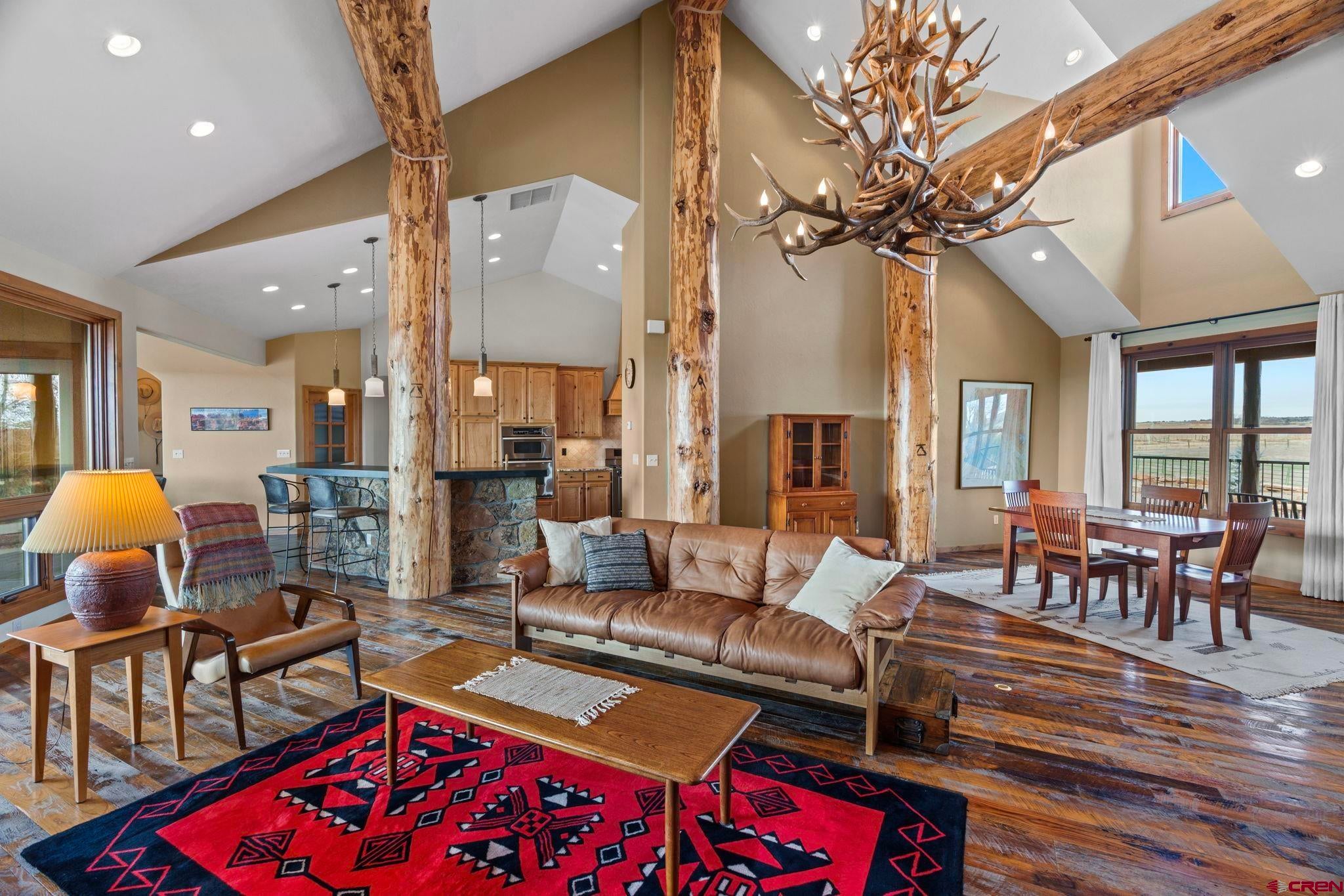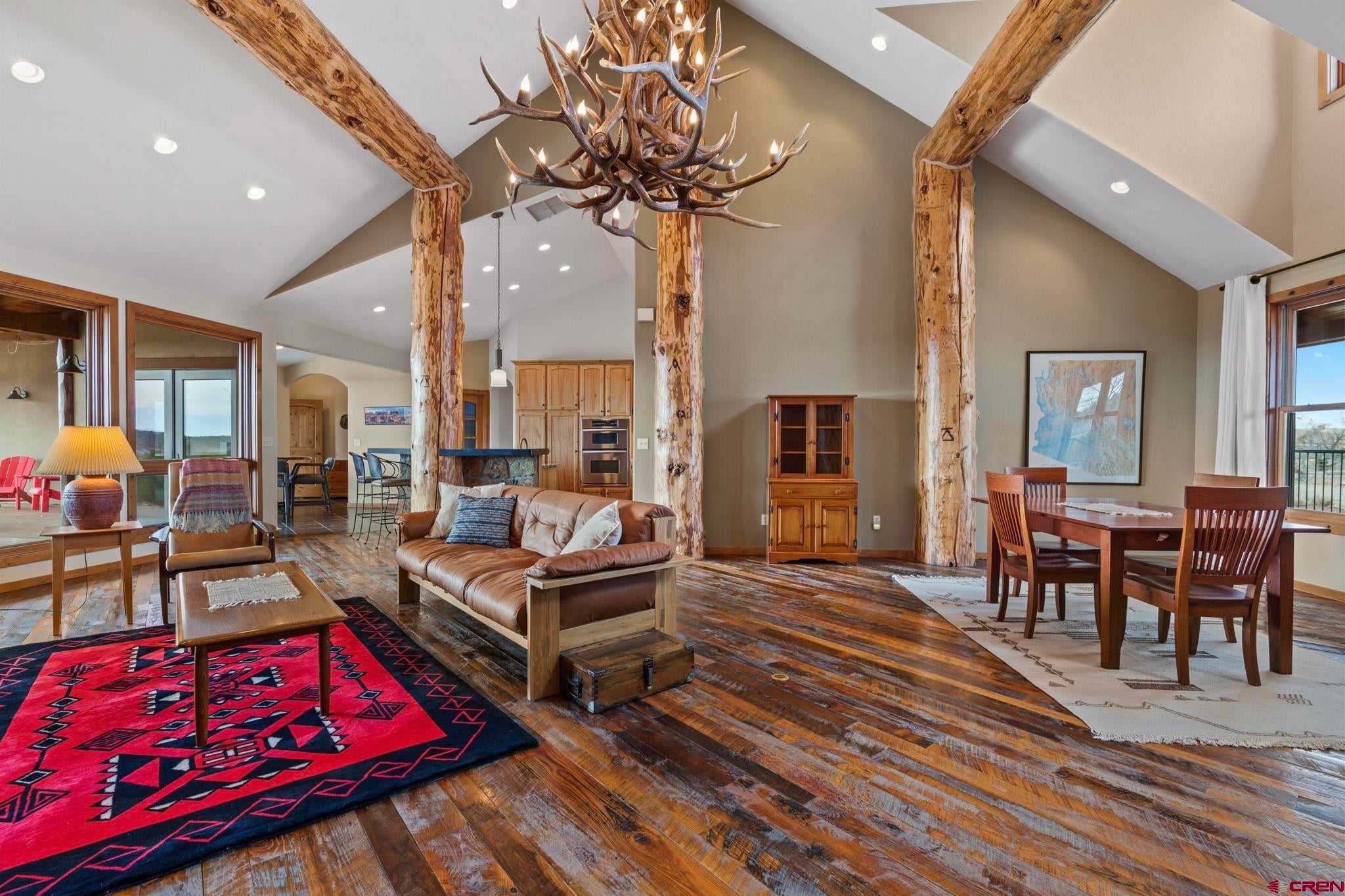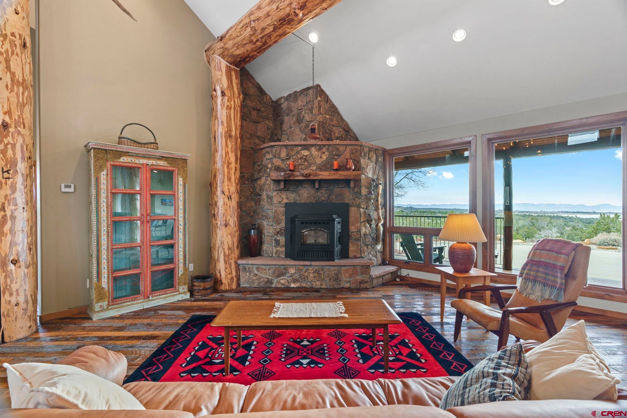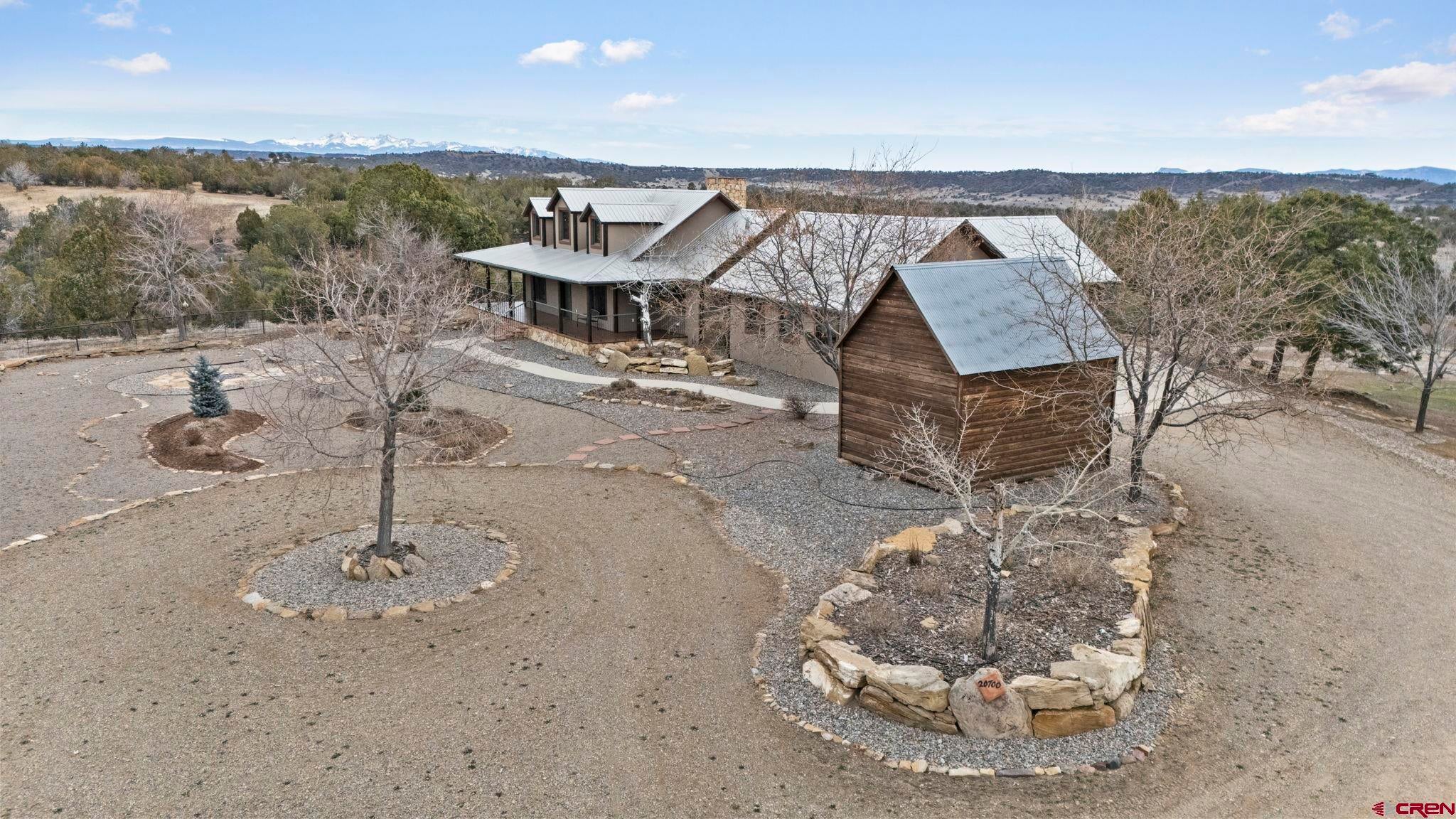 Colorado ranchers paradise on 172 breathtaking acres overlooking Narraguinnep Reservoir. This custom-built, recently updated single-level home offers 3 bedrooms, 2 baths, and 2,733 square feet of refined mountain living. Framed by Mesa Verde, Sleeping Ute, and the La Plata Mountains, the property delivers exceptional privacy, valuable water features, functional ranch infrastructure, and borders 897 acres of public land. A 1,385-square-foot wraparound deck embraces much of the homean ideal setting for sunrise coffee and unforgettable Southwest sunsets. Inside, rustic elegance defines the open living room with reclaimed barn wood floors, exposed Douglas fir beams, soaring cathedral ceilings, and a dramatic moss rock fireplace with pellet stove insert. Expansive windows capture panoramic mountain views. The gourmet kitchen features stainless steel appliances, new granite countertops, updated tile and cabinetry, a walk-in pantry, an island with prep sink, and a generous laundry/mudroom designed for everyday ranch life. The primary suite is privately positioned apart from two additional bedrooms and a full bath, providing ideal separation for family or guests. Both the primary bedroom and the charming dining nook open directly to the covered back porch for effortless indoor-outdoor living. Recent improvements include remodeled bathrooms, fresh interior paint, new wood flooring in the bedrooms, new carpet, a new garage door, and updated stucco siding with exterior stain. Ranch amenities include a livestock shelter and holding pen, large hay barn, workshop, fenced and cross-fenced pastures, two ponds, a year-round live spring, improved internal road system, designated riding arena site with panels included (not installed), and a full RV pad with hookups or potential space for future guest quarters. Rolling meadows dotted with pion, juniper, and cedar complete this extraordinary propertyrich with wildlife and classic Southwest Colorado beauty.
