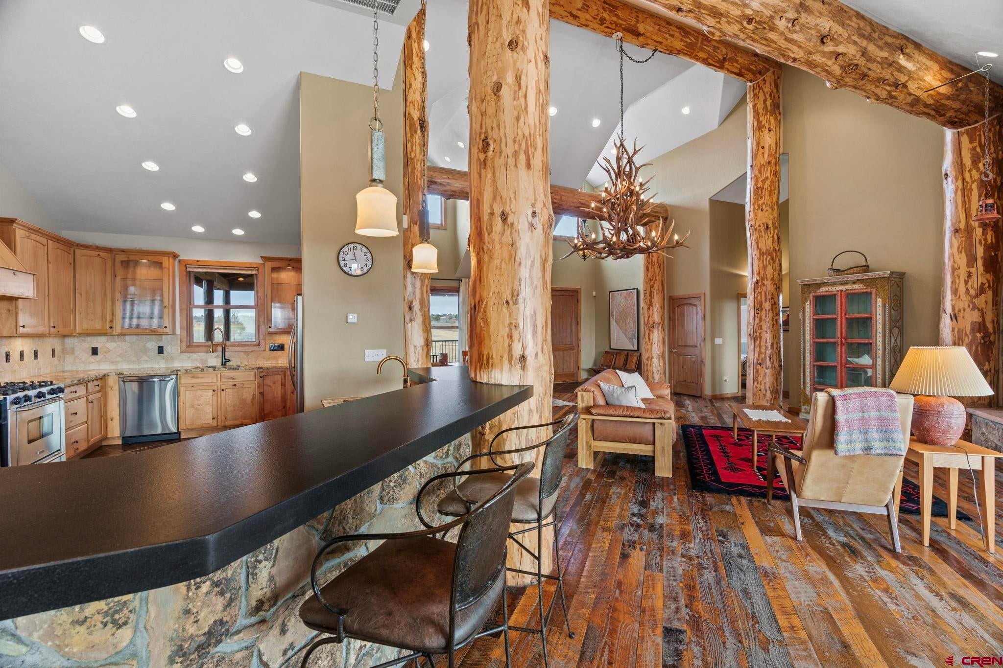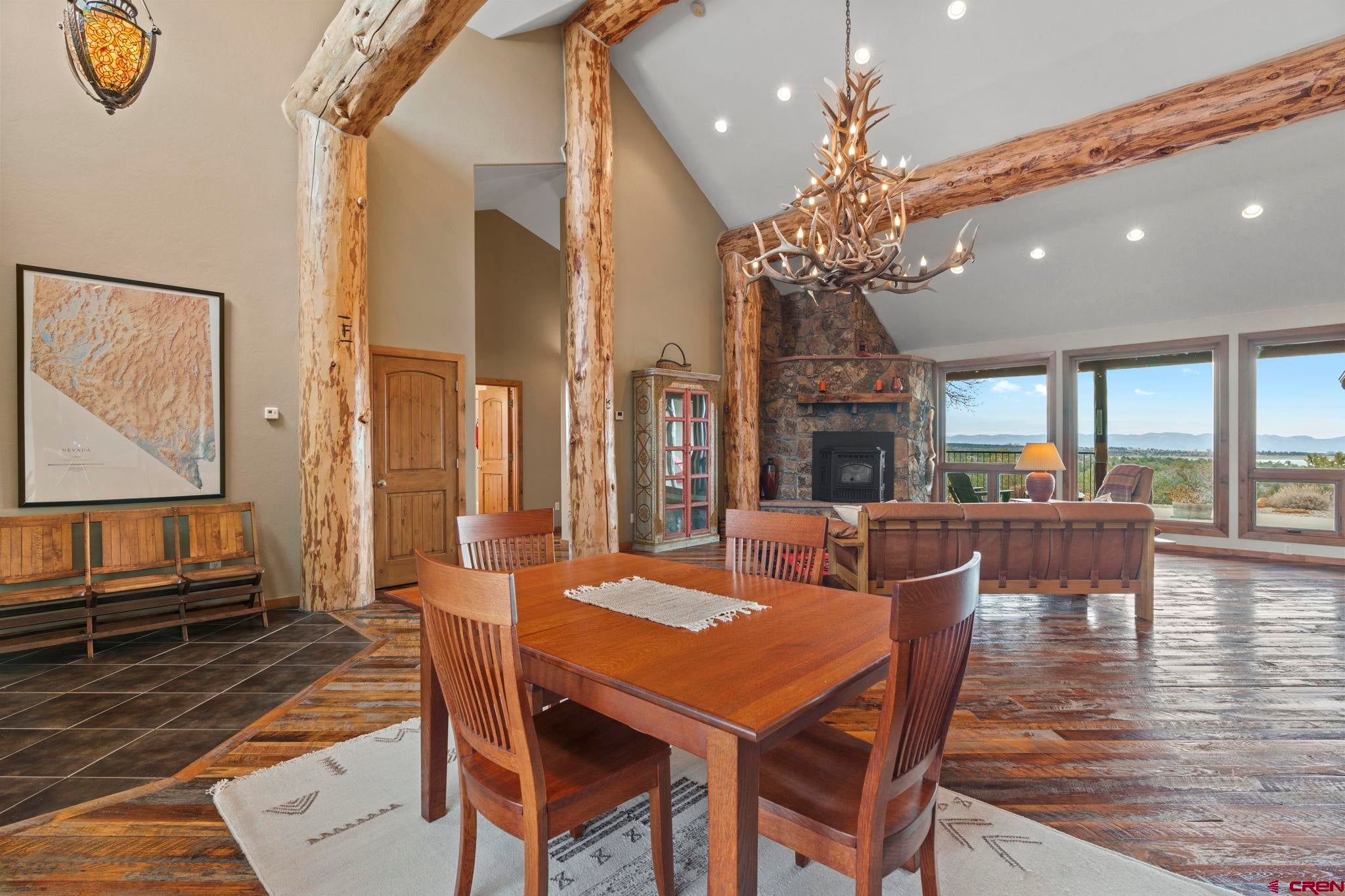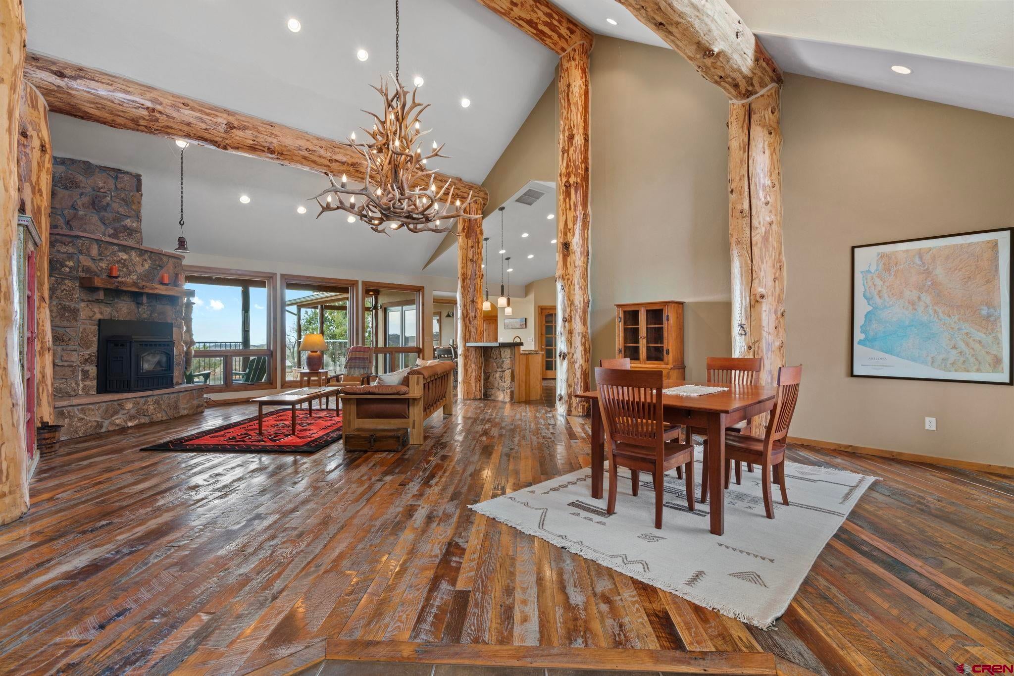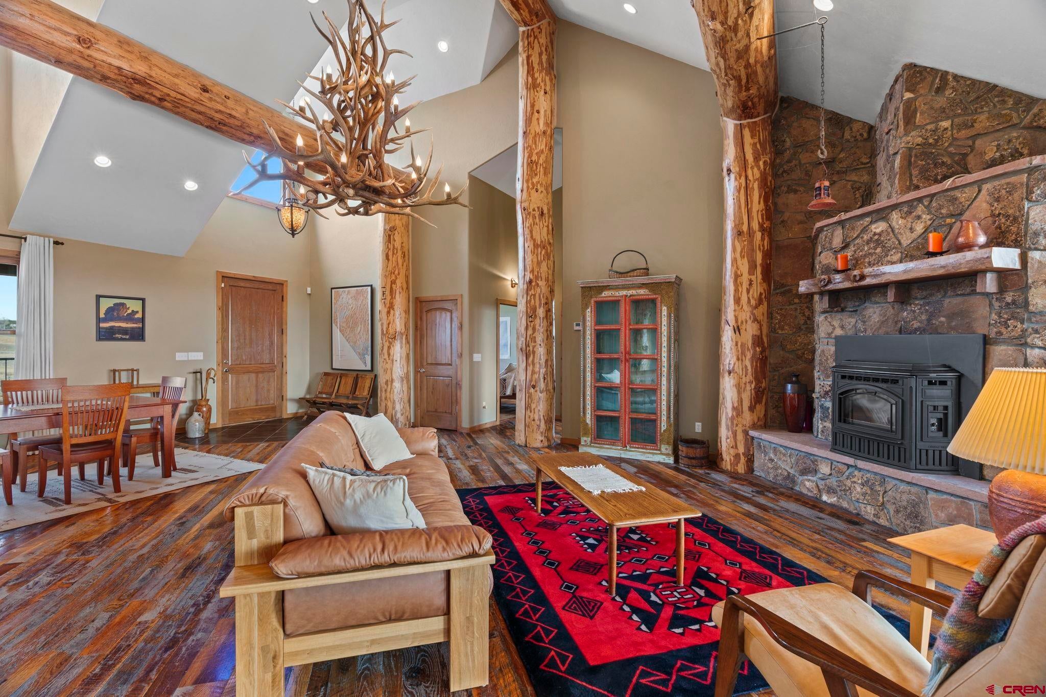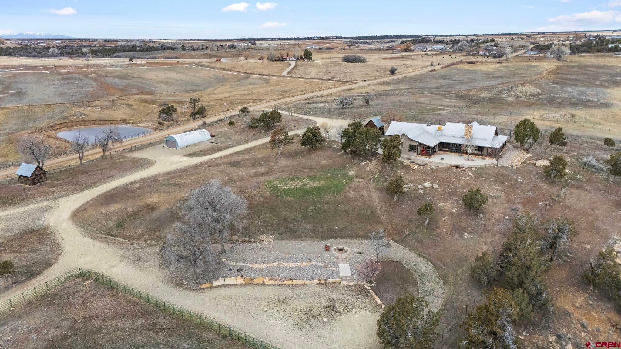 Colorado ranchers paradise on 172 breathtaking acres overlooking Narraguinnep Reservoir. This custom-built, recently updated single-level home offers 3 bedrooms, 2 baths, and 2,733 square feet of refined mountain living. Framed by Mesa Verde, Sleeping Ute, and the La Plata Mountains, the property delivers exceptional privacy, valuable water features, functional ranch infrastructure, and borders 897 acres of public land. A 1,385-square-foot wraparound deck embraces much of the homean ideal setting for sunrise coffee and unforgettable Southwest sunsets. Inside, rustic elegance defines the open living room with reclaimed barn wood floors, exposed Douglas fir beams, soaring cathedral ceilings, and a dramatic moss rock fireplace with pellet stove insert. Expansive windows capture panoramic mountain views. The gourmet kitchen features stainless steel appliances, new granite countertops, updated tile and cabinetry, a walk-in pantry, an island with prep sink, and a generous laundry/mudroom designed for everyday ranch life. The primary suite is privately positioned apart from two additional bedrooms and a full bath, providing ideal separation for family or guests. Both the primary bedroom and the charming dining nook open directly to the covered back porch for effortless indoor-outdoor living. Recent improvements include remodeled bathrooms, fresh interior paint, new wood flooring in the bedrooms, new carpet, a new garage door, and updated stucco siding with exterior stain. Ranch amenities include a livestock shelter and holding pen, large hay barn, workshop, fenced and cross-fenced pastures, two ponds, a year-round live spring, improved internal road system, designated riding arena site with panels included (not installed), and a full RV pad with hookups or potential space for future guest quarters. Rolling meadows dotted with pion, juniper, and cedar complete this extraordinary propertyrich with wildlife and classic Southwest Colorado beauty.