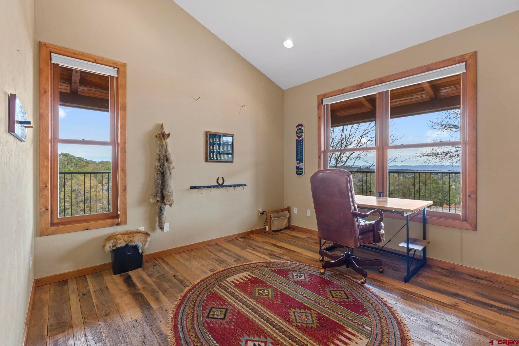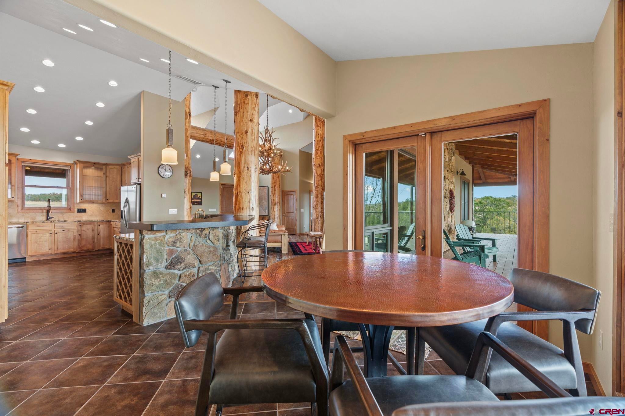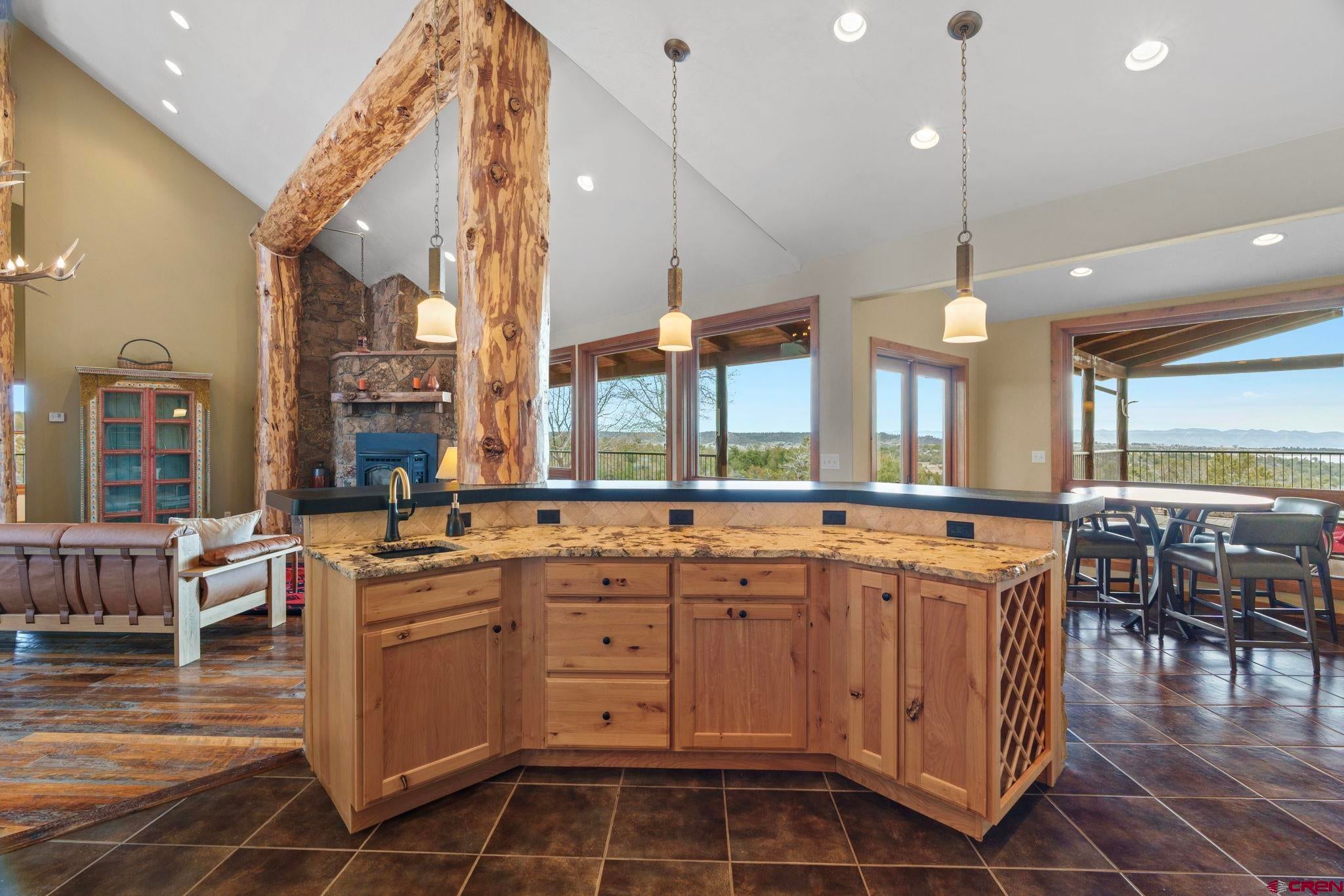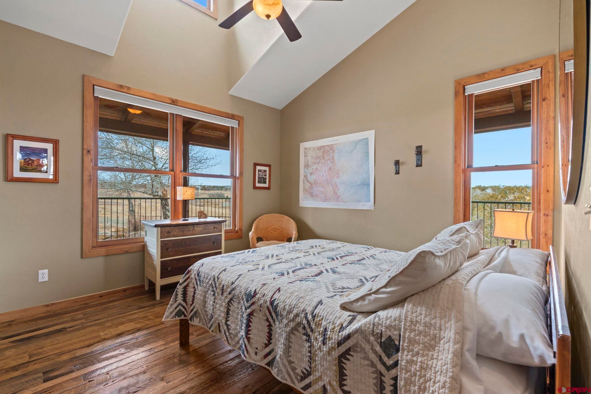 Colorado ranchers paradise on 172 breathtaking acres overlooking Narraguinnep Reservoir. This custom-built, recently updated single-level home offers 3 bedrooms, 2 baths, and 2,733 square feet of refined mountain living. Framed by Mesa Verde, Sleeping Ute, and the La Plata Mountains, the property delivers exceptional privacy, valuable water features, functional ranch infrastructure, and borders 897 acres of public land. A 1,385-square-foot wraparound deck embraces much of the homean ideal setting for sunrise coffee and unforgettable Southwest sunsets. Inside, rustic elegance defines the open living room with reclaimed barn wood floors, exposed Douglas fir beams, soaring cathedral ceilings, and a dramatic moss rock fireplace with pellet stove insert. Expansive windows capture panoramic mountain views. The gourmet kitchen features stainless steel appliances, new granite countertops, updated tile and cabinetry, a walk-in pantry, an island with prep sink, and a generous laundry/mudroom designed for everyday ranch life. The primary suite is privately positioned apart from two additional bedrooms and a full bath, providing ideal separation for family or guests. Both the primary bedroom and the charming dining nook open directly to the covered back porch for effortless indoor-outdoor living. Recent improvements include remodeled bathrooms, fresh interior paint, new wood flooring in the bedrooms, new carpet, a new garage door, and updated stucco siding with exterior stain. Ranch amenities include a livestock shelter and holding pen, large hay barn, workshop, fenced and cross-fenced pastures, two ponds, a year-round live spring, improved internal road system, designated riding arena site with panels included (not installed), and a full RV pad with hookups or potential space for future guest quarters. Rolling meadows dotted with pion, juniper, and cedar complete this extraordinary propertyrich with wildlife and classic Southwest Colorado beauty.
