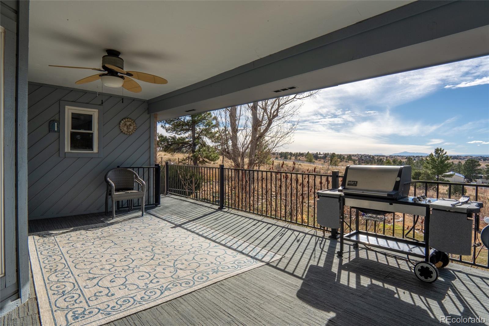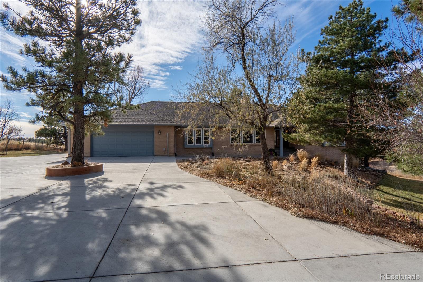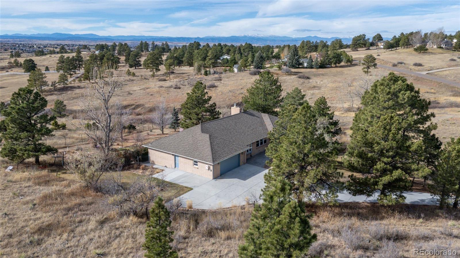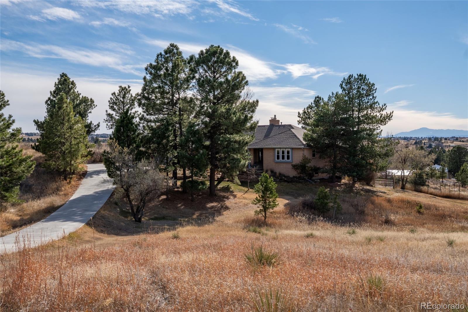Nestled on almost 5 acres, beautifully landscaped with unobstructed views of Pikes Peak, this gorgeous brick ranch-style home offers the perfect blend of luxury, comfort, and country charm. Surrounded by mature pine trees and open meadowland, the property provides privacy, tranquility, and breathtaking Colorado sunsetsall just minutes from town amenities. Boasting 5108 square feet of living space, this spacious home features five bedrooms and four full baths. The inviting main level showcases high ceilings, gleaming hardwood floors, expansive windows, and a cozy fireplace that anchors the main living area. The open-concept living and dining spaces are ideal for entertaining, while the chefs kitchen is equipped with premium appliances, abundant custom cabinetry, and generous workspace. The luxurious main-level primary suite offers a double-door entry, private balcony, and stunning mountain views. The spa-inspired five-piece ensuite features a bay window and is filled with natural light, creating a bright and relaxing retreat. A convenient main-floor laundry room adds everyday functionality. The finished walk-out basement offers exceptional versatility, complete with two additional bedrooms, a full bath, a second fireplace, its own laundry room, a separate entrance, and a full kitchenmaking it ideal for multi-generational living or extended guests. Step outside to a private covered patio, creating an additional outdoor living space perfect for relaxing or entertaining while enjoying the peaceful surroundings. Outside, the beautifully landscaped acreage features mature trees, vibrant flower gardens, a charming grape-covered gazebo, and a 10-foot privacy fence. Zoned for horses and surrounded by neighboring acreage protected from development, this property preserves its serene rural setting while offering modern comforts and energy efficiency with new solar panels (2025).