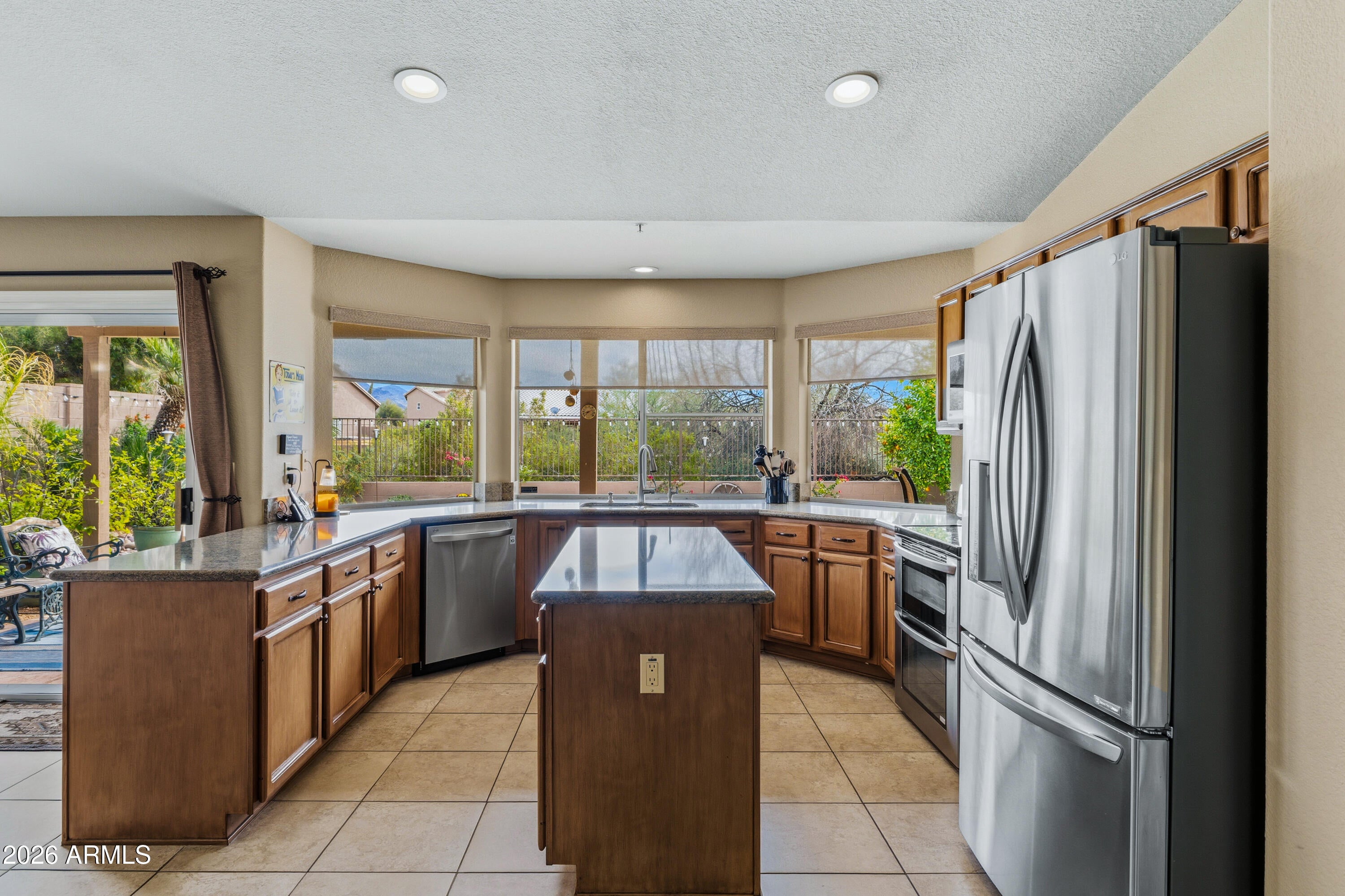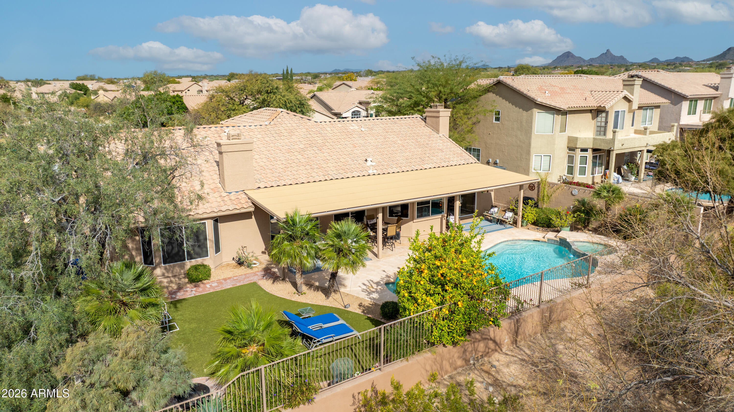 Located in the desirable Ironwood Village community, this impeccably maintained single-level home offers 2,449 SqFt with 3 bedrooms and 2 bathrooms on a private lot backing to the natural wash with mountain views. Soaring ceilings and expansive windows create a bright, open feel throughout the main living areas. The spacious living and dining rooms flow seamlessly into the kitchen and family room, where a fireplace adds warmth and character. The kitchen features Quartz countertops, stainless steel appliances, a center island, abundant cabinetry, and a large picture window overlooking the backyard - bringing natural light into the heart of the home. The split floor plan provides privacy, with a generously sized primary suite offering backyard views, a fireplace, dual vanities, soaking tub, separate shower, and walk-in closet. Secondary bedrooms offer flexibility for guests, family, or a home office.Step outside to a private backyard retreat designed for both relaxation and entertaining. Enjoy the covered patio, sparkling pool and spa, mature landscaping, grassy play area, and beautiful mountain views. The elevated setting offers added privacy and open-sky vistas.Additional highlights include a 3-car garage, vaulted ceilings, ample storage, and access to Ironwood Village Park and walking paths.