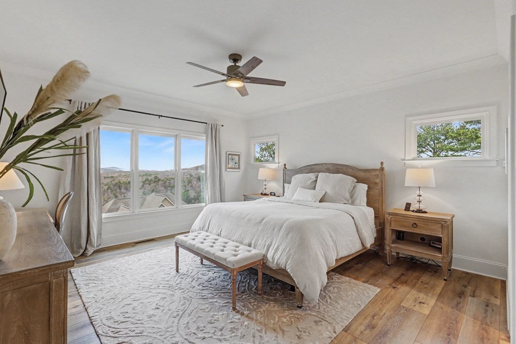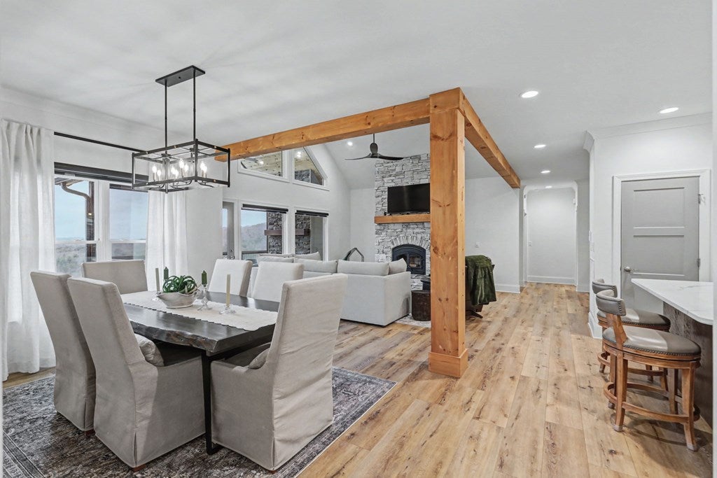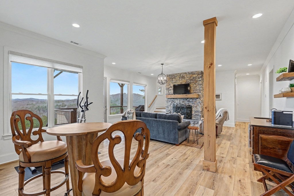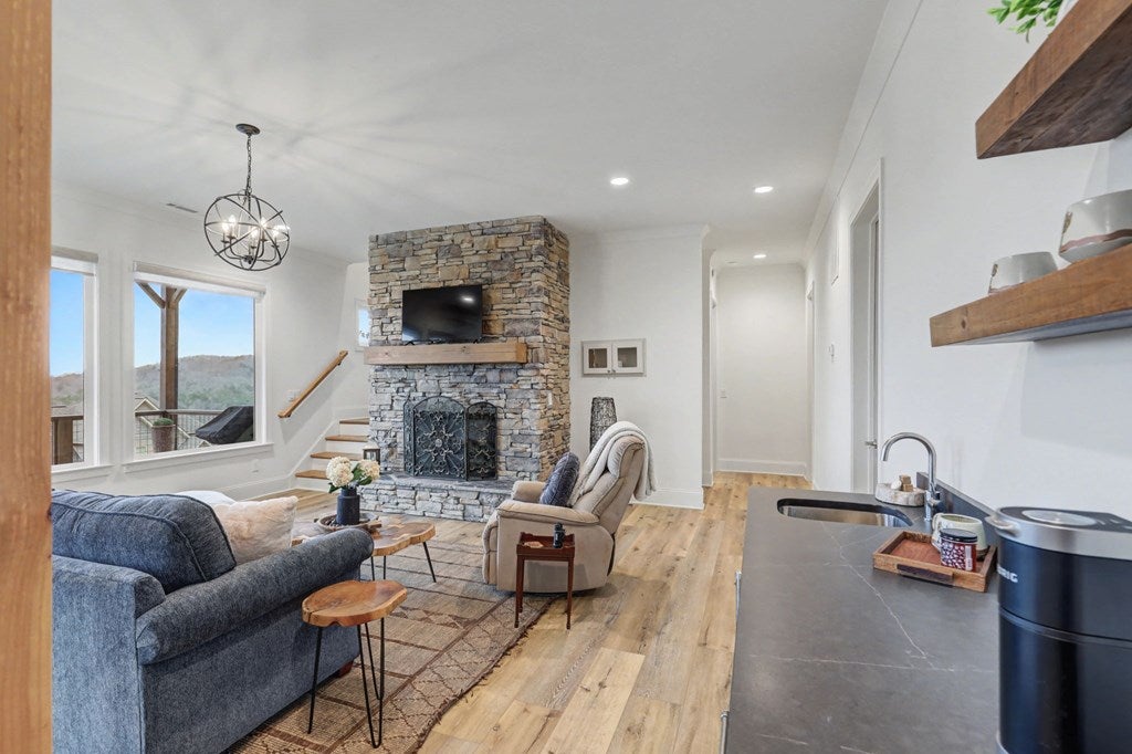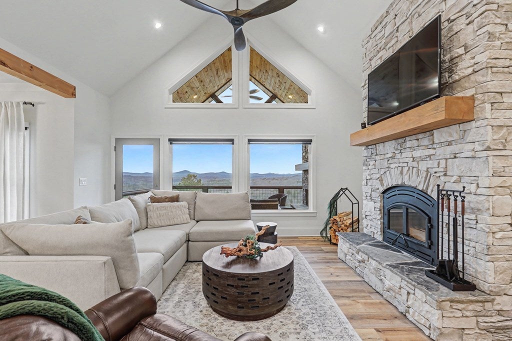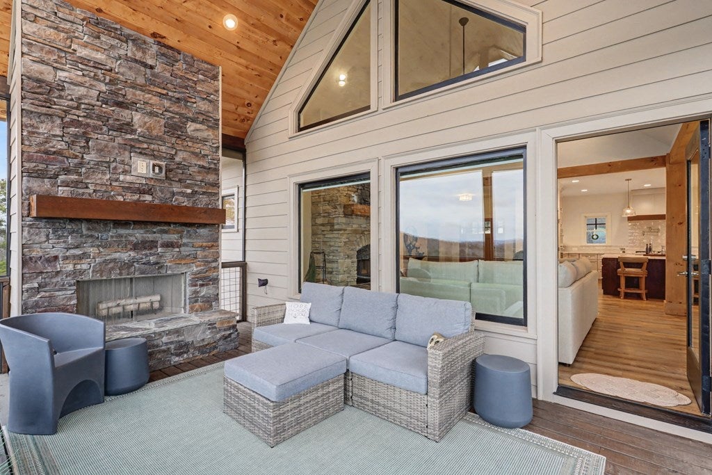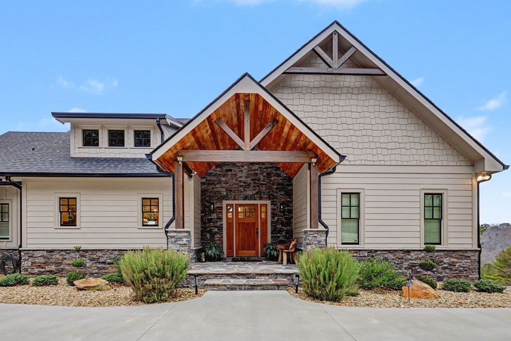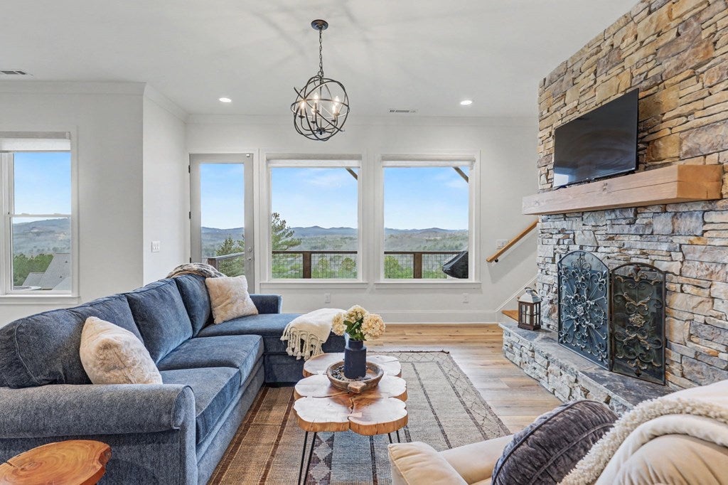 True to its name, Sunset View delivers sweeping westward mountain vistas and sunsets that glow with radiant color, capturing the essence of luxury mountain living. This exceptional Craftsman residence embodies refined mountain elegance at its finest, thoughtfully designed and executed with meticulous attention to detail. Elevated finishes, a well-considered layout, and timeless craftsmanship create a home that feels both grand and inviting. From the moment you arrive, the expansive covered front porch finished in flagstone sets the tone for the sophistication found throughout. Professionally designed landscaping, enriched with river rock accents, stone steps, and tasteful hardscapes, frames the home beautifully in its natural mountain setting. Inside, the main level is anchored by a chefs kitchen with a large center island, gas cooktop with custom vent hood, and built-in wall oven and microwave. The open floor plan flows effortlessly into the living spaces, perfect for entertaining or everyday comfort. Fireplaces on every level create warm, inviting gathering spaces year-round. The main floor also offers two spacious ensuite bedrooms, including the primary suite featuring a spa-like bath with a freestanding soaking tub and a separate shower room, providing comfort and privacy. A thoughtfully placed powder room adds convenience for guests. The lower level expands the homes versatility with an additional ensuite bedroom, a fourth bedroom, a half bath, and generous living space ideal for guests, media, or recreation. Outdoor living is extraordinary. The back deck, complete with an outdoor fireplace, is perfectly positioned to capture panoramic vistas and glowing sunsets, offering a serene retreat for evenings under the stars. With 4 bedrooms, 3 full baths, and 2 half baths, Sunset View balances luxury, function, and mountain elegance. Every detail reflects a home built for those who appreciate quality, beauty, and an elevated North Georgia mountain lifestyle.