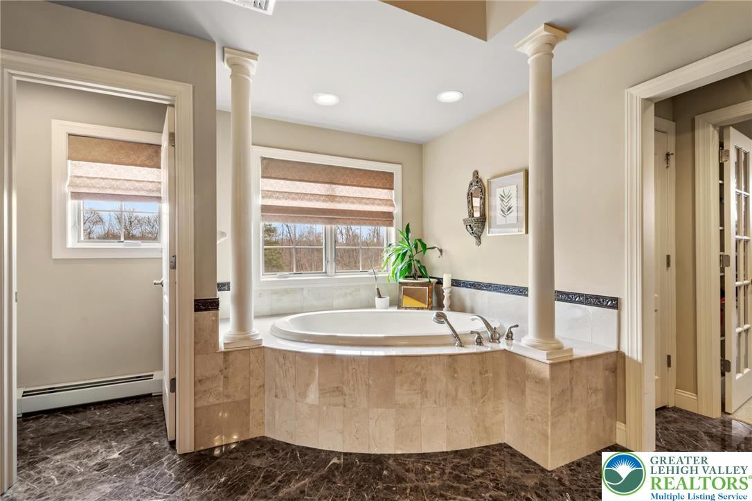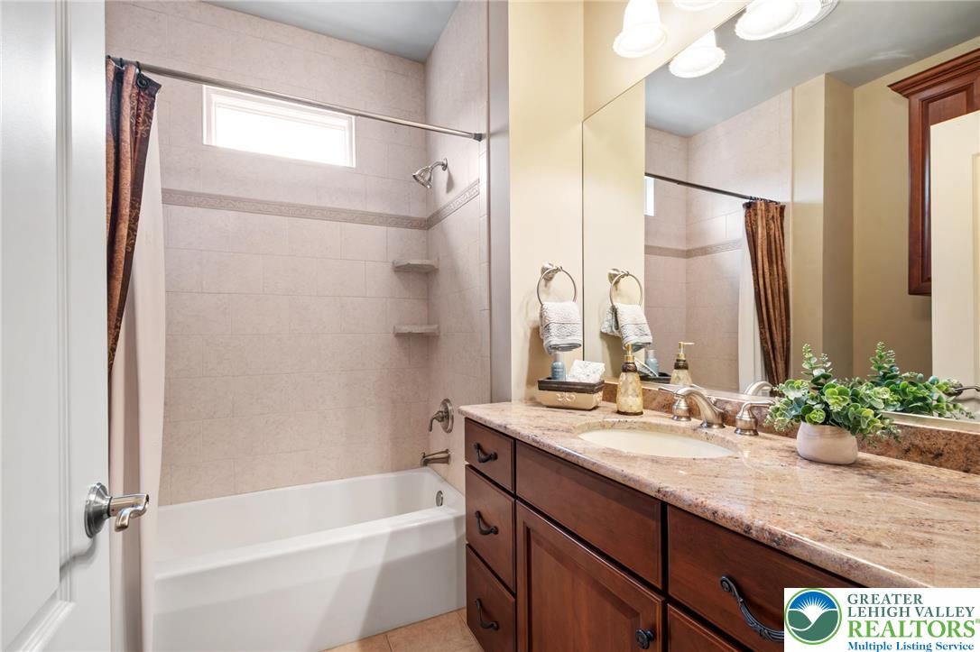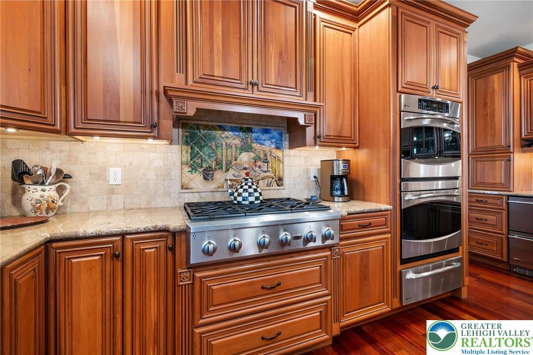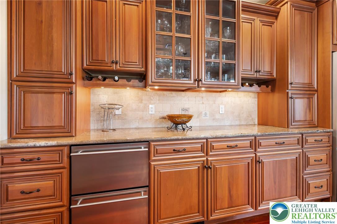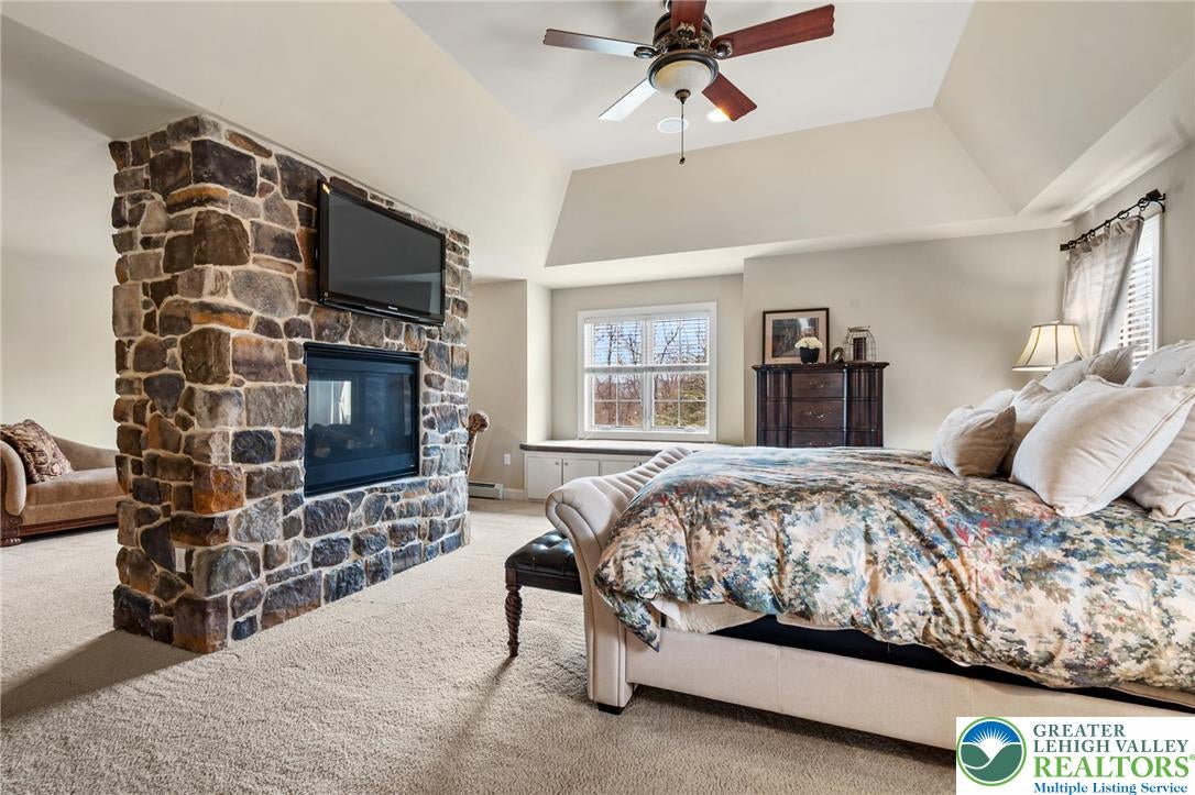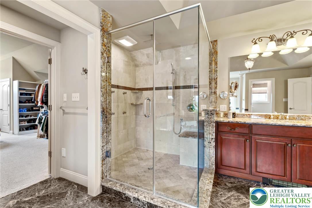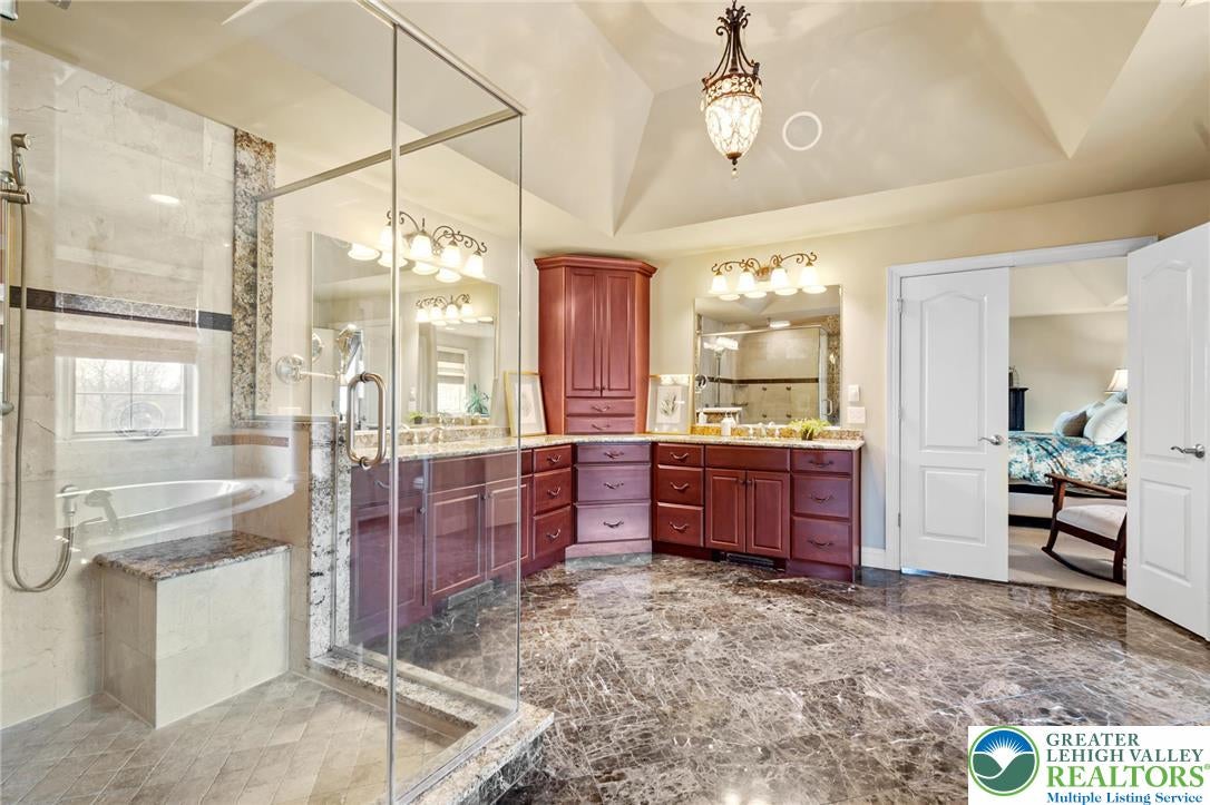 Set on a beautifully landscaped cul-de-sac lot in Tuscany Hillan exclusive enclave of just nine homes built by award-winning Monogram Custom Homesthis exceptional property offers a rare blend of scale, craftsmanship, and lifestyle-driven design. Located in Upper Saucon Township and the highly regarded Southern Lehigh School District, the setting is as desirable as the home itself.Striking curb appeal and architectural character hint at a subtle European influence, while the interior showcases a thoughtfully designed layout with refined detail throughout. The main level seamlessly blends formal and everyday living, featuring a private office with custom built-ins, an elegant dining room with coffered ceiling, and a versatile sitting room ideal for a music room or additional entertaining space. The gourmet kitchen anchors the home with custom cabinetry, high-end appliances, and a generous center island, opening to a sun-filled breakfast area and a dramatic two-story family room with a floor-to-ceiling stone fireplace and walls of windows. Upstairs, the primary suite offers a true retreat with a double-sided fireplace, sitting area, and a spa-inspired bath featuring a walk-in glass shower, soaking tub, dual vanities, and an expansive walk-in closet. Two additional en-suite bedrooms, along with two more connected by a Jack-and-Jill bath, offer generous space and are complemented by walk-in closets. The finished walk-out lower level elevates the home even further, offering a full custom bar, multiple entertaining and recreation areas, a dedicated fitness room, media space, and a full bathcreating a true extension of the home ideal for entertaining, guests, or multi-generational living. Outdoor living is equally compelling, featuring a paver patio, hot tub, and beautifully designed landscaping with natural stone accentsoffering a sense of privacy and a setting reminiscent of a quiet countryside retreat. A rare opportunity to own a home that combines timeless design, exceptional space, and a location that continues to be one of the Lehigh Valleys most sought after.