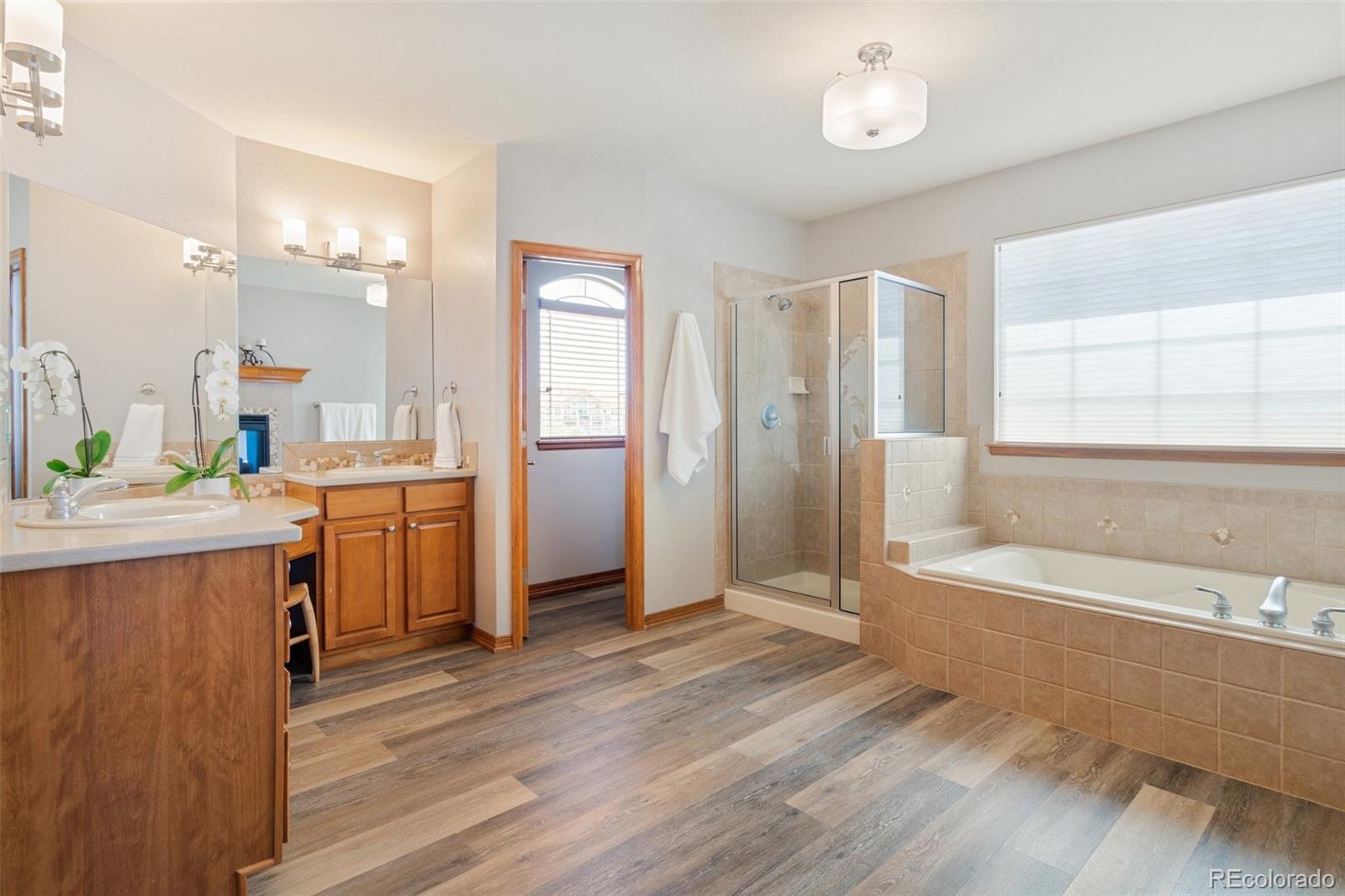 Refined design and exceptional craftsmanship come together in this beautiful Pottery Barn semi-custom home, ideally positioned on a premium corner lot in the highly desirable Candelas community. Thoughtfully designed with a sophisticated modern aesthetic, this residence showcases curated finishes, extensive upgrades, and meticulous attention to detail throughout. Stunning wide-plank hardwood floors extend throughout the main level, and a dramatic 25-foot-wide mantel and gas fireplace with a floor-to-ceiling tile surround. The oversized center-meet sliding glass doors create seamless indoor-outdoor living extending to a sizeable partially covered composite deck. The chefs kitchen is centered on an expansive honed-granite island, perfect for gathering and entertaining. Highlights include GE Caf appliances, upgraded white cabinetry, quartz perimeter countertops, a walk-in pantry, and white oak open shelving. Upstairs, the primary suite serves as a serene retreat, complete with sweeping views, a coffered ceiling, a luxurious five-piece spa-inspired bath, and a spacious walk-in closet. Downstairs, the finished walkout basement is designed for versatility and fun, offering a spacious family room with a custom wet bar and wine cellar. Two generously sized secondary bedrooms and a bath round out the lower level. Step outside to a custom, professionally designed backyard, ready for entertaining and relaxing. The covered lower patio includes a hot tub (12,000), a built-in fire pit, and an upgraded turf lawn and professional landscape. Additional highlights include a home office, paid in full solar system (35,000), upgraded lighting throughout, automated stair lights, integrated smart home features, outdoor Jelly Lights (12,000), and a 3-car garage with EV wiring. Located just minutes from multiple neighborhood parks, trails, Jefferson County Schools, dining, shopping, and more this is an exceptional opportunity to experience elevated Colorado living.