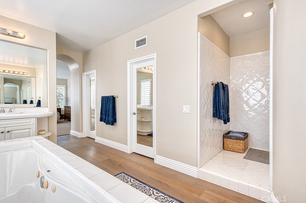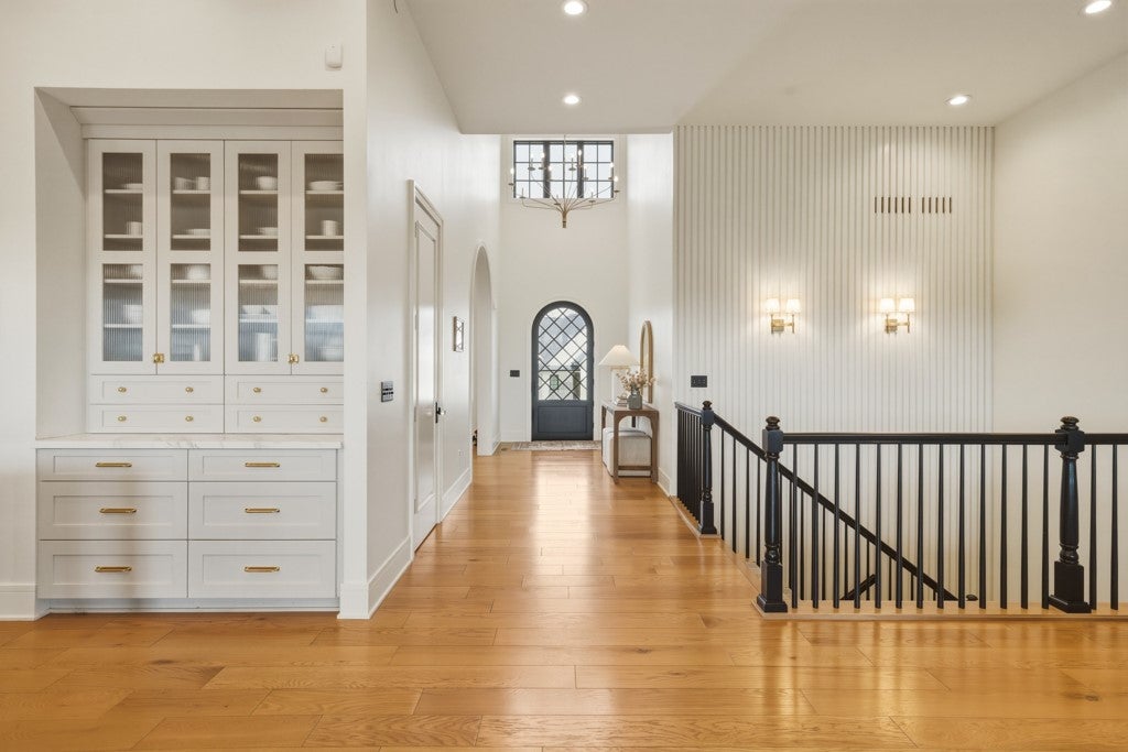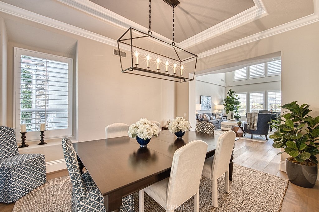 Nestled just beyond the gates of Coto de Caza, this updated corner lot golf course view residence is designed for both functionality and comfort. The grand entryway makes a lasting impression with its soaring two-story foyer, spiral staircase, leaded glass door, and wood plank flooring that extends seamlessly into the kitchen and family room.
