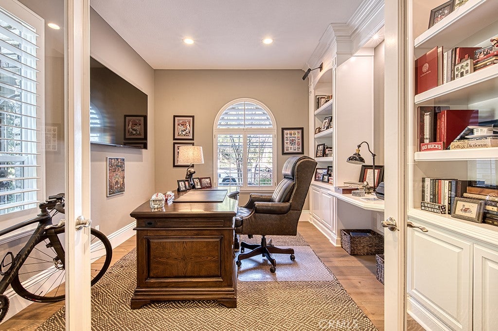 Nestled just beyond the gates of Coto de Caza, this updated corner lot golf course view residence is designed for both functionality and comfort. The grand entryway makes a lasting impression with its soaring two-story foyer, spiral staircase, leaded glass door, and wood plank flooring that extends seamlessly into the kitchen and family room. The formal living room with two story ceilings showcases a beautiful space for special occasions. Connected by by a striking double-sided fireplace, the spacious family rooms sits adjacent to the remodeled kitchen, which is equipped with premium stainless steel appliances, a large island, and a breakfast nook. A formal dining room, guest suite and private office framed by glass double doors and custom-built bookshelves, complete the main level. Upstairs, the luxurious primary suite offers a serene retreat with dual vanities, a spacious walk-in closet, a walk-in shower, a jet-spa tub, a cozy sitting area, and a private balcony showcasing breathtaking views of Cotos south golf course, complete with a picturesque pond. Down the hall are two additional en-suite bedrooms connected by a shared study space with built-in desks. The backyard is great for entertaining and showcases a desirable southeast exposure with a sparkling swimming pool, a sun deck and a built-in BBQ island. Situated on a coveted corner lot along a single-loaded street, this home benefits from an adjacent recreational park and an open greenbelt across the way, creating an extended outdoor space perfect for relaxation and play. Experience the best of Coto de Caza, where premier living meets award-winning schools, a world-class Golf & Racquet Club, scenic sports parks, and easy access to hiking, biking, and equestrian trails. No Mello rooslow tax rate.