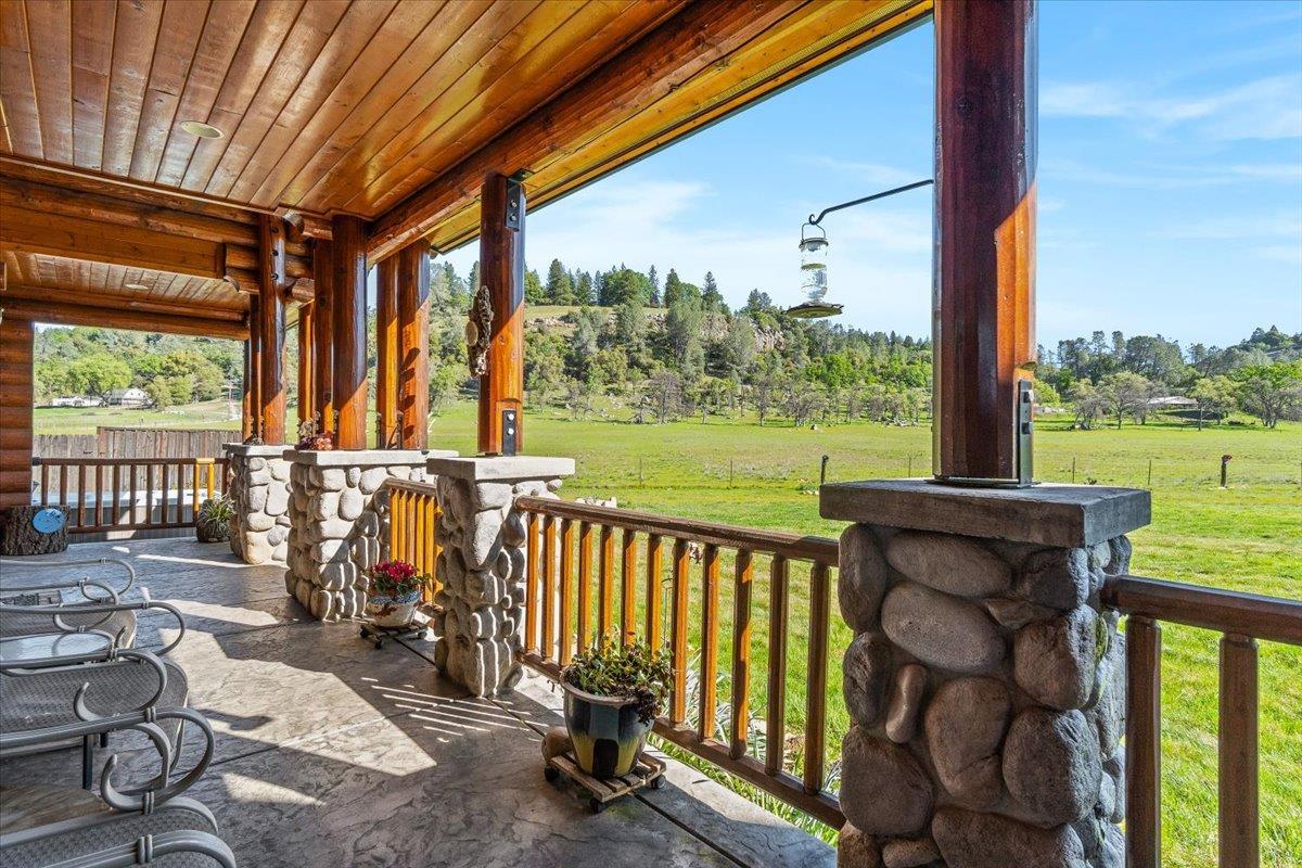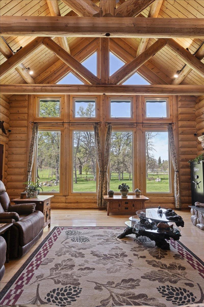 Home, home on the Range is this stunning log-home estate with a seasonal creek meandering its wide, open, and level acreage. The impressive great room immediately captures your attention with soaring open-beam log trusses, full-length windows, and a majestic river rock fireplace.