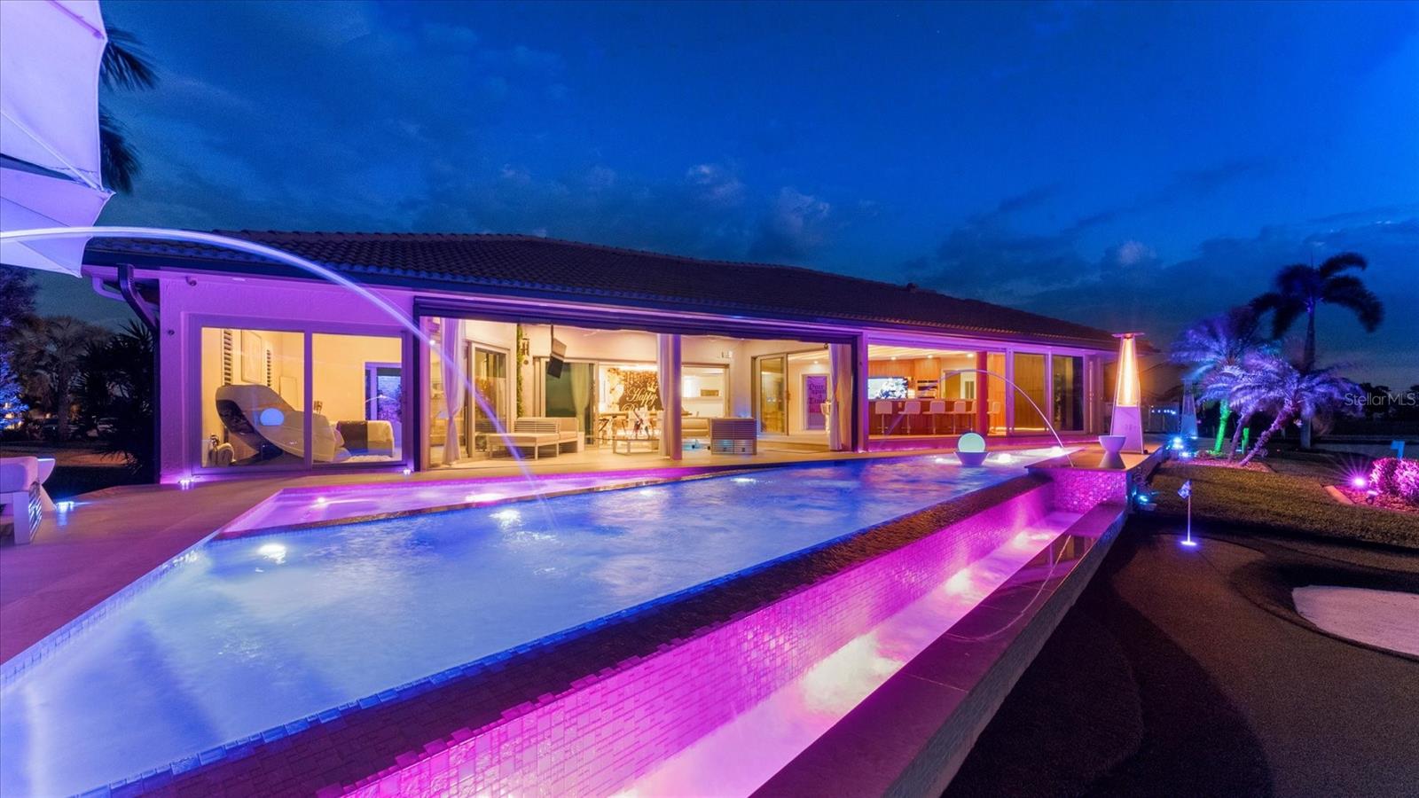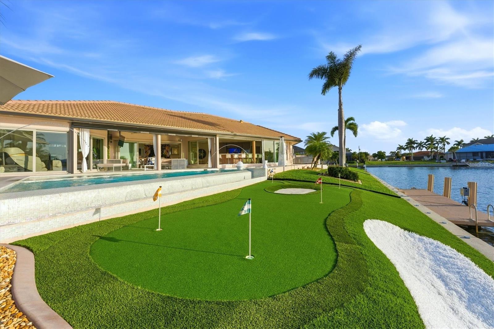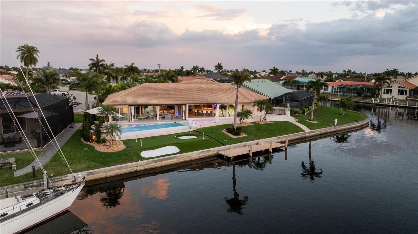 Your Waterfront Sunset View Dream Home in the Prestigious Sailboat Section of Punta Gorda Isles Step into a rare opportunity where luxury, privacy, and breathtaking waterfront living converge. From the moment you arrive, you’ll sense that this is more than a home — it’s a lifestyle reserved for those who appreciate the extraordinary. Perfectly positioned in the highly sought-after sailboat section of Punta Gorda Isles, this exceptional key lot waterfront estate boasts 140 feet of reinforced seawall and expansive, unobstructed wide basin and long-canal views. Each evening, the sky transforms into a masterpiece of vivid sunsets, while tranquil moonlit waters create an ambiance of pure serenity. The impeccably renovated 3-bedroom, 3-bath residence showcases a sophisticated open-concept design, enhanced by walls of hurricane-impact sliding glass doors that create a seamless flow between indoor and outdoor living. A comprehensive remodel and new roof elevate the home with a refined, modern organic aesthetic, while natural light fills the interior capturing stunning water views from nearly every angle. Designed for a truly elevated lifestyle, the outdoor setting is anchored by a brand-new saltwater infinity-edge pool and spa with sun shelf, finished with glass pebble surfaces for a striking, resort-quality feel. Intended for both relaxation and entertaining, the outdoor living space rivals that of a private resort. Refine your putting skills on your own 5-hole green, or host unforgettable gatherings in the expansive outdoor kitchen overlooking the water. This oversized key lot also offers ample space for extended covered lanais and features a substantial concrete dock, ready to accommodate your custom boating setup. Inside, the home continues to impress with an incredible chef’s kitchen featuring high-end finishes and a beautifully designed primary suite with a spa-inspired ensuite bath, creating a private retreat of comfort and sophistication. Bonus features of this home include, large walk in pantry, coffee station, back lit onyx waterfall island, fireplace feature wall, extensive landscape lighting, automated lighting throughout, automated blinds and an epoxy-finished garage floor all adding a distinctive touch. With direct, no-bridge sailboat access, you’re just minutes from the open waters of Charlotte Harbor and the Gulf of America — a true boater’s paradise. Nearby, downtown Punta Gorda offers an array of waterfront dining, boutique shopping, and cultural experiences, all within a charming, vibrant coastal setting. Meticulously updated and exceptionally positioned, this property delivers the ultimate Southwest Florida lifestyle — where luxury meets tranquility and every day feels like a getaway. If you’ve been waiting for a signature waterfront property that truly stands apart, this is your moment. Boardwalk and Park Place available! Schedule your private showing today and experience it for yourself.