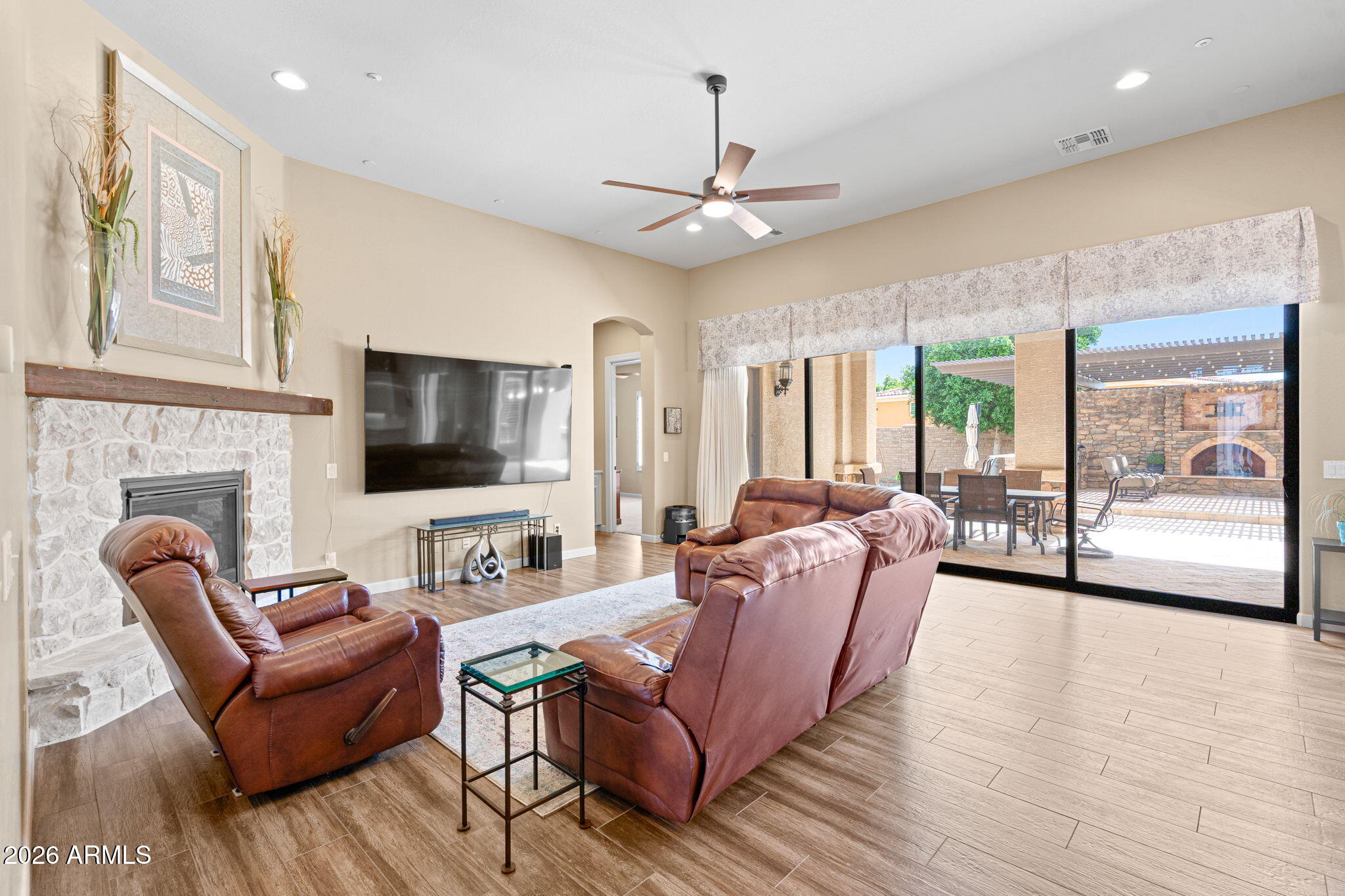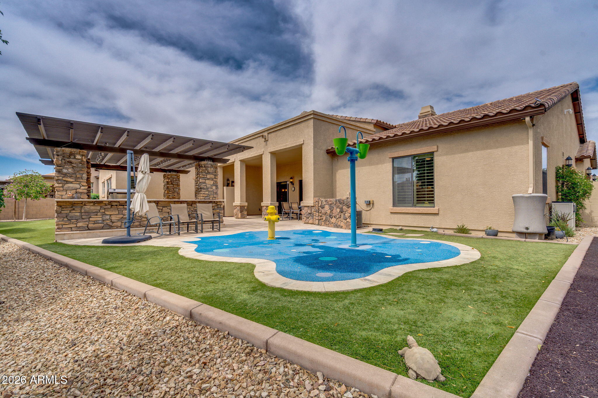 Welcome to Robin Court--an exceptional single-story Tuscan estate tucked away on a private cul-de-sac within the exclusive gated enclave of TH Ranch, a community of only 13 homes. This semi-custom Blandford residence showcases thoughtful upgrades and quality finishes throughout.The gourmet kitchen is designed to impress, featuring solid wood cabinetry, Viking appliances, new quartzite countertops, a gas cooktop with double electric ovens, a large island, walk-in pantry, and built-in refrigerator/freezer. The kitchen opens seamlessly to the main dining area and inviting family room, highlighted by a corner fireplace--perfect for everyday living and entertaining.The expansive great room offers multiple sliding glass doors leading to a covered patio, creating a true indoor/outdoor living experience.The oversized primary suite is a private retreat with dual walk-in closets and a spa-inspired bath complete with double vanities, a garden tub, and a spacious walk-in shower. A separate guest suite (or second primary) includes its own en-suite bath, walk-in closet, and private exterior entrance--ideal for multigenerational living or guests.Additional features include three secondary bedrooms with walk in closets, full baths, a versatile flex room, and formal living and dining spaces, offering ample room for any lifestyle.Step outside to a backyard designed for enjoyment, featuring a large covered patio, pergola with seating area, outdoor fireplace and built-in BBQ, splash pad, play structure, fruit trees, garden area, and low-maintenance artificial turf. The premium cul-de-sac lot, adjacent to the canal, provides enhanced privacy and a serene setting.