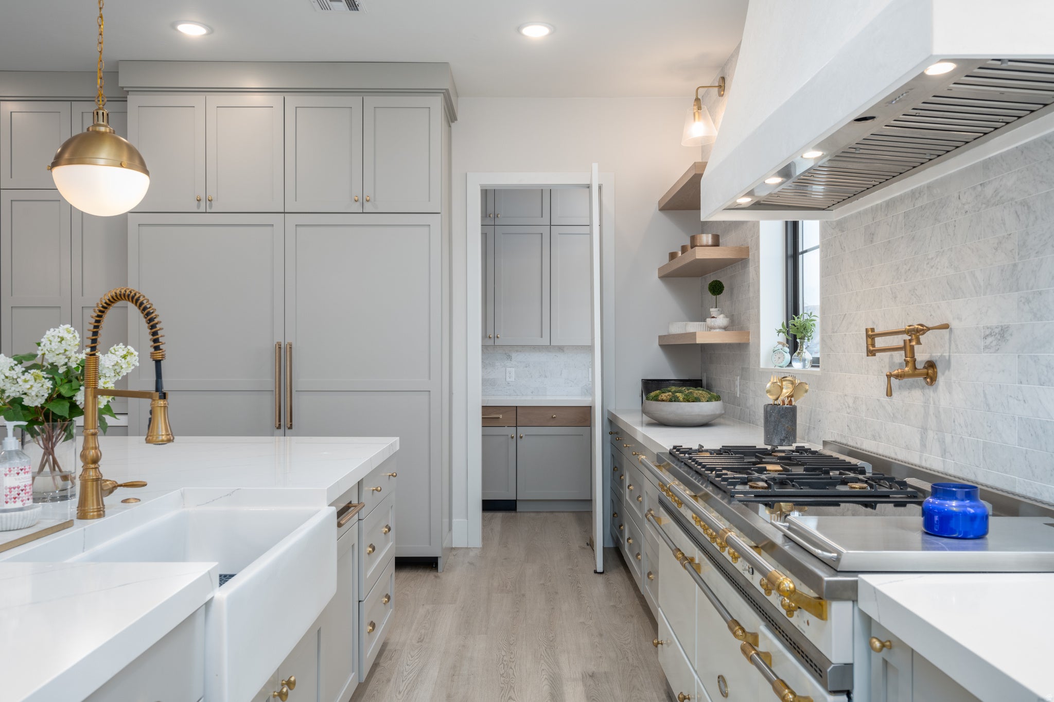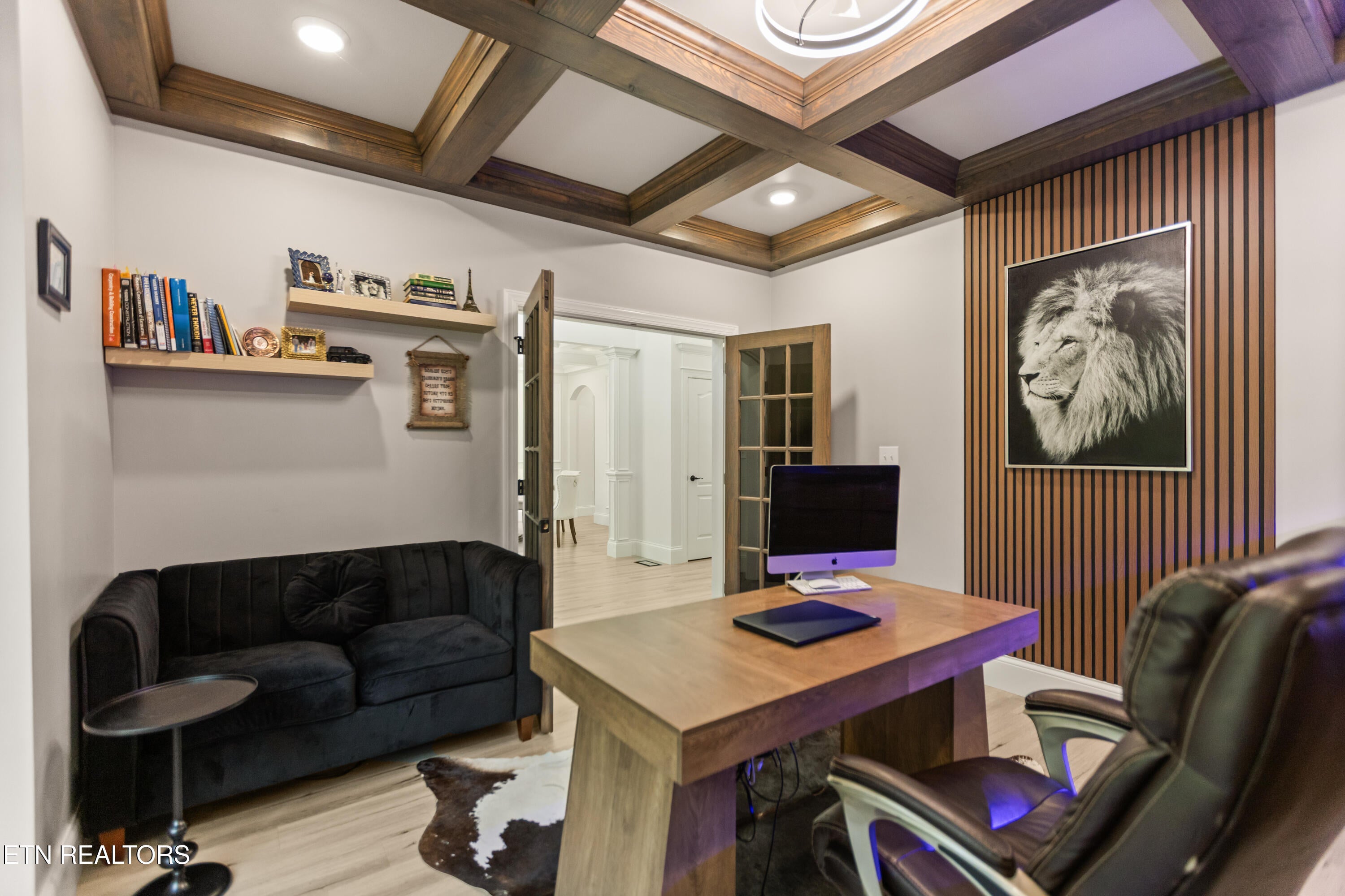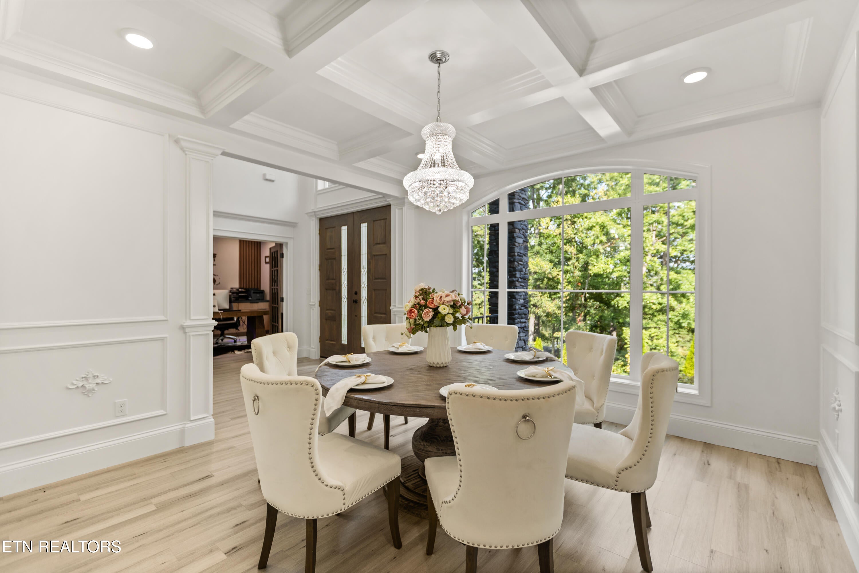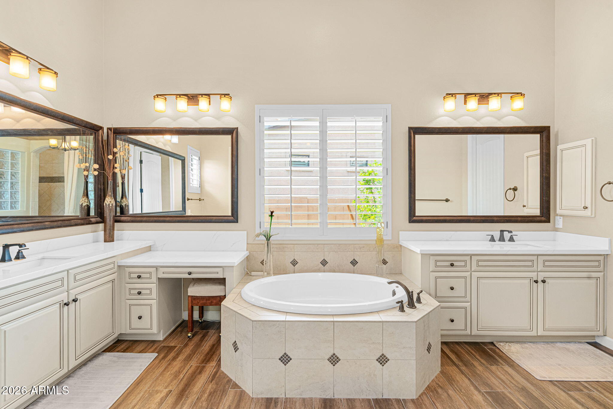 Elegant and spacious home with versatile layout and luxurious amenities. Main floor features a welcoming entry foyer, formal living room, family room with double-sided fireplace, formal dining room, eat-in kitchen, a bedroom/office, and a full bath. Upstairs offers a serene primary suite with fireplace, private terrace, and spa-like bath, plus an adjacent office.