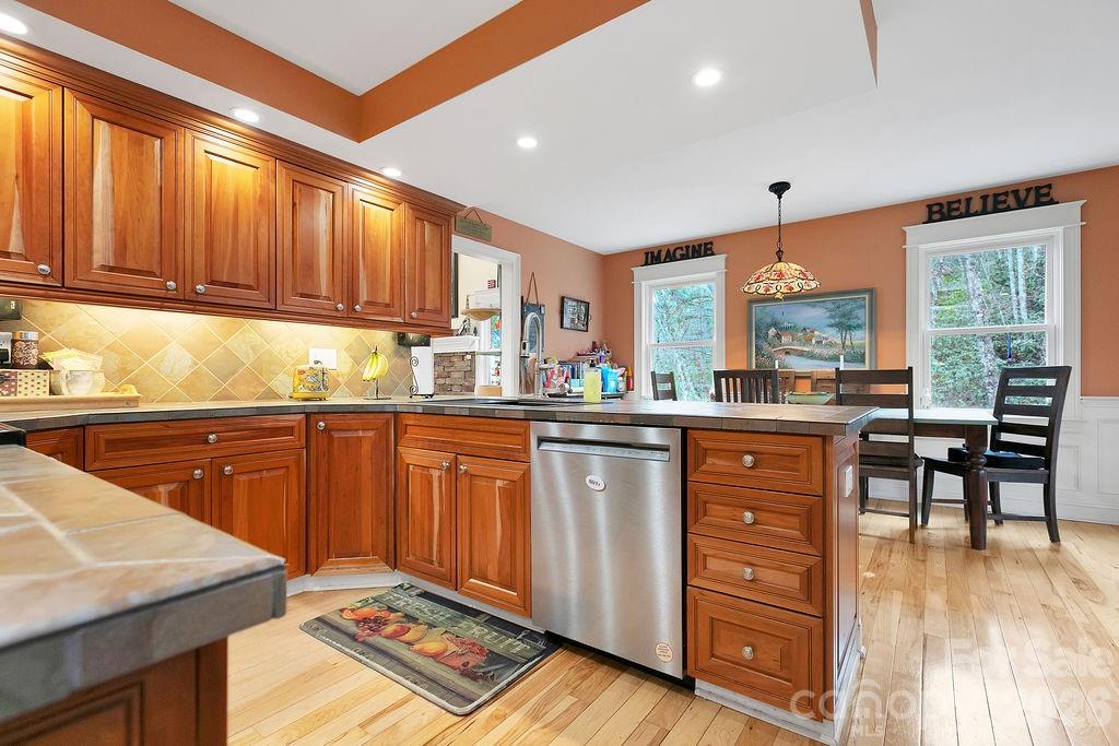 Perched at the end of the road high on a mountainside, this stately home offers unmatched privacy on 18 breathtaking acres. Surrounded by nature, the property is a true retreat with exceptional outdoor living. Relax in the jacuzzi, unwind on the rocking chair front porch or screened back porch, and gather around the stone fire pit while taking in tranquil mountain sunrises and sunsets. Explore terraced gardens, hike scenic trails, or ride an ATV along the path that winds throughout the entire property.Originally built by a contractor as his forever home, this residence was constructed with quality and durability in mindtruly overbuilt to stand the test of time. Inside, the impressive living room welcomes you with soaring ceilings, custom built-ins, a cozy wood stove, and abundant natural light from skylights above. The dining area flows seamlessly from the living space and connects to a beautifully appointed kitchen featuring custom slate tile countertops, cherry cabinetry, a breakfast bar, and stainless steel KitchenAid appliances. A convenient laundry room/pantry is located just off the kitchen. The main level also includes a half bath and a spacious primary suite with a luxurious bath, double vanity, and extensive tile work. Upstairs, youll find two additional bedrooms, a full bath, and a versatile office spaceall with stunning views from nearly every room. The finished basement offers a bonus room and a half bath, along with an oversized two-car garage and ample storage. Additional features include wiring for a generator, with a portable generator included. At the base of the paved driveway, a private 24x36 detached garage provides even more flexibility, it could be used as a potential second living quartersperfect for guests, rental income, or multi-generational living. All of these features and privacy and you are only 4.6 miles from Main Street Brevard and all of its shopping and dining. This home is truly a must see!