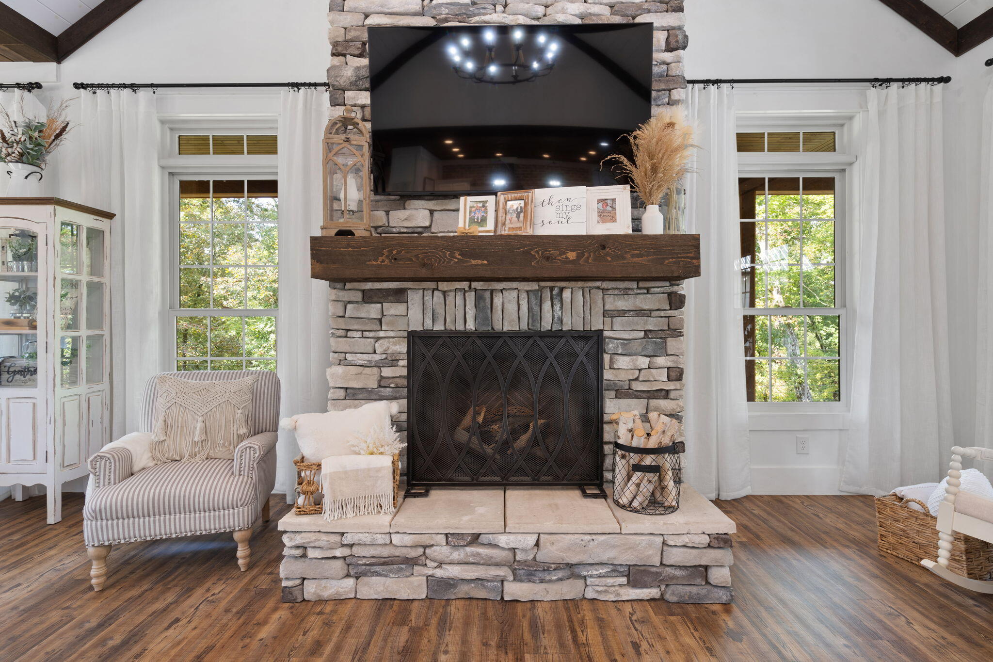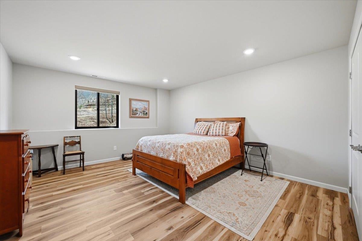 Off-grid custom-built modern farmhouse on 53 acres. No electric bills here! This exquisite estate nestled in the woods is powered with solar panels (not visible from the house) with a backup propane generator. A modern (22,000) outdoor wood furnace heats the house, the hot water, and the hot tub.