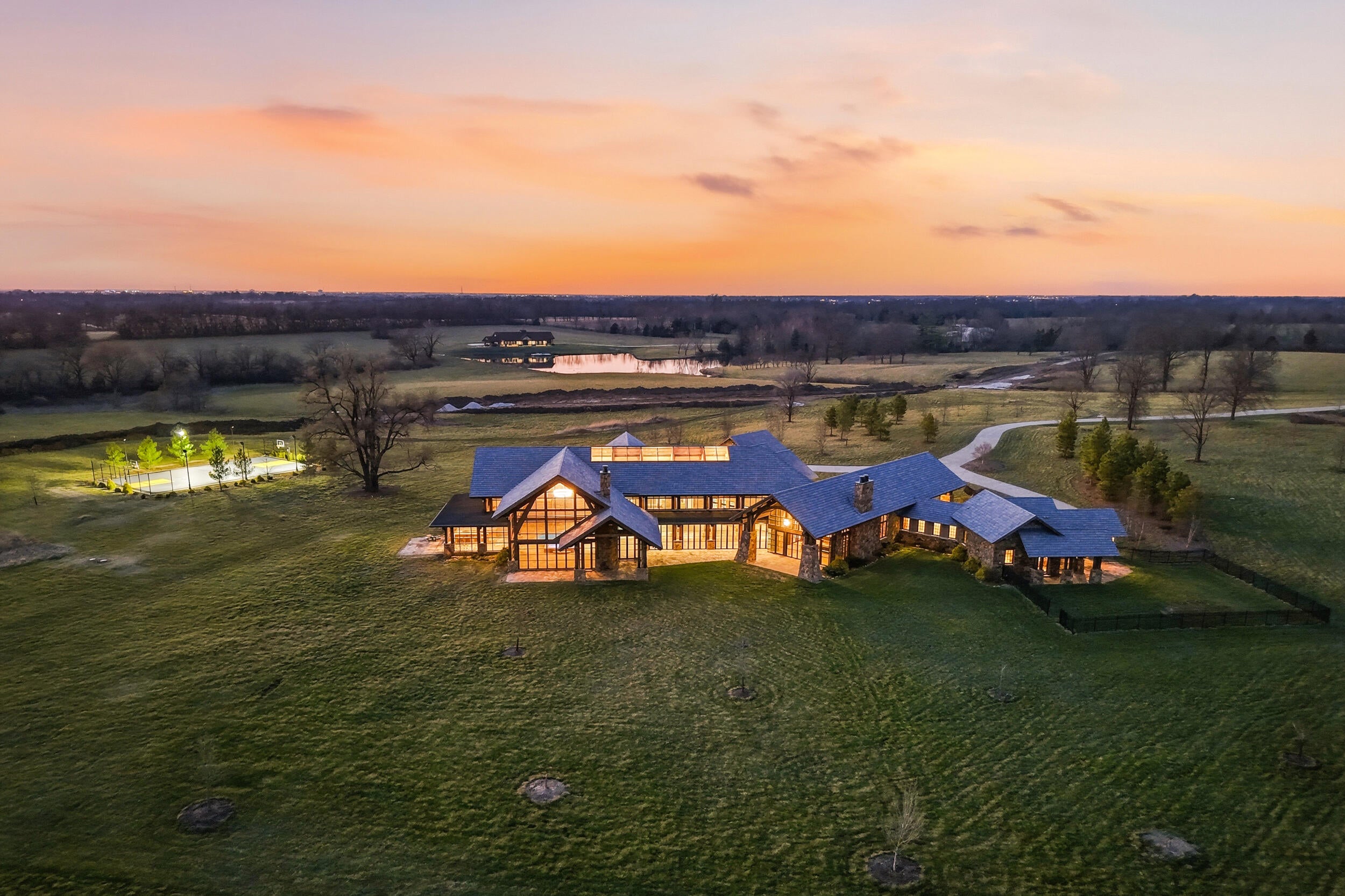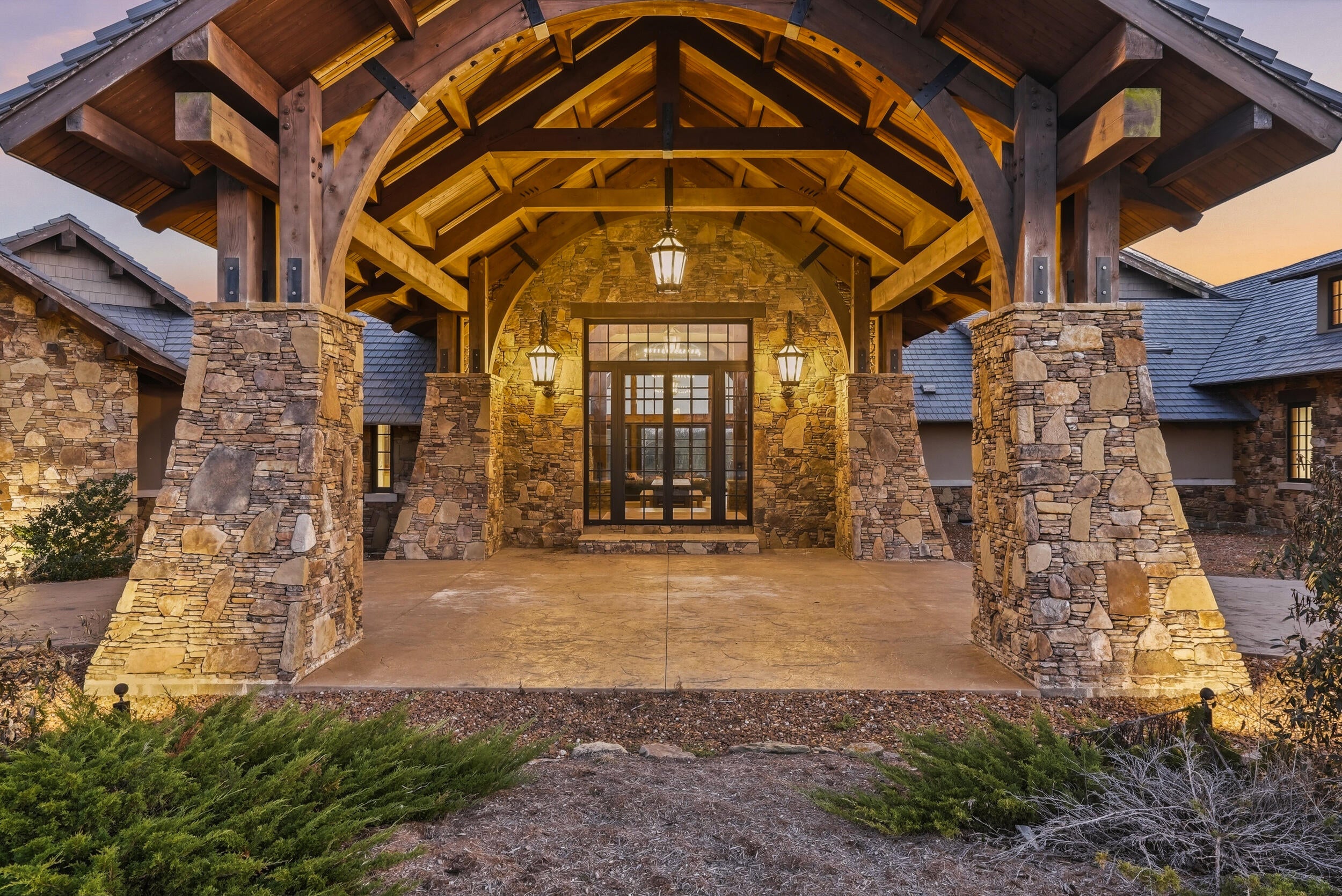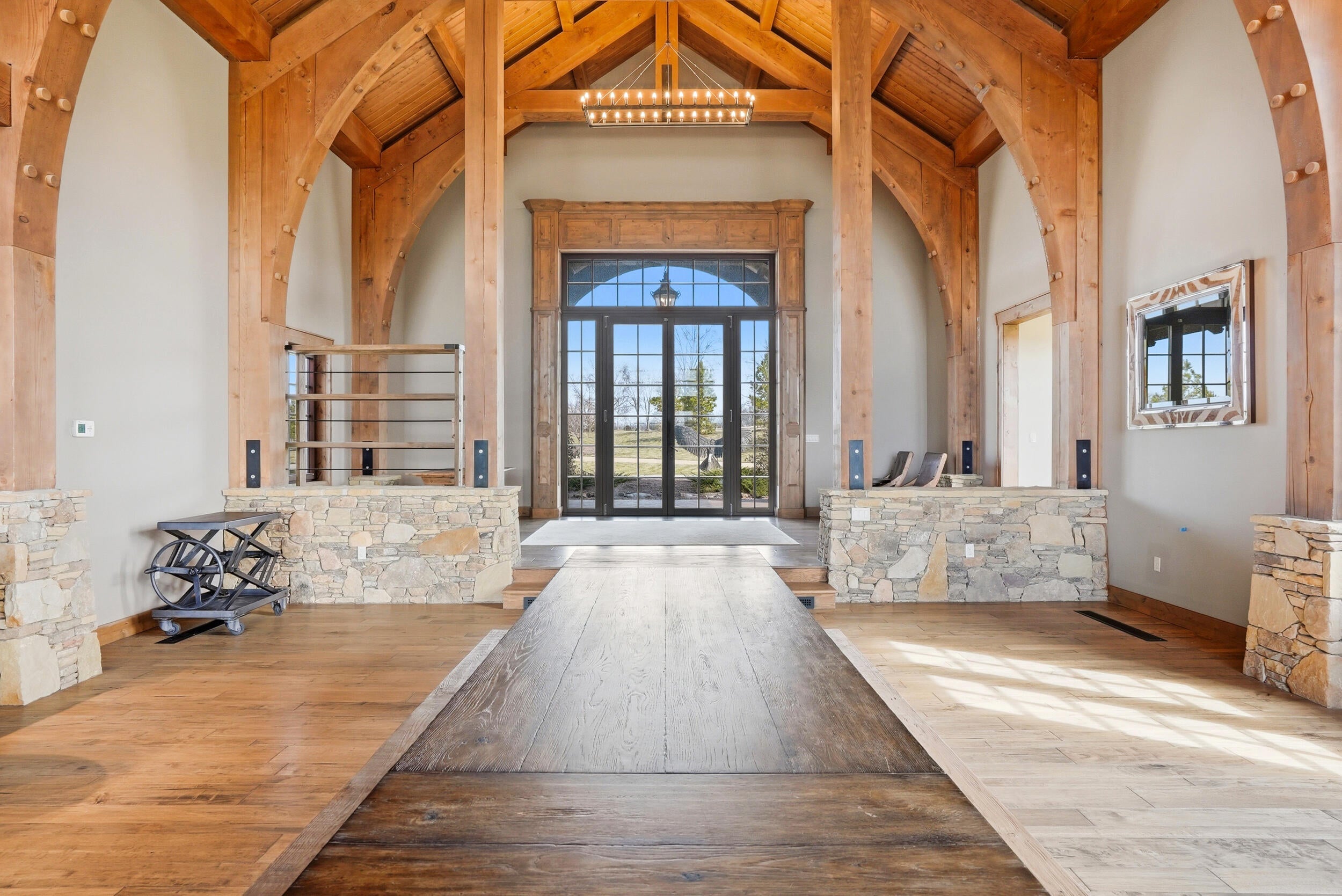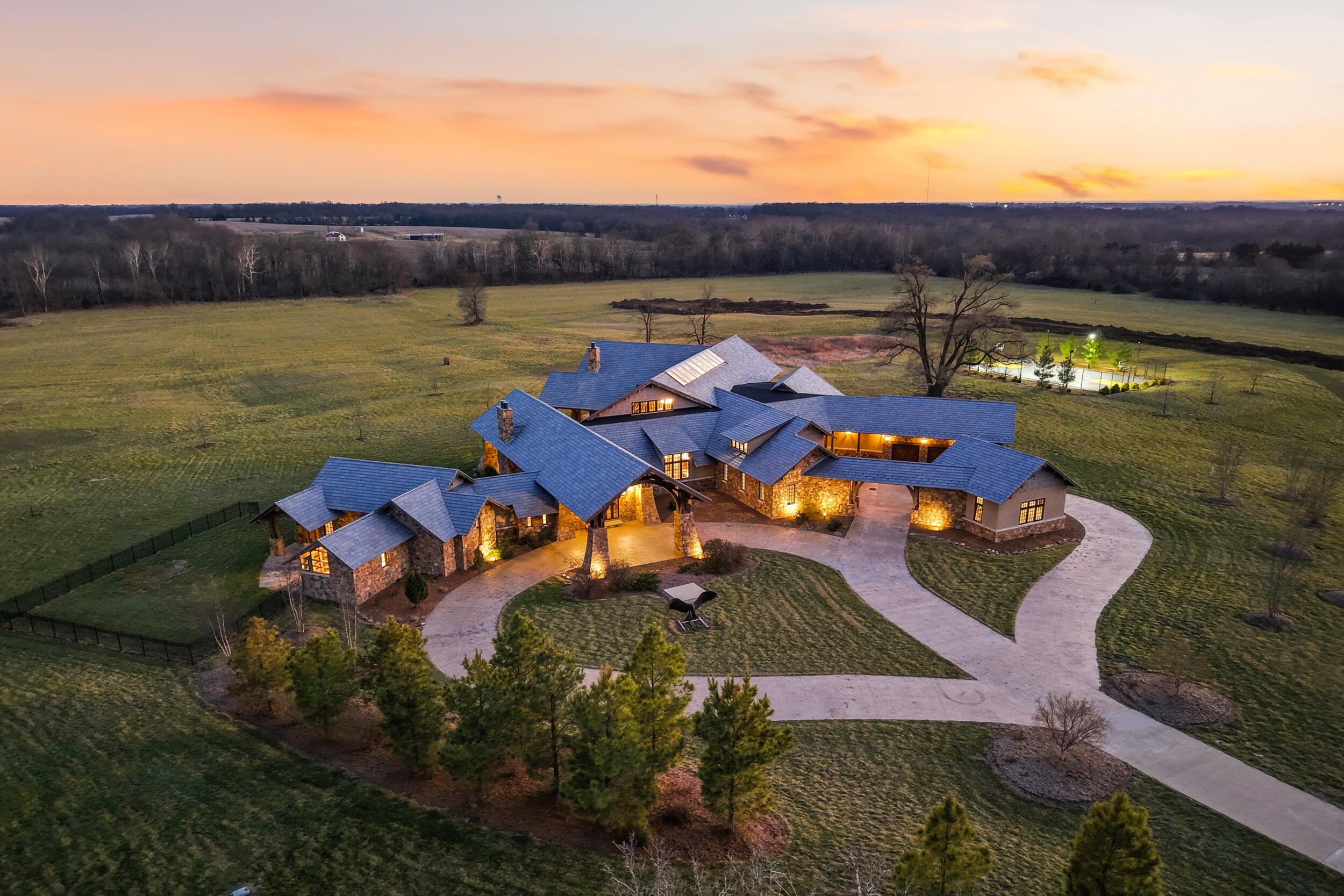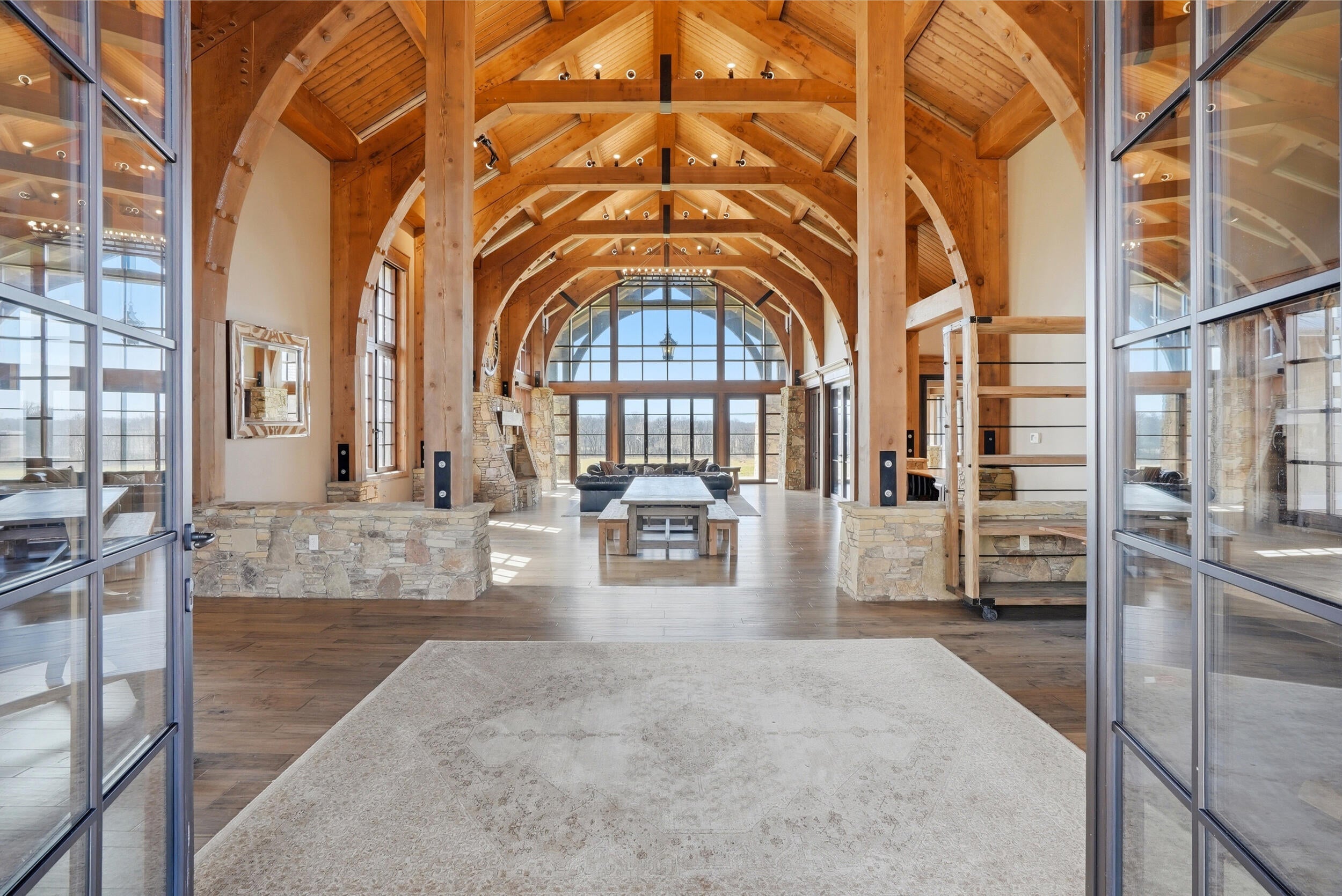 Set on 16 private acres, this custom estate blends refined luxury with breathtaking architectural detail. Designed by Brad Norris, it offers 5 bedrooms, 8 baths, dual living areas, an 8-car garage, and soaring timber-framed ceilings.