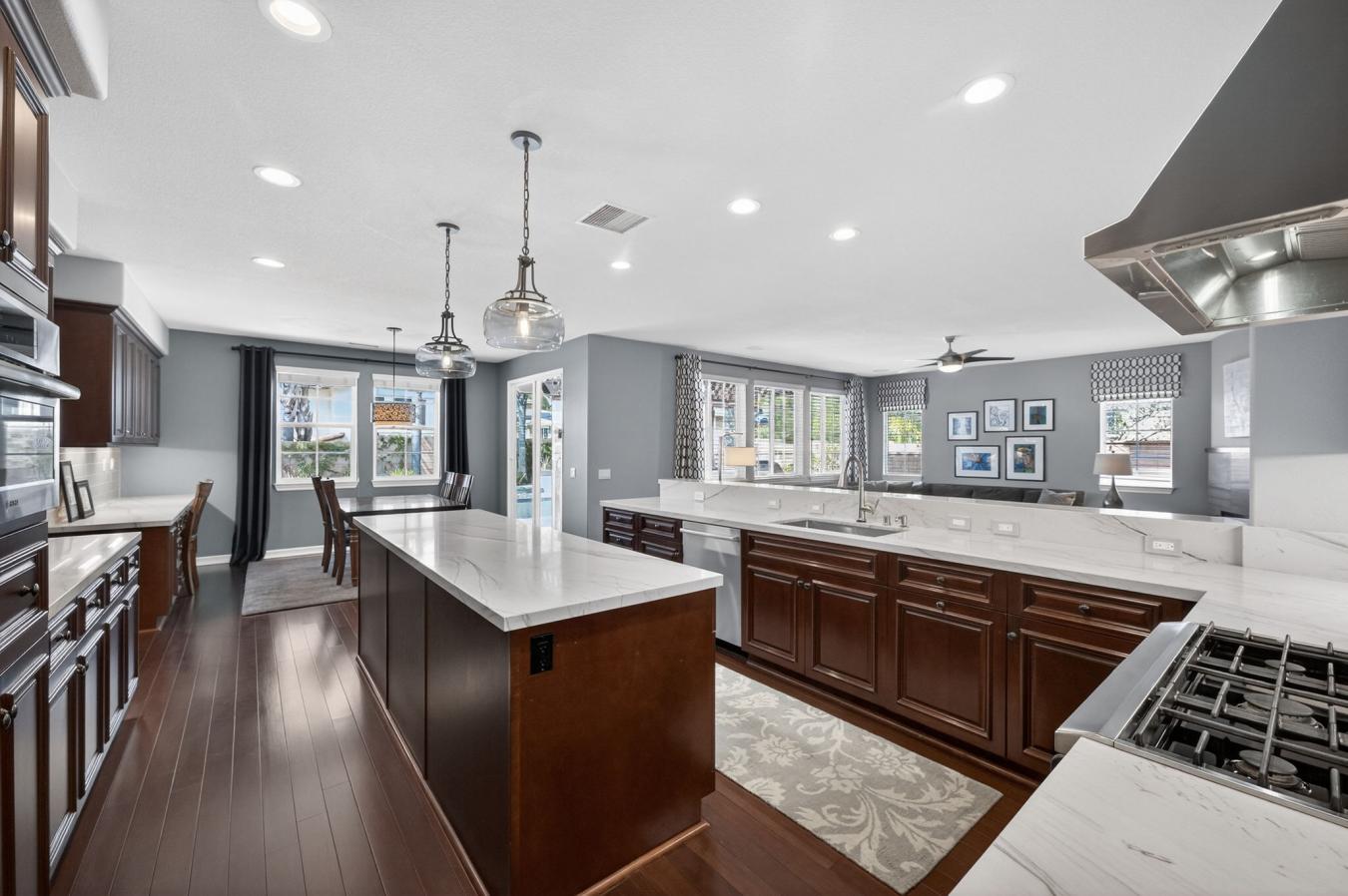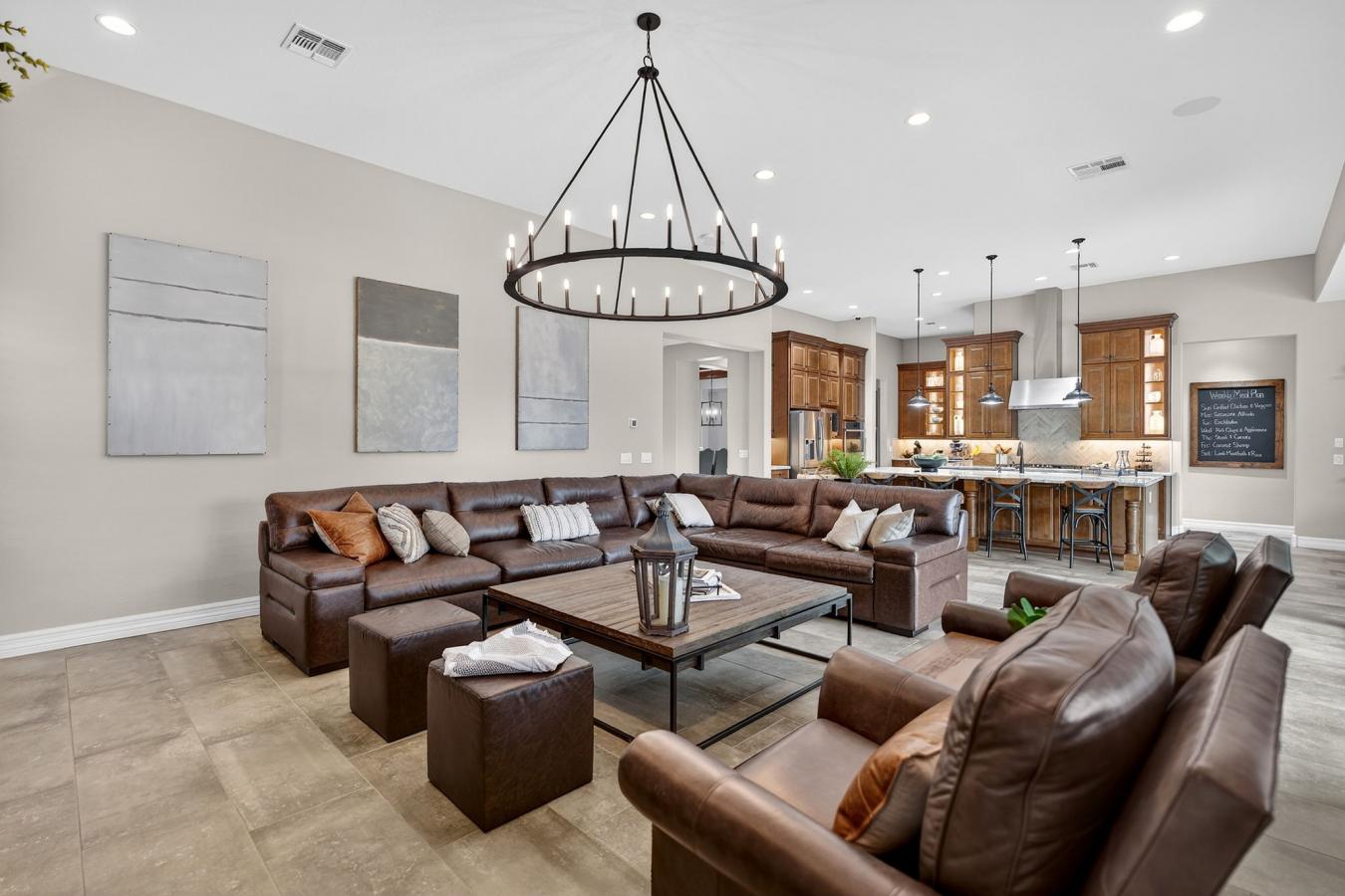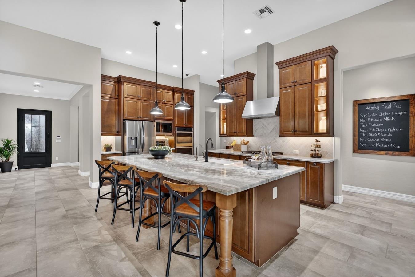 Resort-style living in Queen Creek, AZ. This beautifully designed home offers the elevated finishes and indoor-outdoor lifestyle buyers are searching for in Queen Creek real estate. The open-concept layout features a chef-inspired kitchen with rich custom cabinetry, expansive island seating, and seamless flow into the dining area and spacious living room.