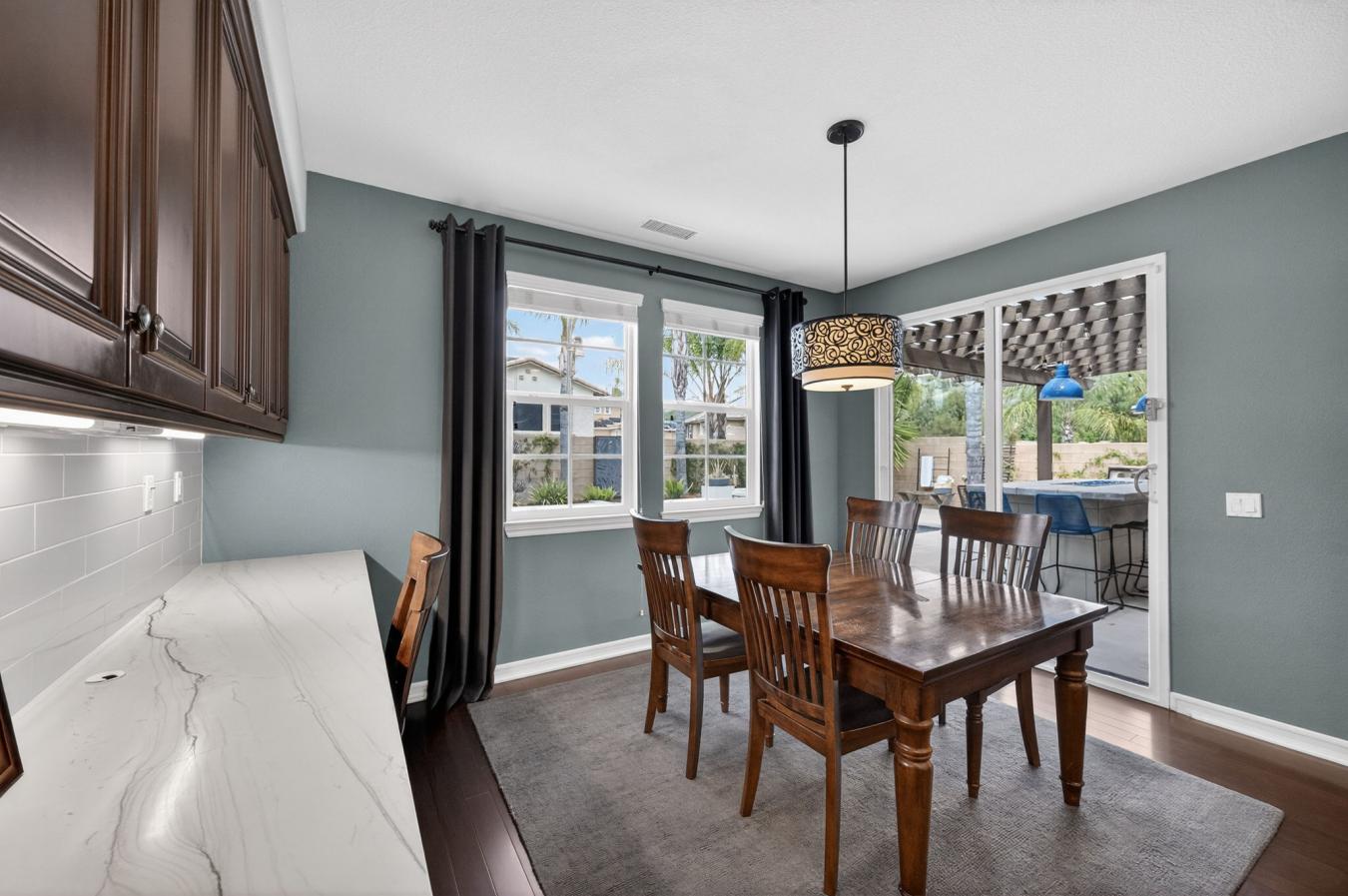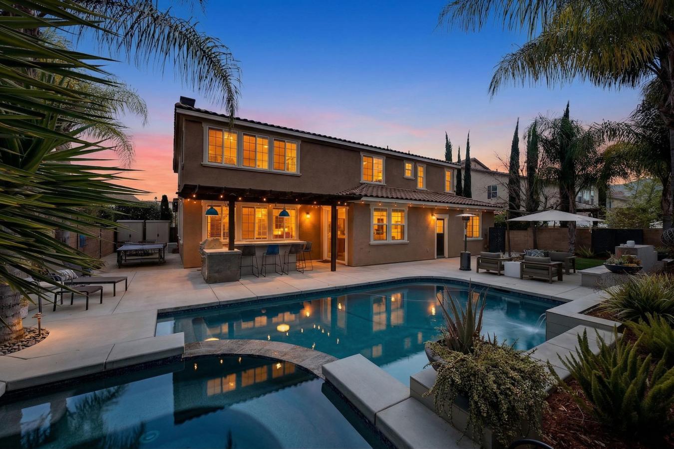 Welcome to an exceptional residence in the highly sought-after Redwood Collection of Wolf Creek, tucked away on a quiet cul-de-sac in South Temecula. Offering over 4,000 square feet of well-designed, thoughtfully updated living space, this 5-bedroom, 4.5-bathroom home, complete with a private office, blends timeless elegance with everyday comfort. A beautifully landscaped front yard welcomes you inside to formal living and dining spaces designed for both intimate gatherings and elevated entertaining. Rich bamboo flooring leads you into the heart of the home, where the family room invites you to relax by the fireplace while staying seamlessly connected to the kitchen. The chefs kitchen is both stylish and functional, featuring quartzite countertops, stainless steel appliances, an oversized island, and a 6-burner gas cooktop. A built-in study area in the breakfast nook adds convenience for work or creative projects, while the butlers pantry offers a seamless connection to the formal dining room. The main level also includes a private bedroom with an updated ensuite bath and direct backyard access, ideal for guests, a home office, or flexible living. A powder room with limestone countertops adds a refined touch. Upstairs, the primary suite offers a true retreat with dual walk-in closets and a beautifully upgraded bath featuring separate vanities, a soaking tub, and a spa-inspired walk-in shower with multiple shower features designed for a relaxing, resort-like experience. A spacious office provides additional living space, while three secondary bedrooms and two updated secondary bathrooms offer comfort and versatility. Step outside to a backyard designed for unforgettable moments. Host gatherings around the BBQ island complete with grill and refrigerator. Enjoy evenings around the island with generous seating for eight, where a central fire feature creates a warm ambient space for conversation. The saltwater pool and oversized spa make for a private resort feel, complemented by a stunning outdoor living area with a fireplace and a grassy yard for added flexibility. Living in Wolf Creek means access to top-rated schools, scenic walking trails, parks, and resort-style amenities. All just minutes from Temeculas renowned wine country, golf courses, shopping, and dining. This is more than a home; its a lifestyle defined by comfort, connection, and elevated living.