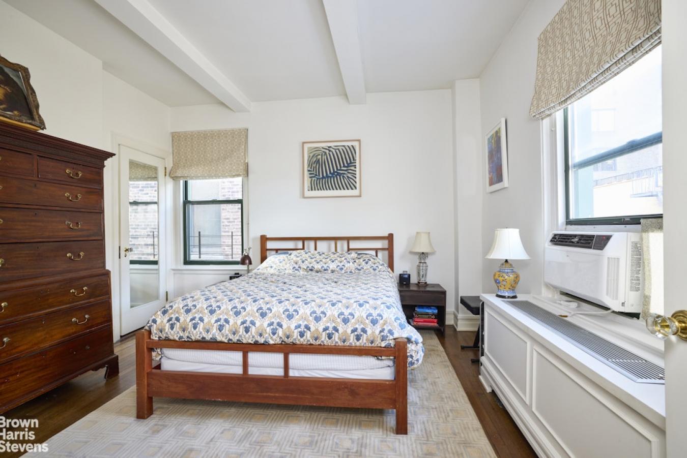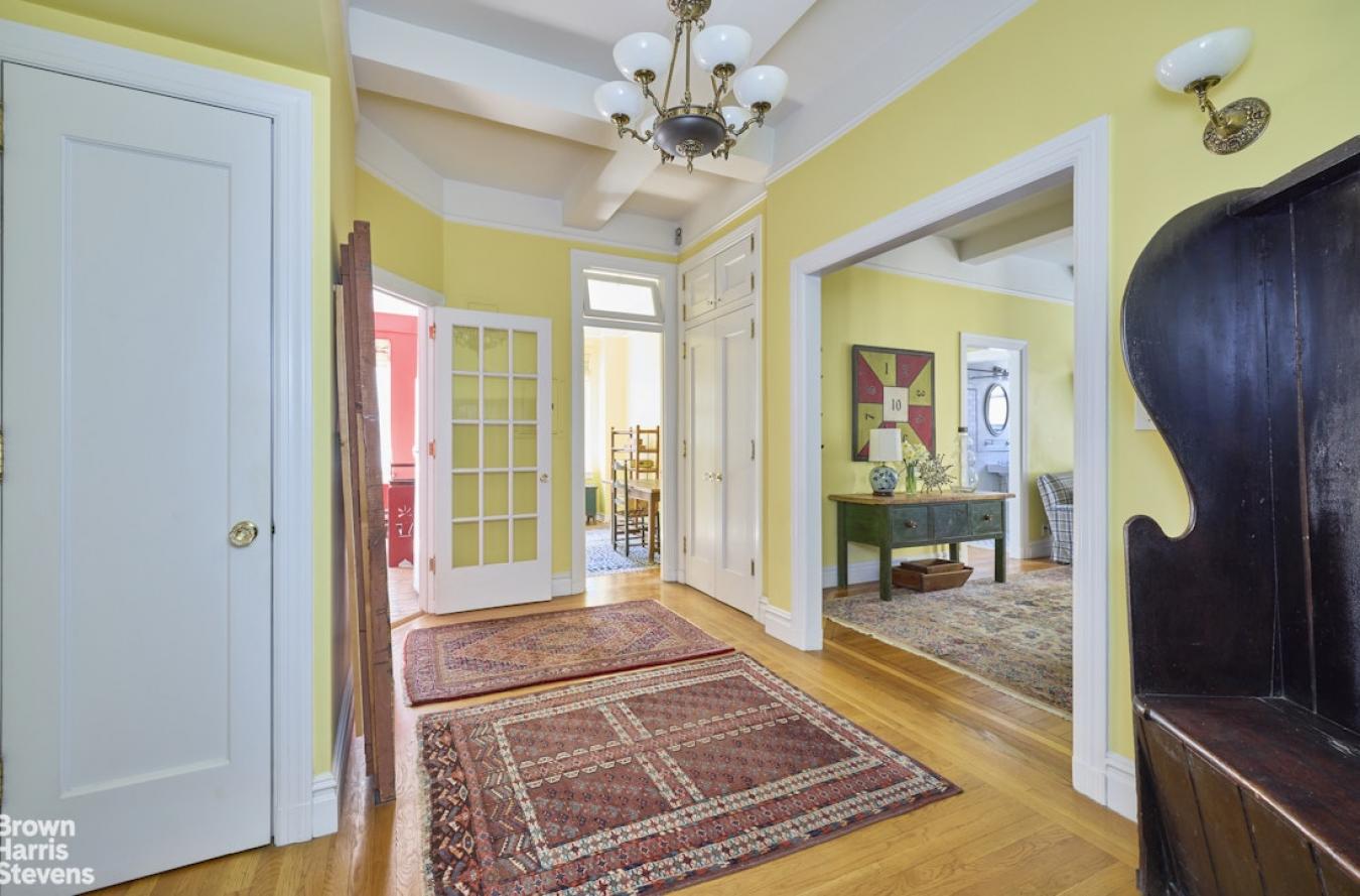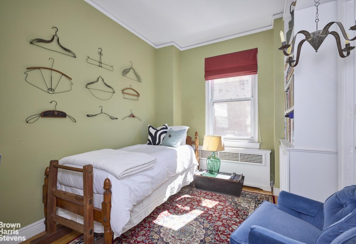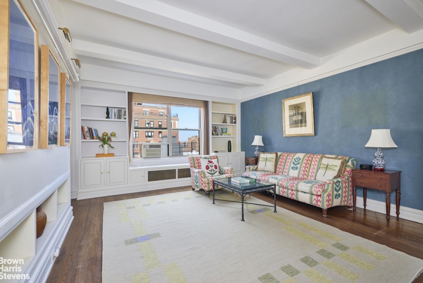 This welcoming pre-war Classic 5 features 10-foot beamed ceilings and original architectural details, along with two bedrooms, a bonus room that could serve as a nursery or office, and two bathrooms. Natural light bathes each room at different times of the day from three exposures and oversized windows, creating a bright and airy atmosphere throughout.