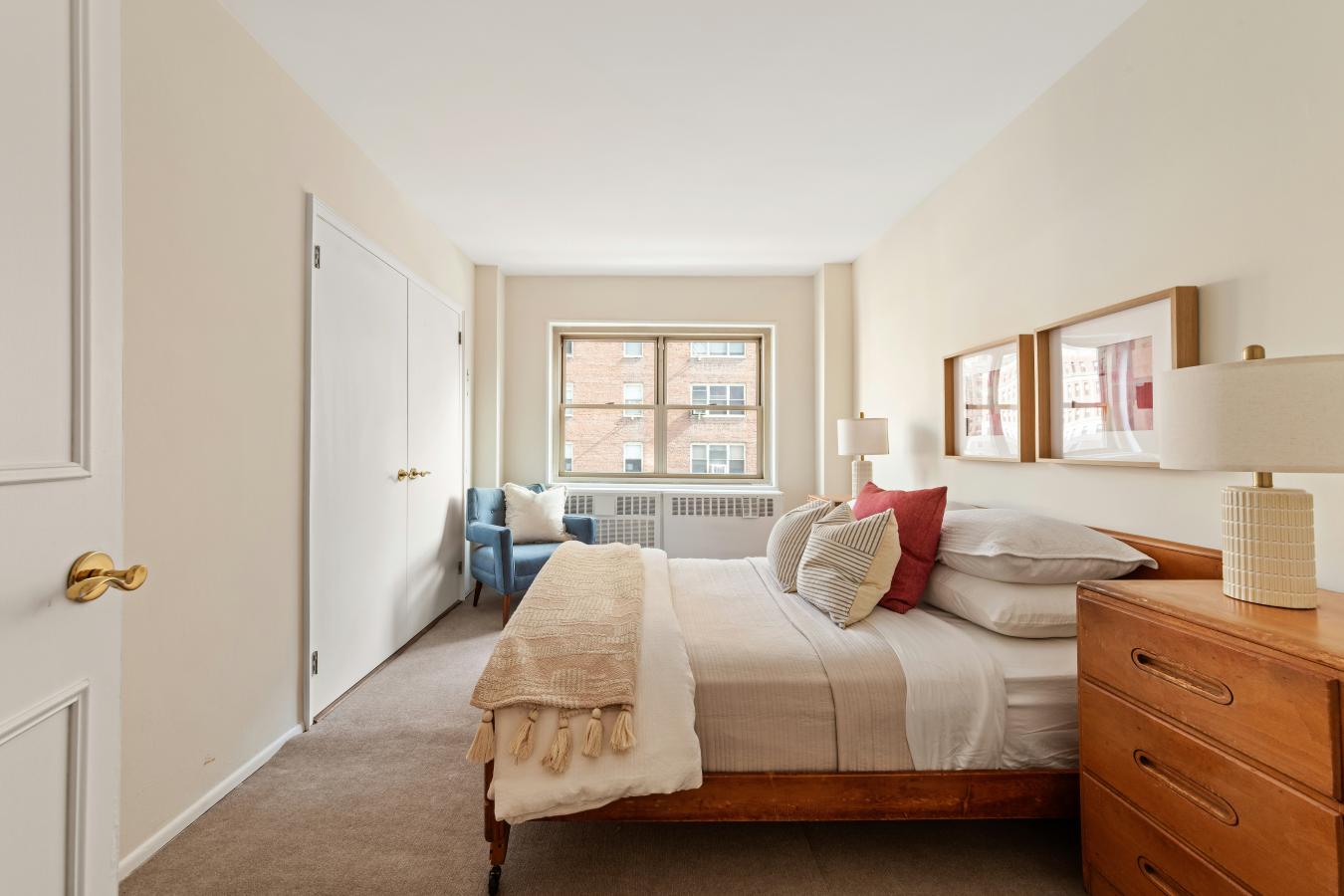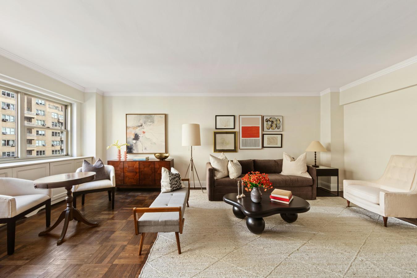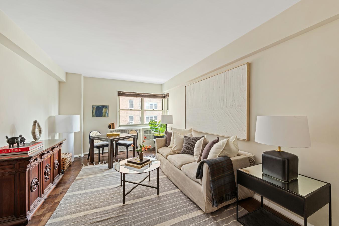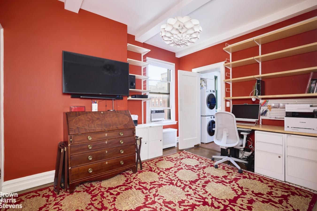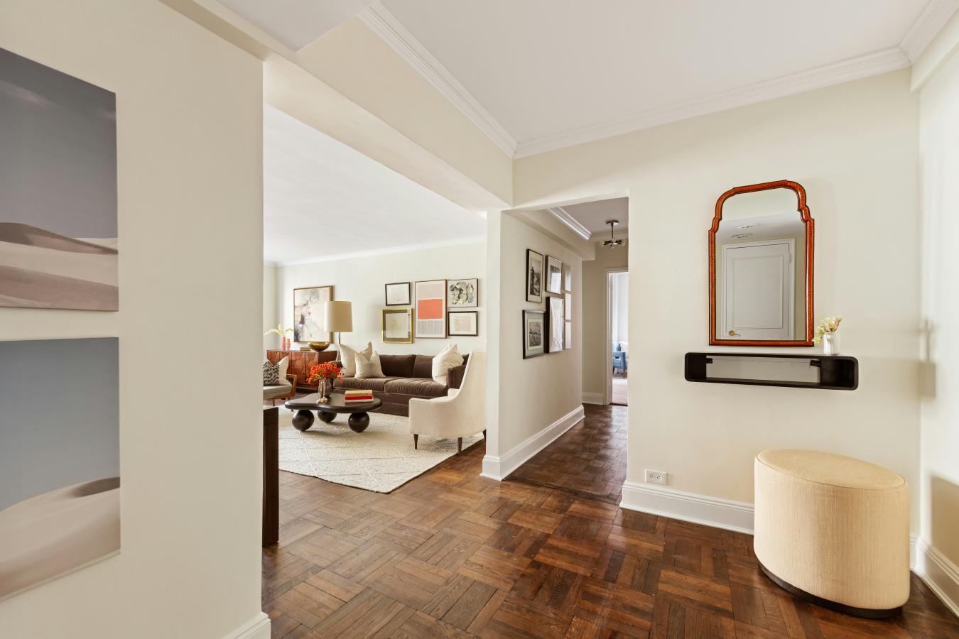 This welcoming pre-war Classic 5 features 10-foot beamed ceilings and original architectural details, along with two bedrooms, a bonus room that could serve as a nursery or office, and two bathrooms. Natural light bathes each room at different times of the day from three exposures and oversized windows, creating a bright and airy atmosphere throughout.
