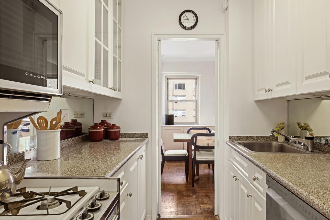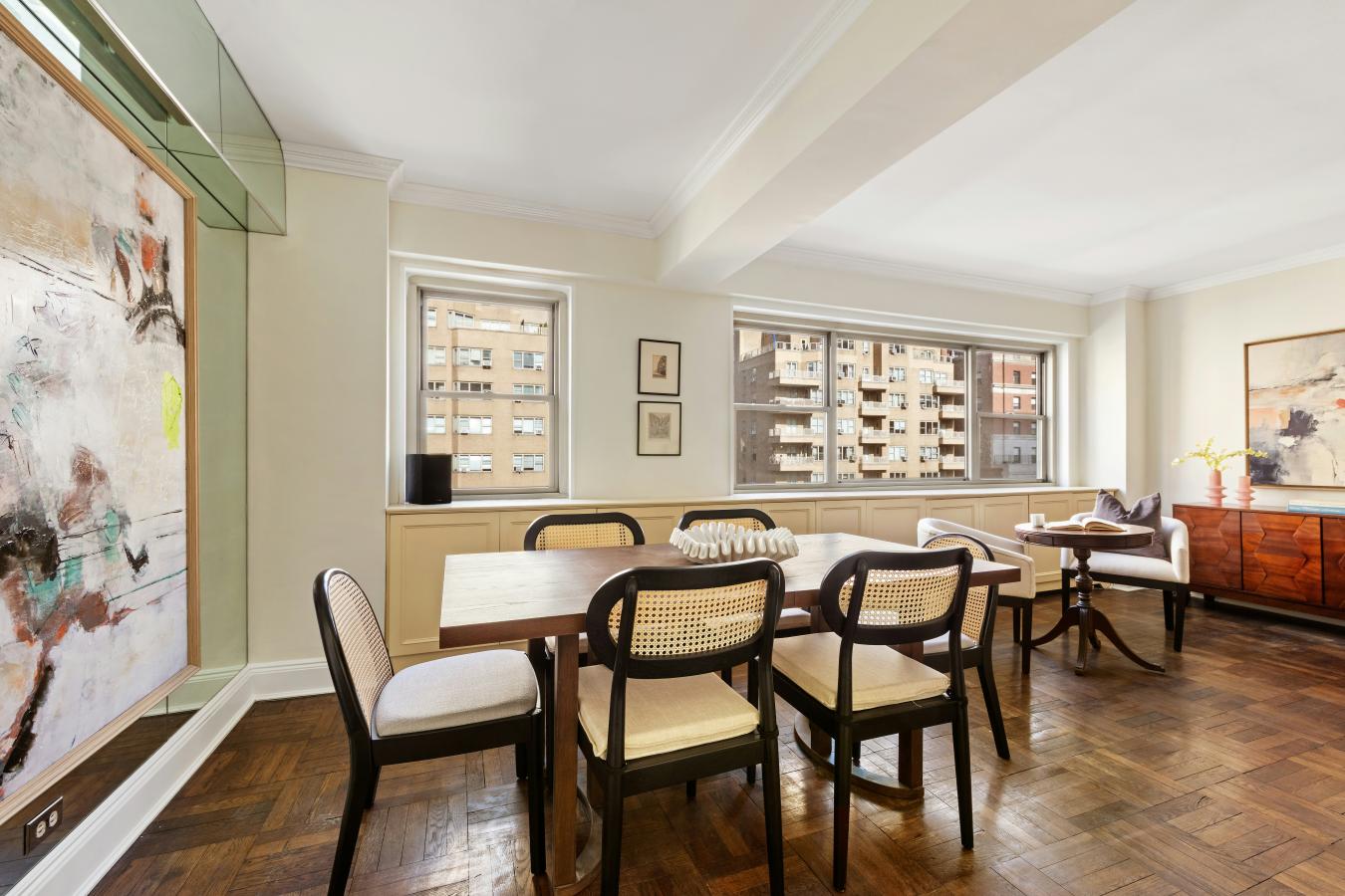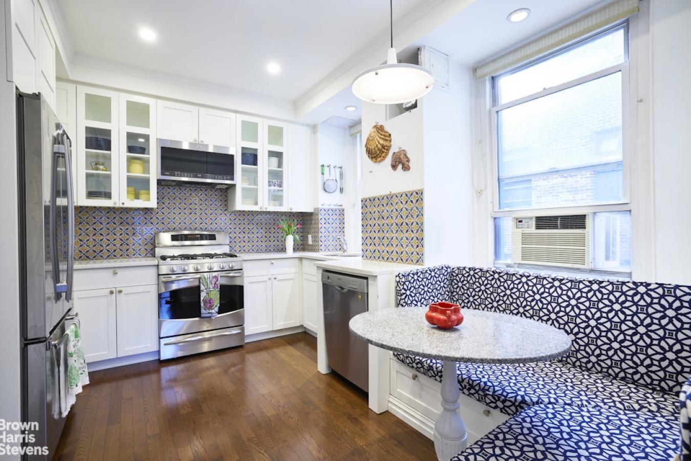 This spacious 3 bedroom plus den/office apartment has been masterfully combined weaving pre-war details into modern living. The entrance gallery opens to the living room and dining room with a wall of windows, lots of light and space for both formal dining as well as casual living. The eat-in kitchen features custom cabinetry, granite countertops, banquette seating and top of the line appliances.