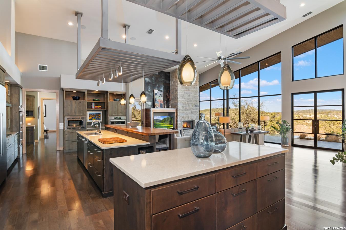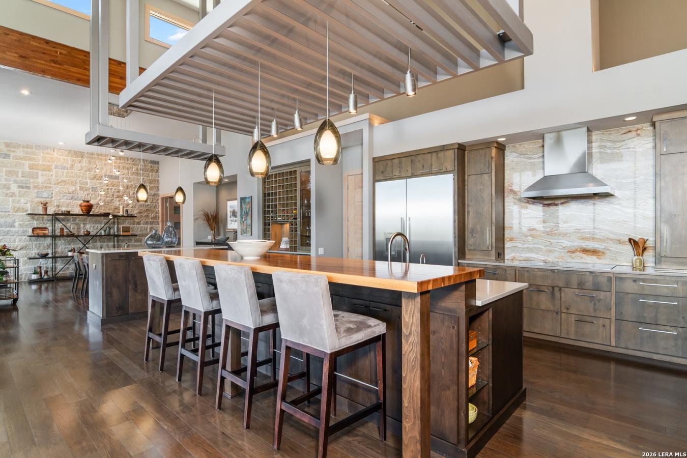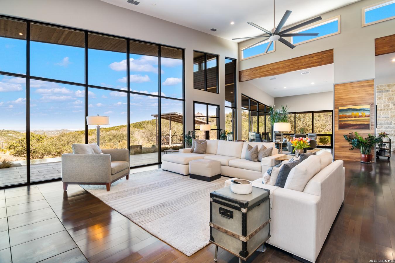 Welcome to 21604 Cielo Ridge Dr, constructed in 2015. This residence exudes a luxurious, high-end feel, inviting you to experience sophisticated living at its finest. Elegance meets functionality with an open-concept, custom-built design that radiates warmth and style. A breathtaking infinity-edge pool with travertine decking and a heated pool and spa takes center stage-all perfectly positioned to capture some of the most spectacular Hill Country views in San Antonio. Expansive outdoor living wraps gracefully around the front of the home, creating a stunning first impression. The open-concept design is elevated by dramatic floor-to-ceiling windows, flooding the home with natural light and framing breathtaking views while seamlessly blending indoor and outdoor living. The gourmet kitchen is a true showpiece, featuring sleek quartz countertops, a striking quartzite backsplash, and a beautifully crafted walnut wood island with a marine-grade finish. Designed for the culinary enthusiast, it includes a steam double oven, a wine refrigerator, and a range thoughtfully plumbed for gas-blending refined design with professional-level performance. Upgrades throughout the home reflect exceptional craftsmanship and elevated design, including a reverse osmosis water filtration system, a dramatic backlit onyx backsplash, rich walnut accent walls and flooring, and solid oak interior doors that add warmth, substance, and timeless sophistication.