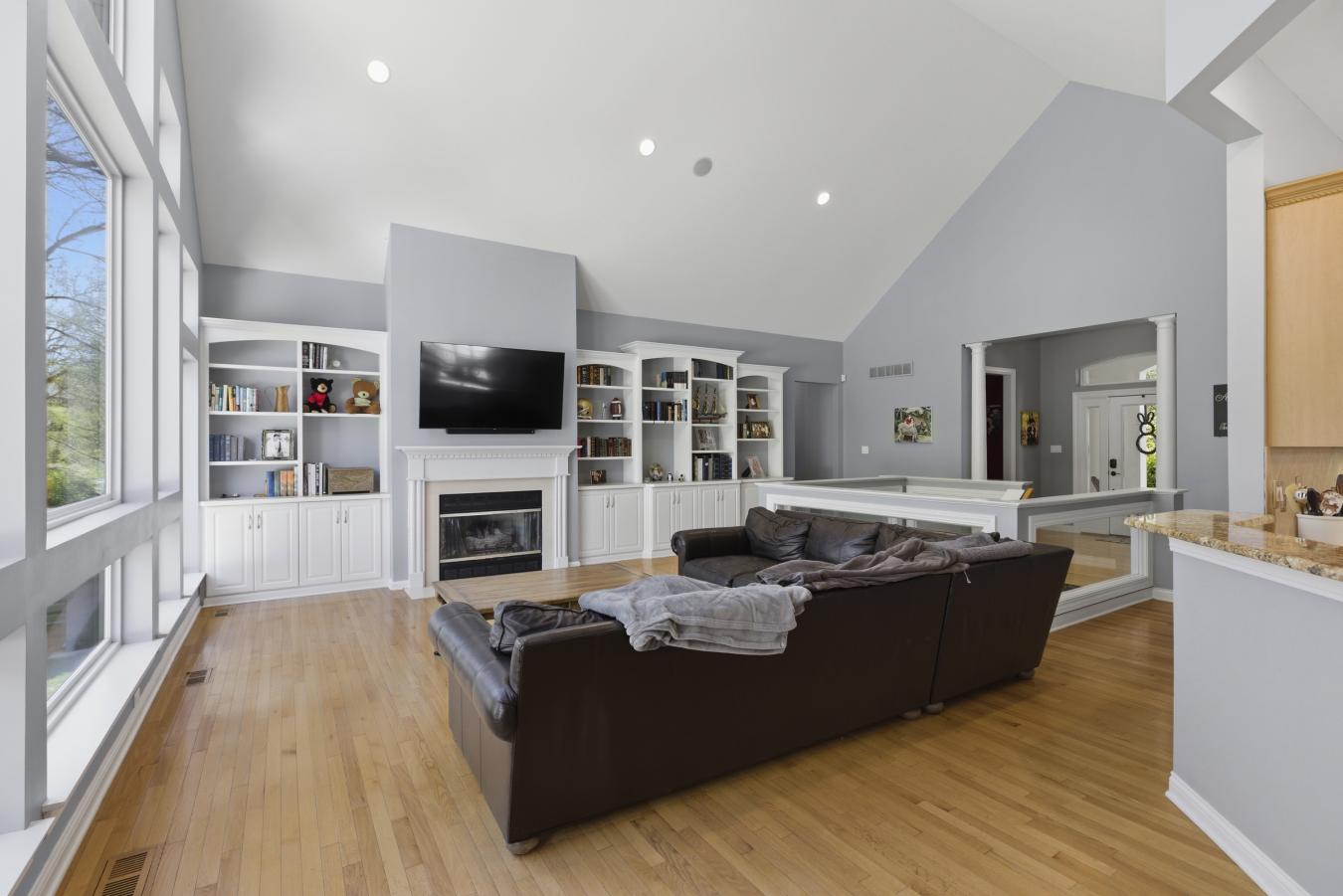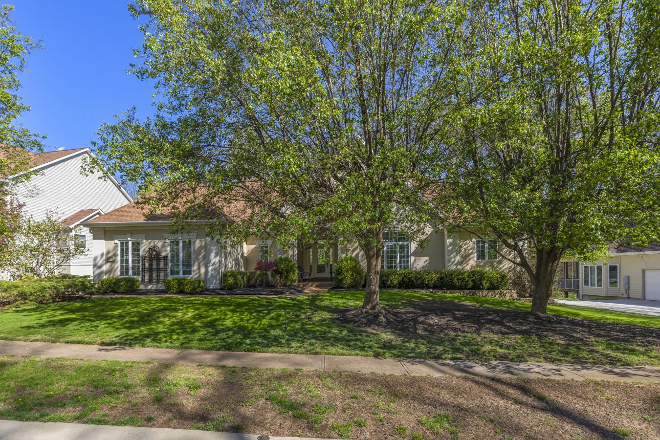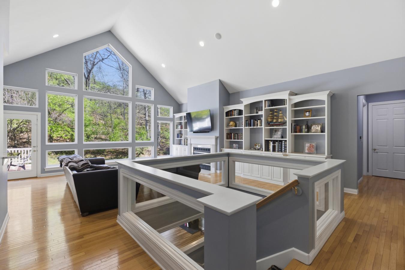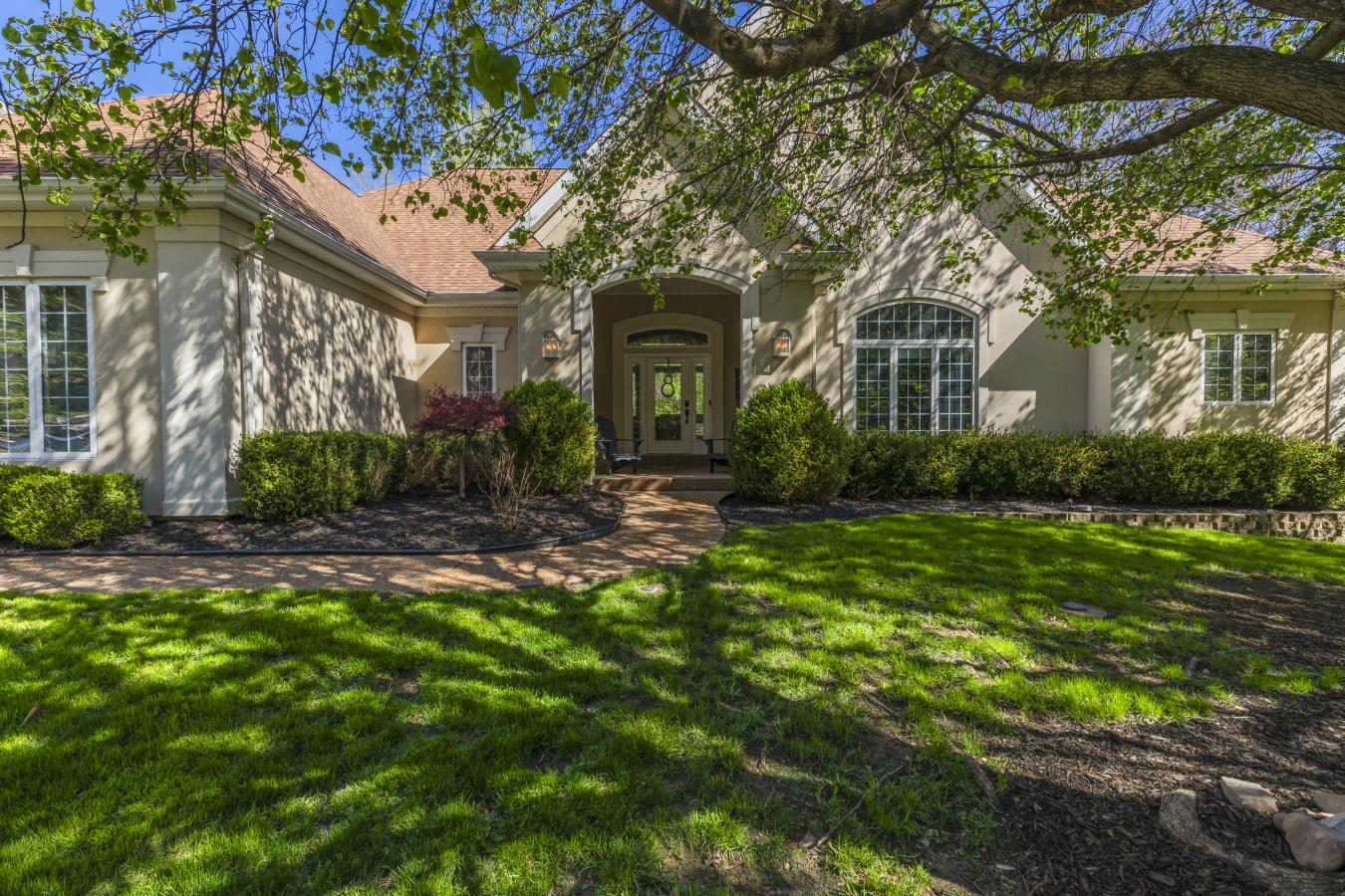 Stunning ranch-style home sitting on a 0.4 acre lot backing to woods, located in the sought-after Polo Lakes subdivision in Ellisville! This home boasts over 4,000 square feet of living space, 4 bedrooms, and 3.5 bathrooms. The front door opens to the entry foyer with a coat closet, columns, and gleaming hardwood floors that flow throughout most of the main level. The entry foyer opens to the office with crown molding and a new, custom bookcase (2025). The bright & airy great room features a wall of windows, gas fireplace, built-in bookshelves, vaulted ceiling, and opens to the kitchen and formal dining room with crown molding, columns, and a bay window. The kitchen boasts granite countertops, 42-inch cabinetry with crown molding, stainless steel appliances, a new Bosch dishwasher (2025), a new LG microwave (2025), double ovens, a refrigerator, which is included, a tile backsplash, a butterfly island, a dining area, a planning desk, a wine fridge, a pantry with new custom shelving (2025), and sliding glass doors to the 3-season room. The primary bedroom features crown molding, a see-through gas fireplace, plantation shutters, a huge freshly painted (2026) walk-in closet, and a luxurious bathroom. The primary bathroom boasts tile floors, a dual vanity, a soaking tub, a separate shower, the see-through fireplace, a water closet, and a linen closet. The powder room and laundry room with a utility sink complete the main floor. The lower level features a kitchen area, a huge recreation room, three bedrooms, two full hall bathrooms, and ample storage space. Other highlights include a 3-car garage with built-in shelving, zoned HVAC, an electric pet fence, and 10 foot ceilings. Relax in the 3-season room, on the composite back deck, or on the concrete back patio and enjoy the wildlife in the yard backing to woods! The hot tub on the back deck is included. The location could not be better-close to major highways, restaurants, shops, schools, and Bluebird Park! Part of the award-winning Rockwood School District!
