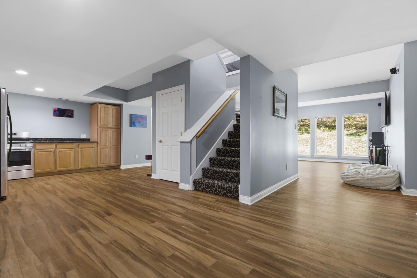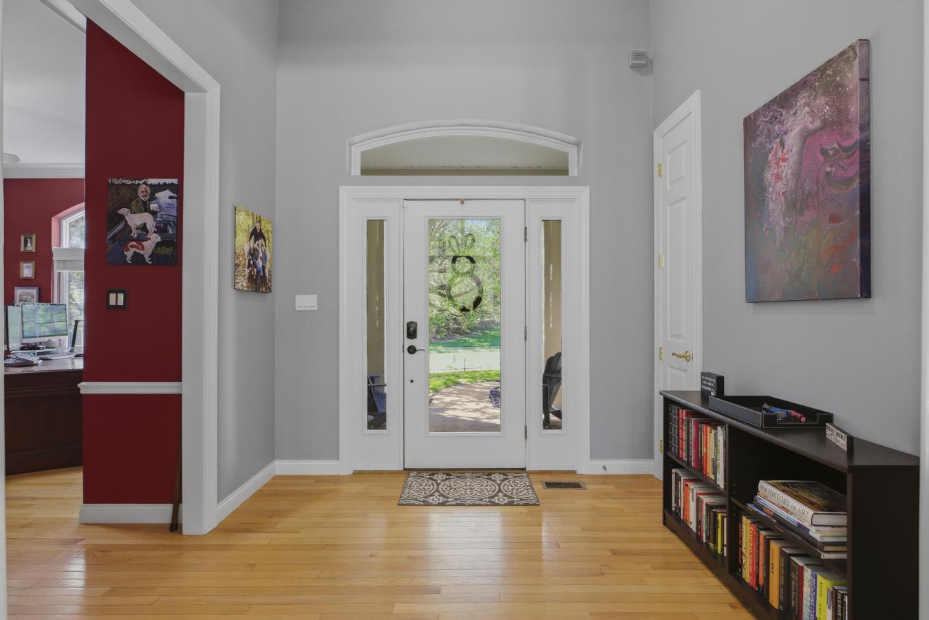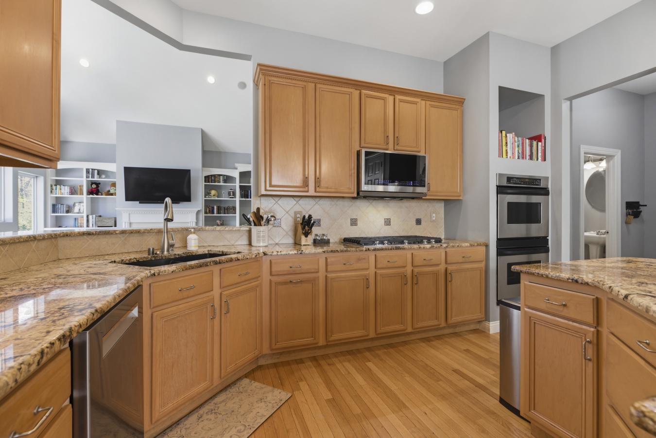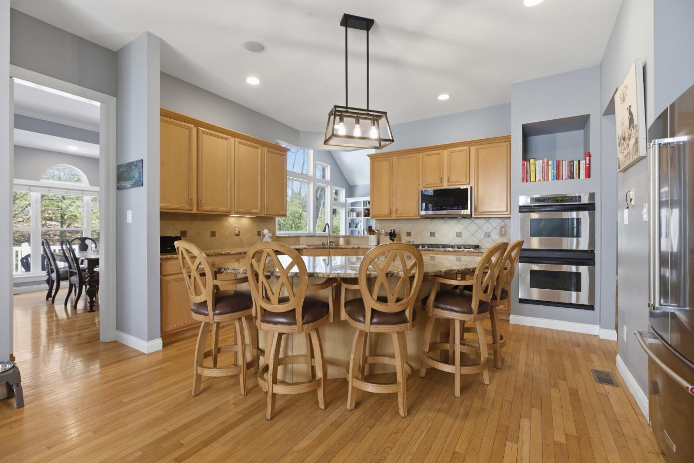 Stunning ranch-style home sitting on a 0.4 acre lot backing to woods, located in the sought-after Polo Lakes subdivision in Ellisville! This home boasts over 4,000 square feet of living space, 4 bedrooms, and 3.5 bathrooms. The front door opens to the entry foyer with a coat closet, columns, and gleaming hardwood floors that flow throughout most of the main level. The entry foyer opens to the office with crown molding and a new, custom bookcase (2025). The bright & airy great room features a wall of windows, gas fireplace, built-in bookshelves, vaulted ceiling, and opens to the kitchen and formal dining room with crown molding, columns, and a bay window. The kitchen boasts granite countertops, 42-inch cabinetry with crown molding, stainless steel appliances, a new Bosch dishwasher (2025), a new LG microwave (2025), double ovens, a refrigerator, which is included, a tile backsplash, a butterfly island, a dining area, a planning desk, a wine fridge, a pantry with new custom shelving (2025), and sliding glass doors to the 3-season room. The primary bedroom features crown molding, a see-through gas fireplace, plantation shutters, a huge freshly painted (2026) walk-in closet, and a luxurious bathroom. The primary bathroom boasts tile floors, a dual vanity, a soaking tub, a separate shower, the see-through fireplace, a water closet, and a linen closet. The powder room and laundry room with a utility sink complete the main floor. The lower level features a kitchen area, a huge recreation room, three bedrooms, two full hall bathrooms, and ample storage space. Other highlights include a 3-car garage with built-in shelving, zoned HVAC, an electric pet fence, and 10 foot ceilings. Relax in the 3-season room, on the composite back deck, or on the concrete back patio and enjoy the wildlife in the yard backing to woods! The hot tub on the back deck is included. The location could not be better-close to major highways, restaurants, shops, schools, and Bluebird Park! Part of the award-winning Rockwood School District!