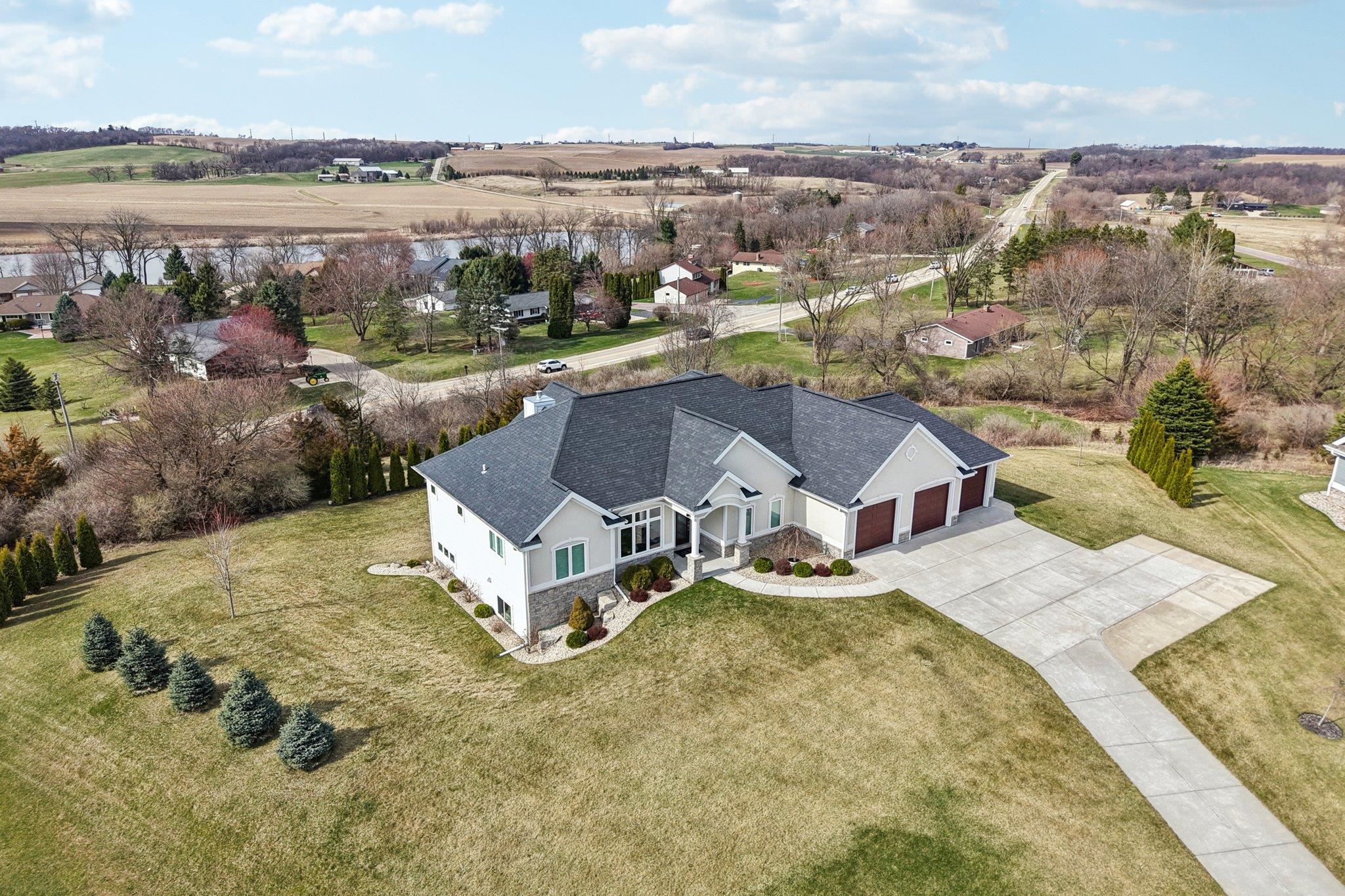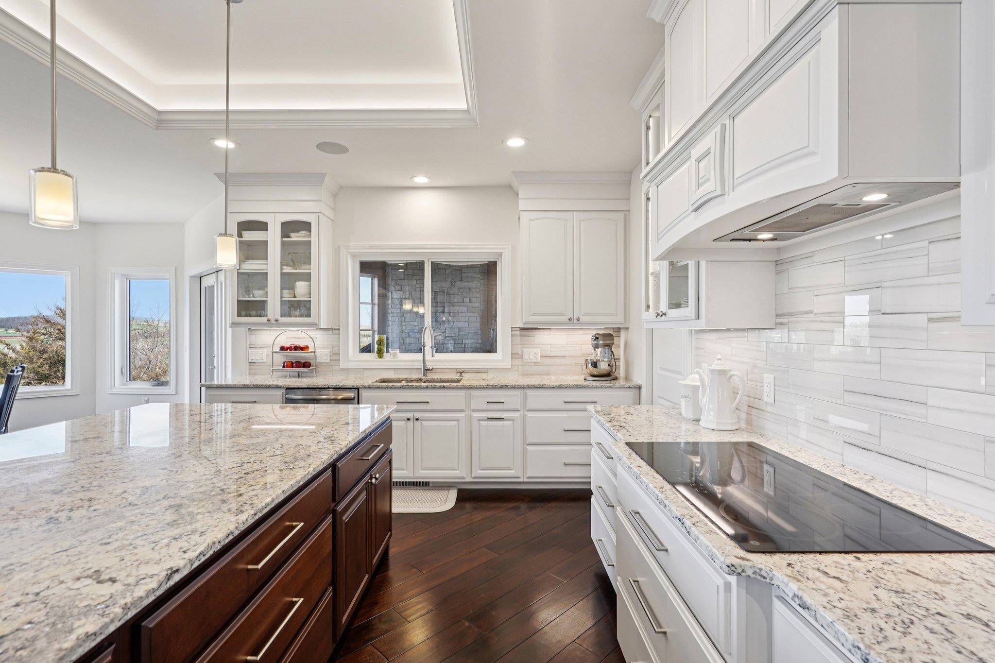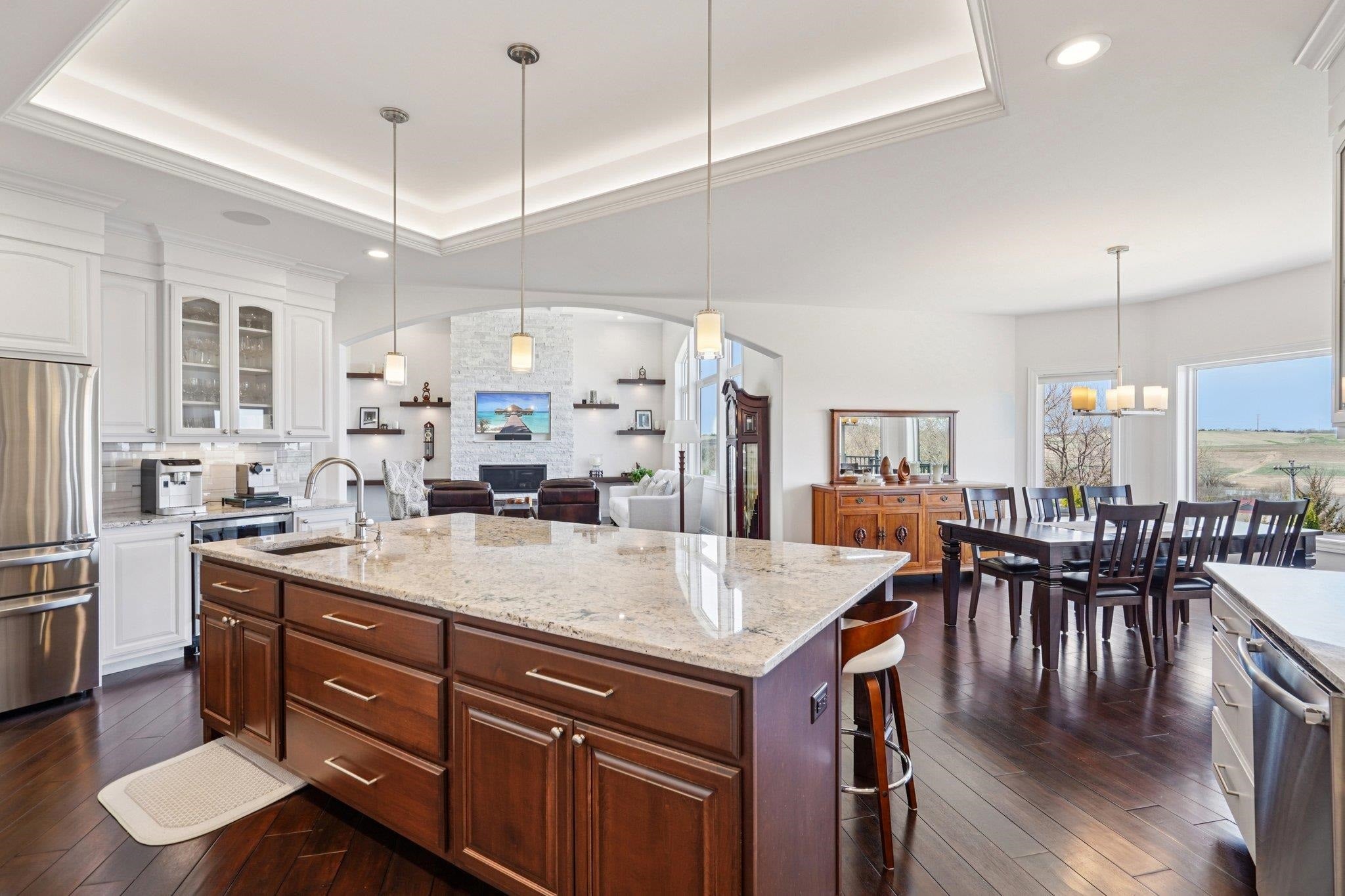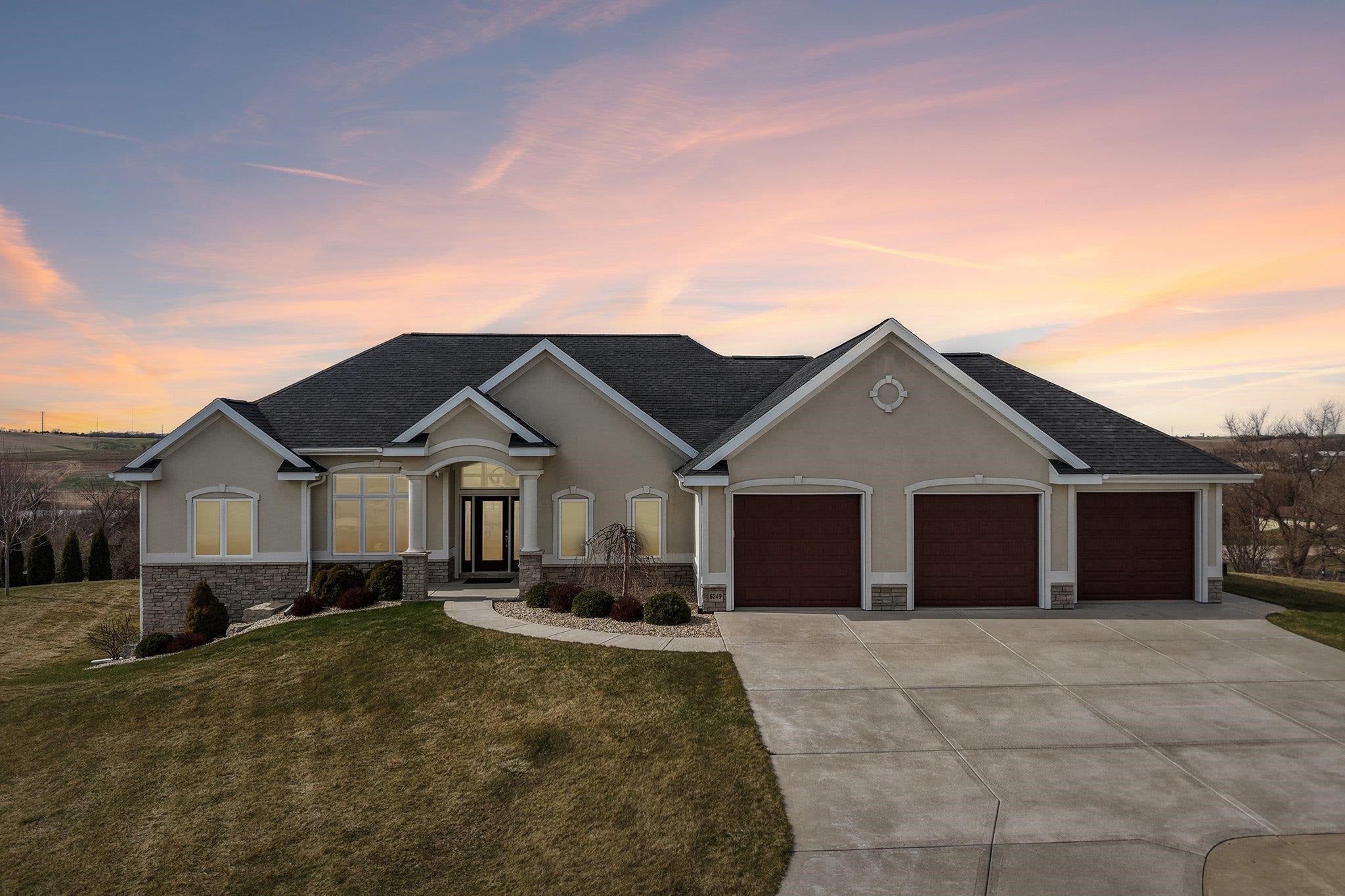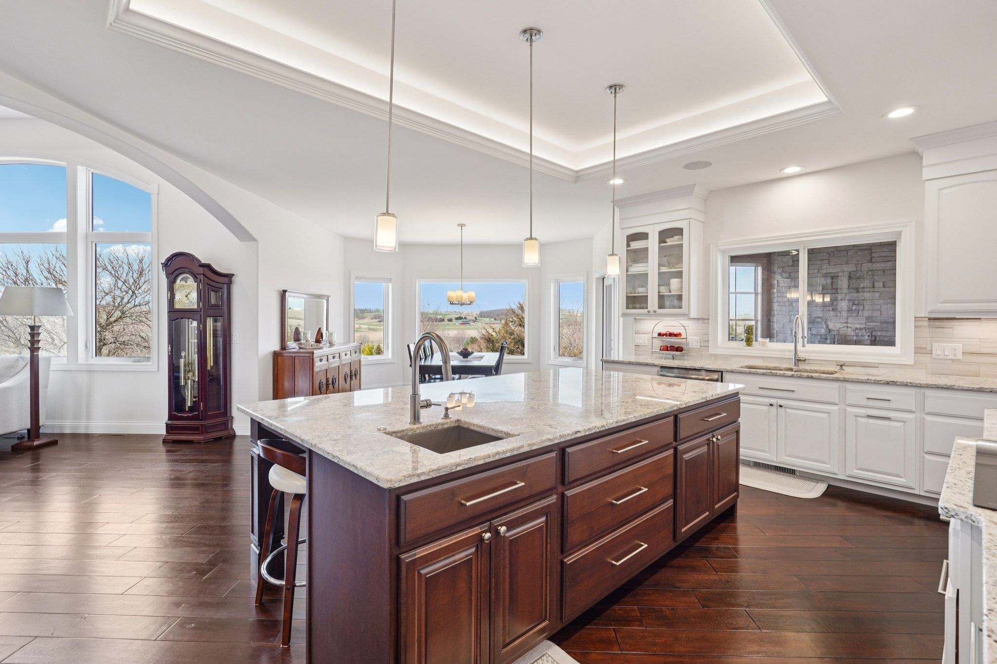 MAGNIFICENT VIEWS OF THE COUNTRYSIDE & ROLLING HILLS on Over 1.5 Acre Private Lot! STUNNING RANCH HOME Features Zero Step Entry, 5 Bedrooms, 3.5 Baths, Sun Room w/Fireplace, 3.5 Car Garage, 1st Floor Office & 1st Floor Laundry Everything You Need on the Main Level! CHEFS DREAM KITCHEN Boasts Custom White Cabinets to the Ceiling, Granite Countertops, HUGE Work Island w/Prep Sink, Large Walk-in Pantry, Beverage Fridge & Dinette Area that Opens into the Great Room w/Gas Fireplace w/Custom Floating Shelves13 Ft Coffered Ceilings! TWO LUXURY Primary Suites on Main Leveleach w/Walk-in Closets&Private Full Baths Featuring Large Walk-In Tile Showers & Quartz Countertops! Incredible Walk-Out L/L Offers a Spacious Family Room Plumbed for Wet BarTheater Room! Tons of Closets & Storage Space! Zoned Heating/CoolingGerkin Windows! Enjoy the PRIVATE Yard w/Mature Trees Your Own Nature Retreat! 5th Bedrm could be a Flex Rm or Office w/Sink! HUMONGOUS STORAGE AREA OUTSIDE UNDER DECK & SUN ROOM!