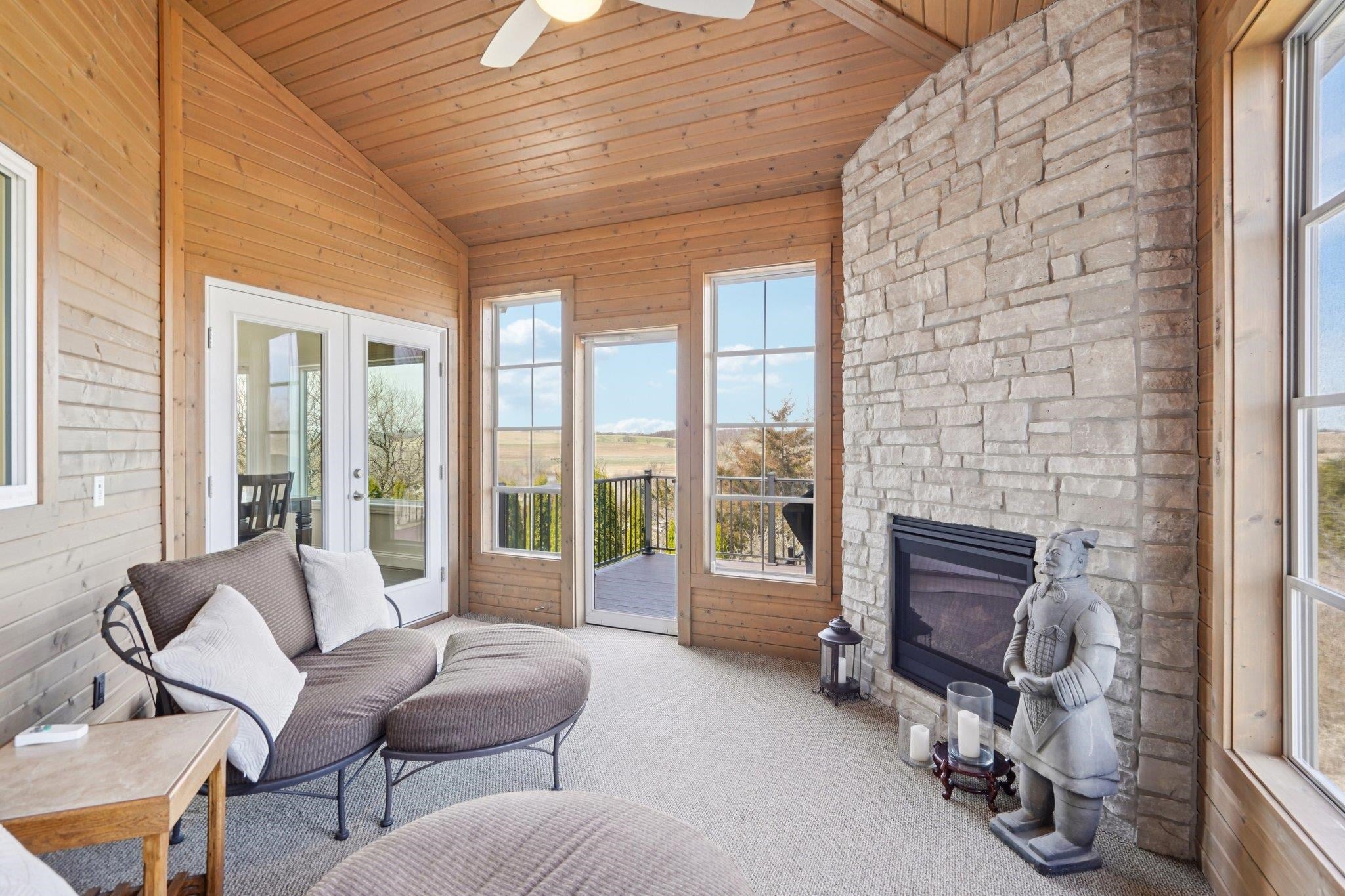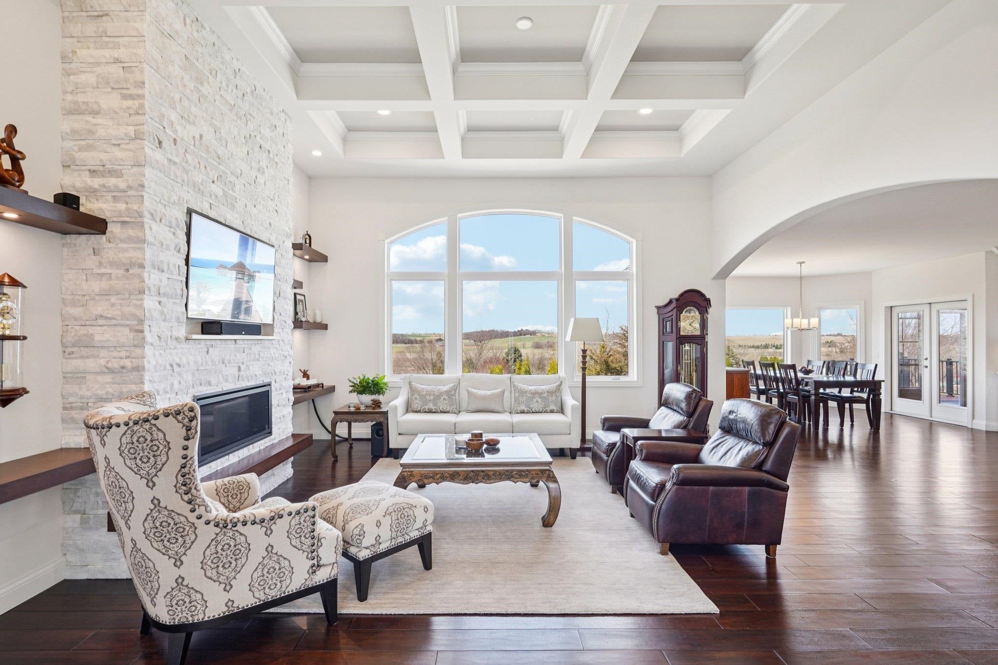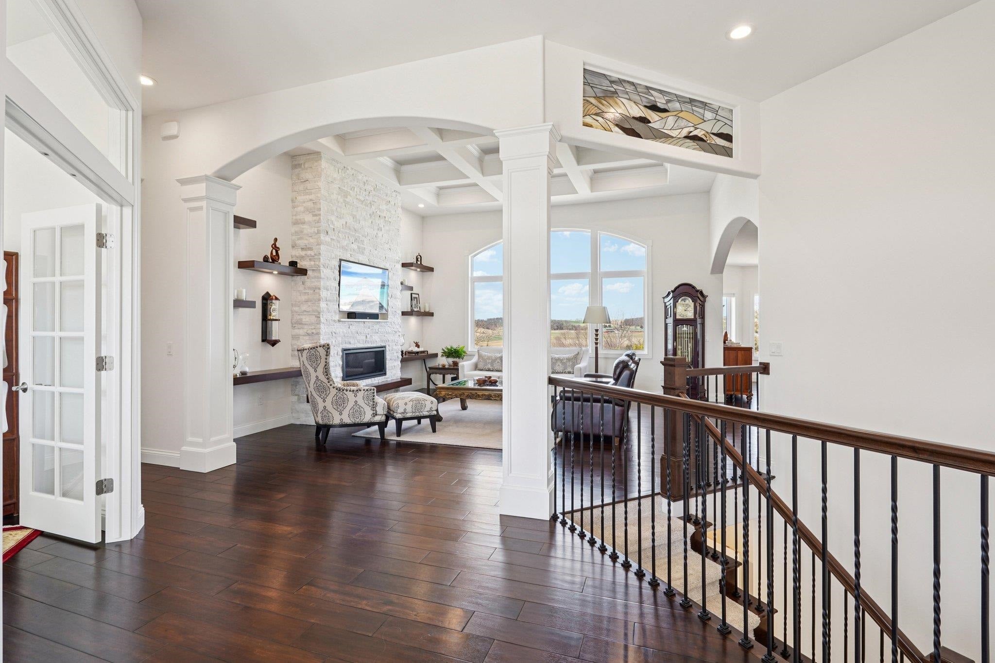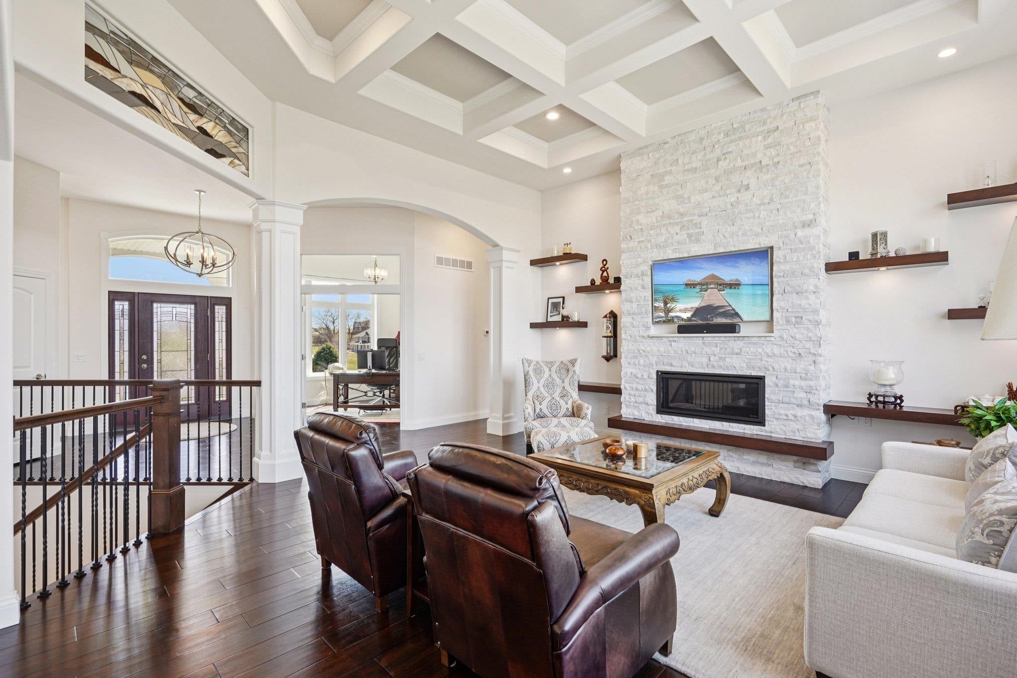MAGNIFICENT VIEWS OF THE COUNTRYSIDE & ROLLING HILLS on Over 1.5 Acre Private Lot! STUNNING RANCH HOME Features Zero Step Entry, 5 Bedrooms, 3.5 Baths, Sun Room w/Fireplace, 3.5 Car Garage, 1st Floor Office & 1st Floor Laundry Everything You Need on the Main Level! CHEFS DREAM KITCHEN Boasts Custom White Cabinets to the Ceiling, Granite Countertops, HUGE Work Island w/Prep Sink, Large Walk-in Pantry, Beverage Fridge & Dinette Area that Opens into the Great Room w/Gas Fireplace w/Custom Floating Shelves13 Ft Coffered Ceilings! TWO LUXURY Primary Suites on Main Leveleach w/Walk-in Closets&Private Full Baths Featuring Large Walk-In Tile Showers & Quartz Countertops! Incredible Walk-Out L/L Offers a Spacious Family Room Plumbed for Wet BarTheater Room! Tons of Closets & Storage Space! Zoned Heating/CoolingGerkin Windows! Enjoy the PRIVATE Yard w/Mature Trees Your Own Nature Retreat! 5th Bedrm could be a Flex Rm or Office w/Sink! HUMONGOUS STORAGE AREA OUTSIDE UNDER DECK & SUN ROOM!