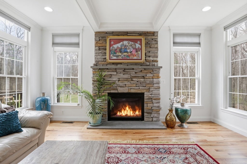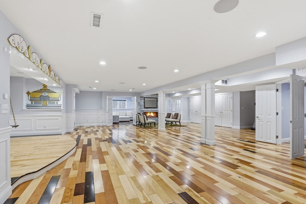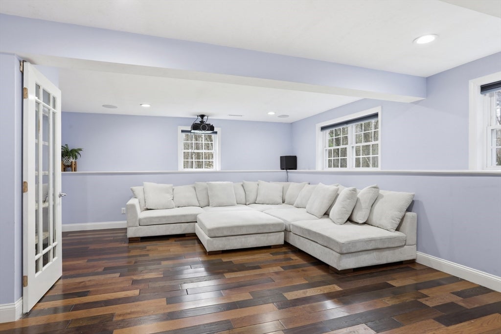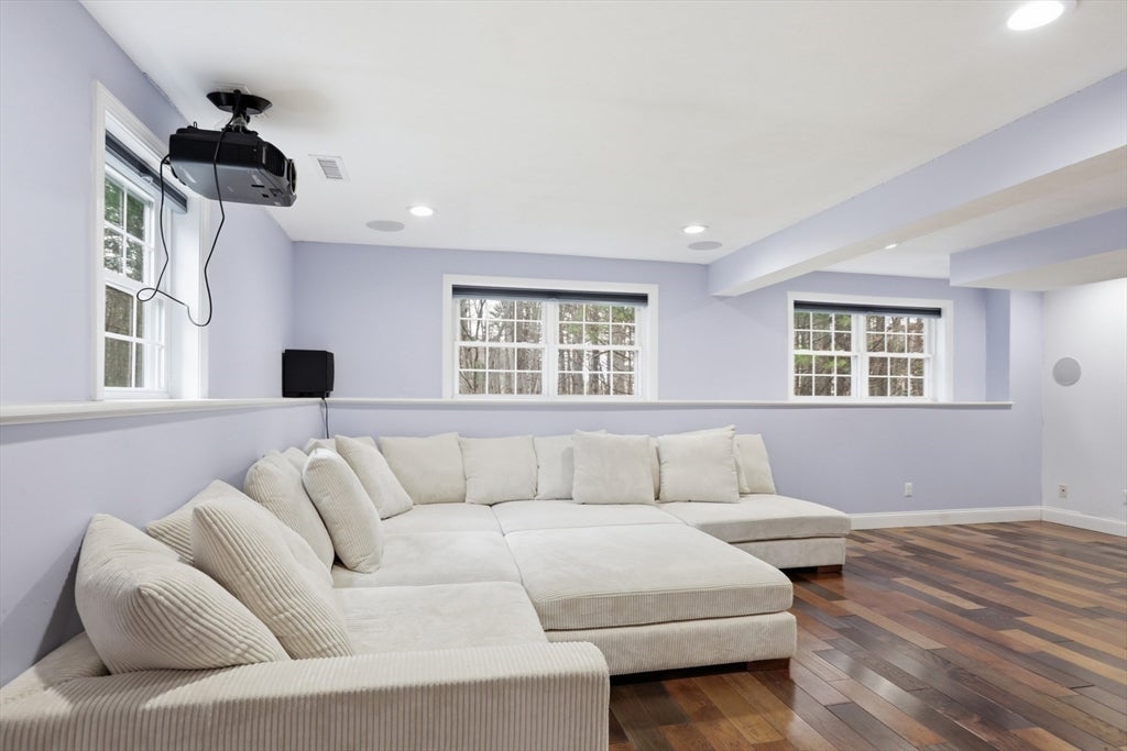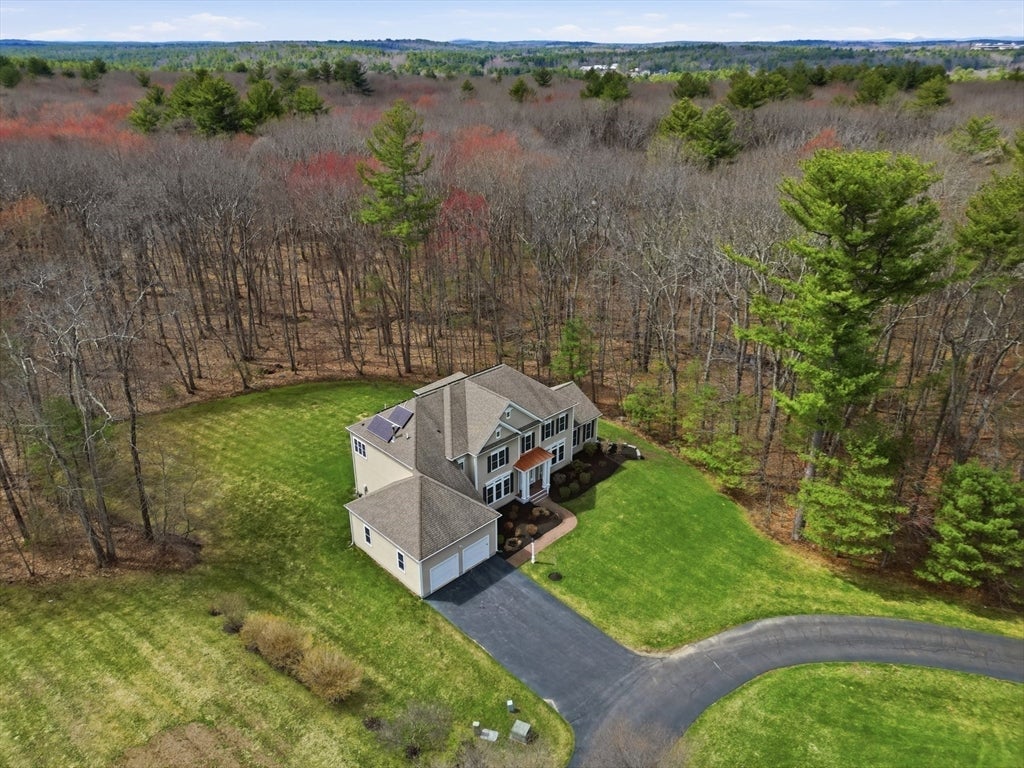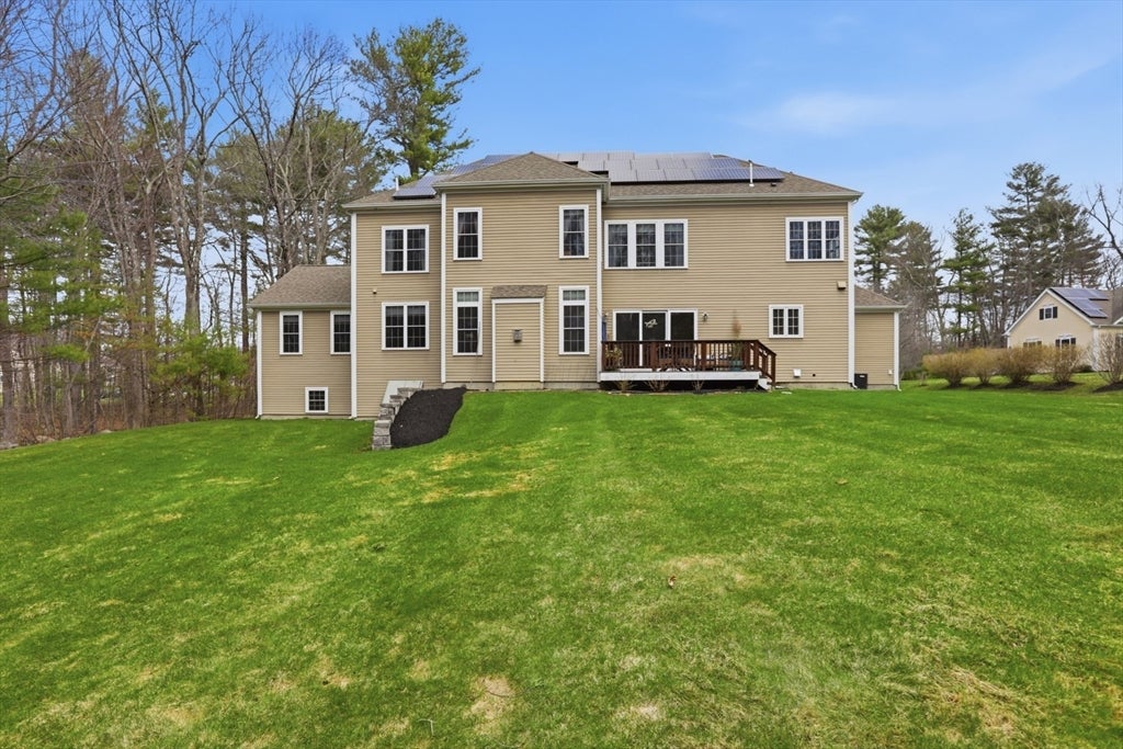Set back from the main road, this stately Robbins Mill Colonial stands proud on one of the best lots in the neighborhood abutting conservation land and with lawn enough for field sports plus a future pool. A dramatic two-story foyer with an elegant crystal chandelier welcomes you to this open floor plan with flexible spaces. The gourmet kitchen impresses with a large island, quartz countertops and backsplash, and an easy flow into back yard or the family room with its stone fireplace and coffered ceiling. Dedicated entertaining and office space, plus a 1st floor bonus room for work, play or hobbies complete the 1st floor. Upstairs, the primary suite offers generous closet space, a spa-like bath, and sitting area or extra office, plus there are 3 additional bedrooms with ensuite or shared bath. The lower level adds 2,500 SF including a theater room, Bose sound, bath, and potential for a home gym or in-law suite. Fresh paint, updated counters & faucets, plus owned solar panels.