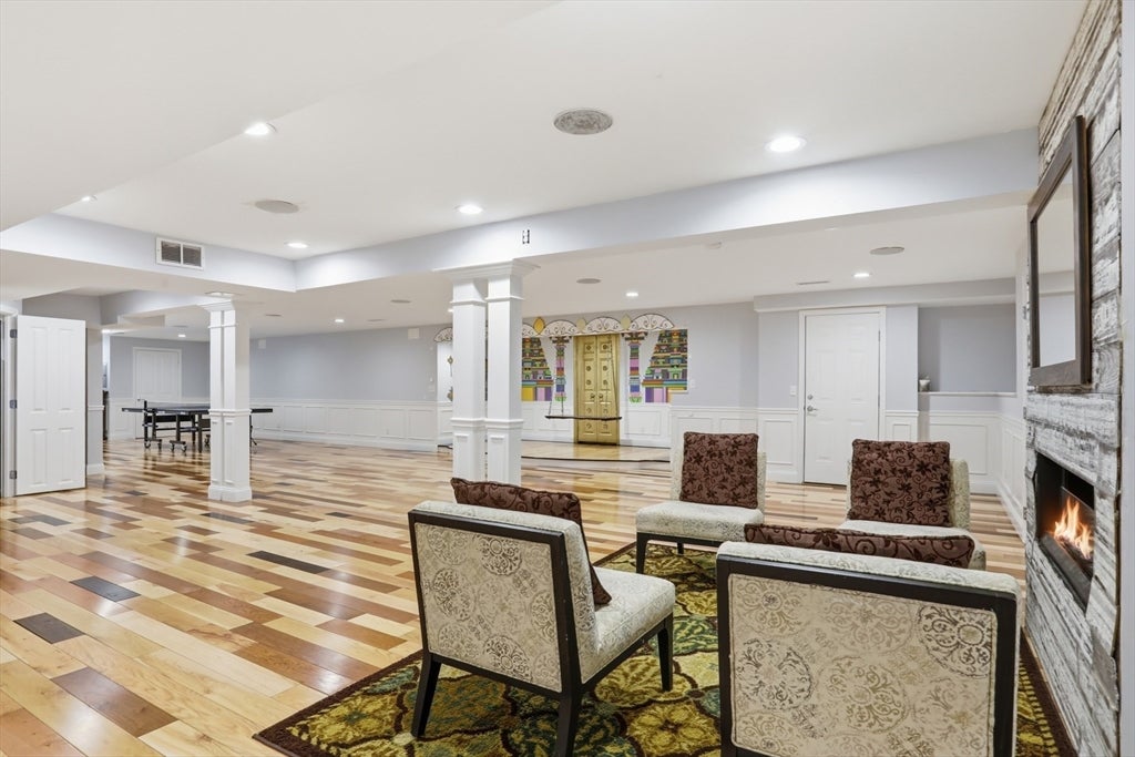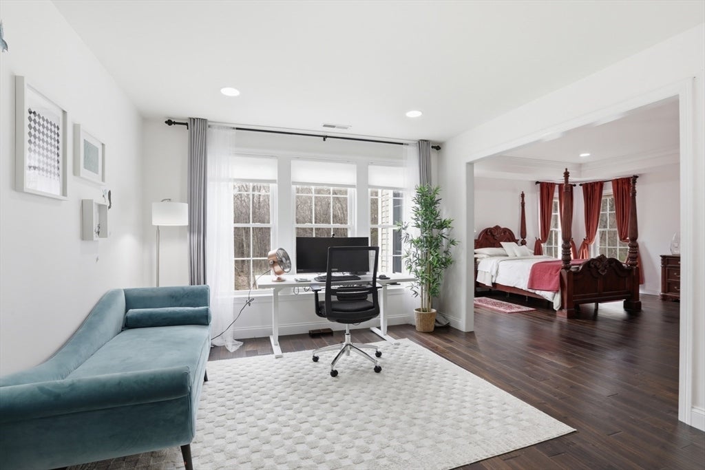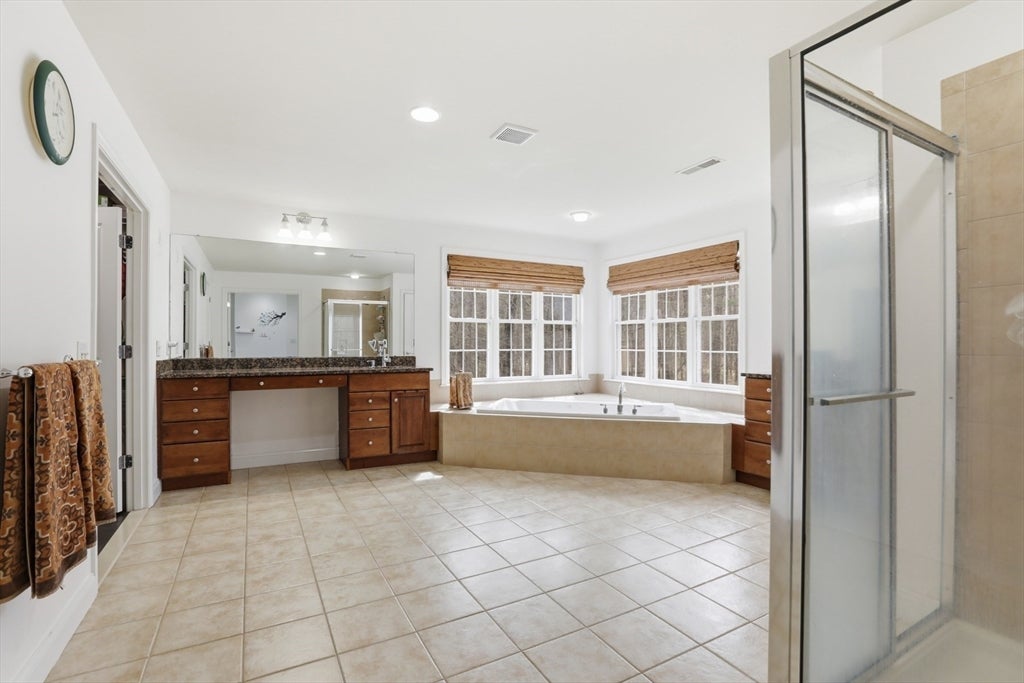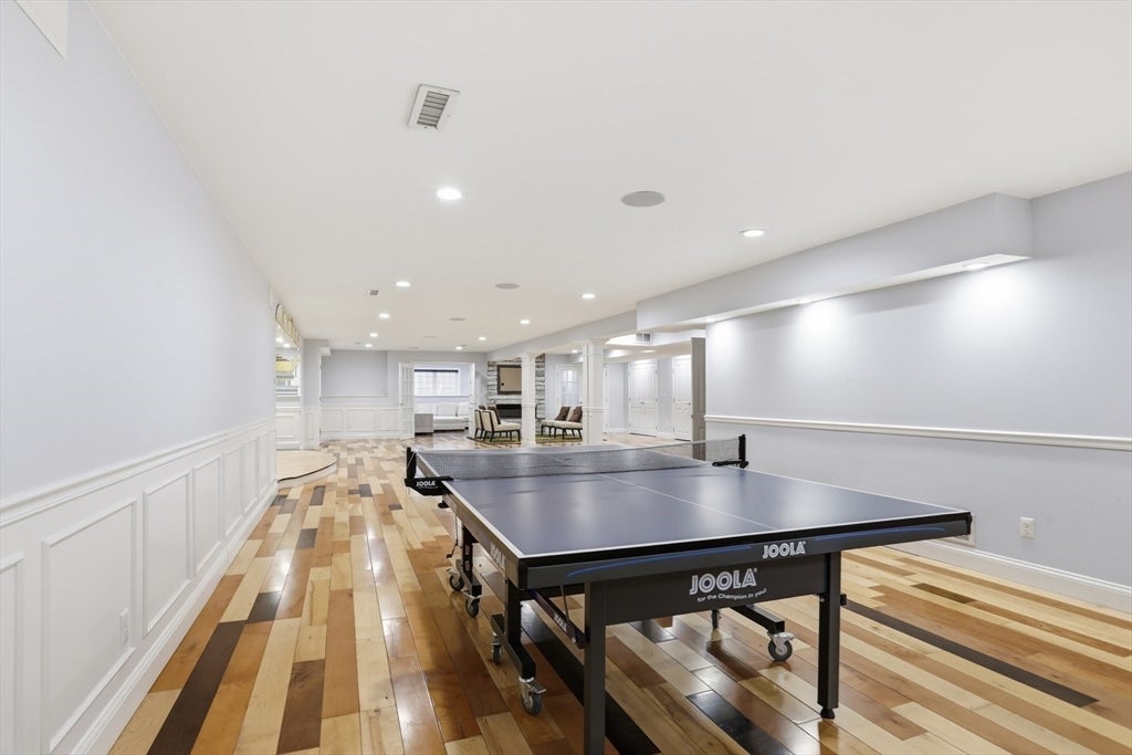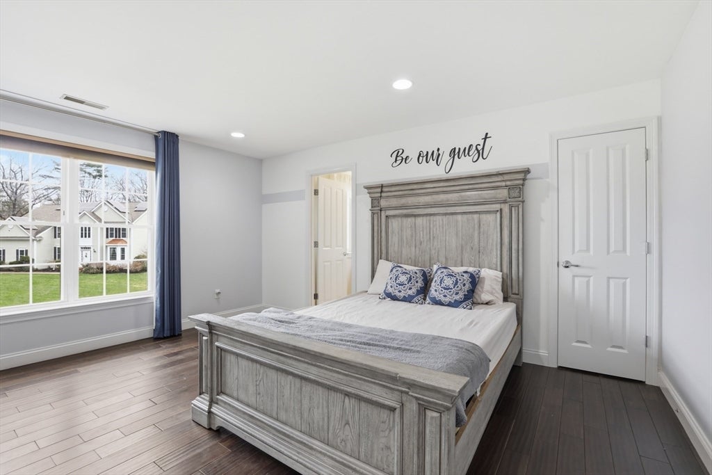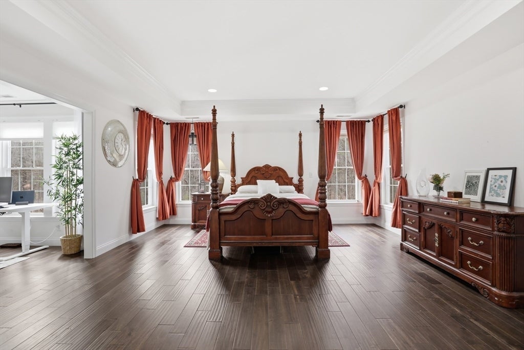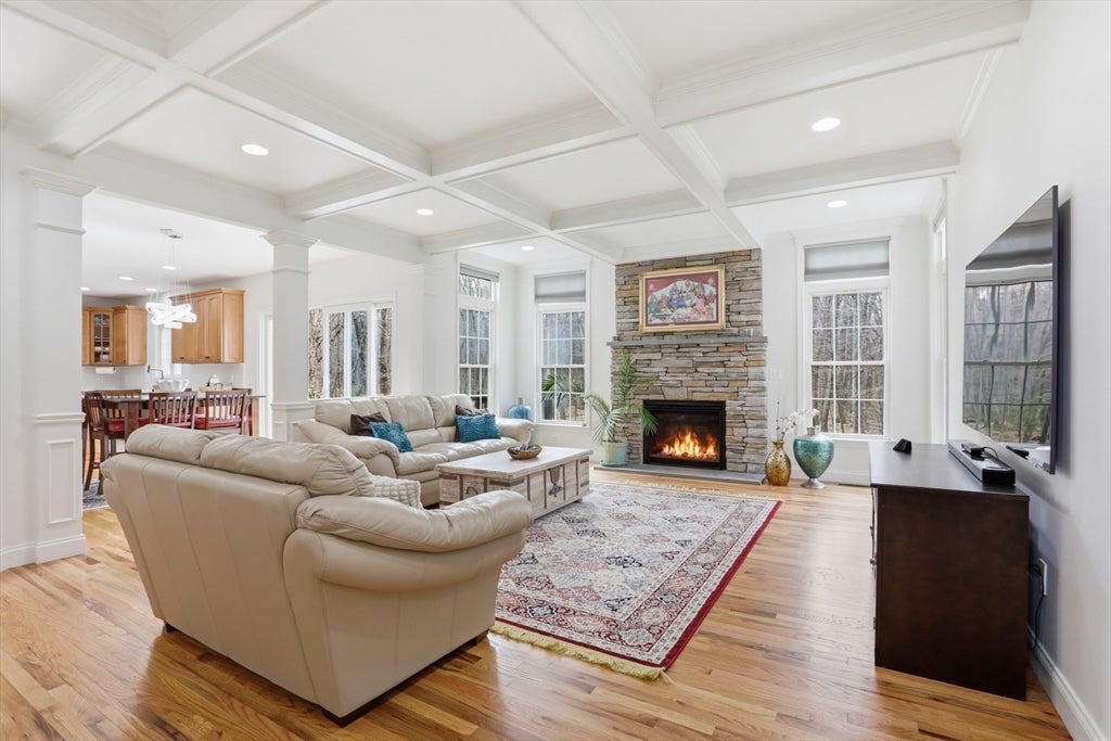 Set back from the main road, this stately Robbins Mill Colonial stands proud on one of the best lots in the neighborhood abutting conservation land and with lawn enough for field sports plus a future pool. A dramatic two-story foyer with an elegant crystal chandelier welcomes you to this open floor plan with flexible spaces. The gourmet kitchen impresses with a large island, quartz countertops and backsplash, and an easy flow into back yard or the family room with its stone fireplace and coffered ceiling. Dedicated entertaining and office space, plus a 1st floor bonus room for work, play or hobbies complete the 1st floor. Upstairs, the primary suite offers generous closet space, a spa-like bath, and sitting area or extra office, plus there are 3 additional bedrooms with ensuite or shared bath. The lower level adds 2,500 SF including a theater room, Bose sound, bath, and potential for a home gym or in-law suite. Fresh paint, updated counters & faucets, plus owned solar panels.