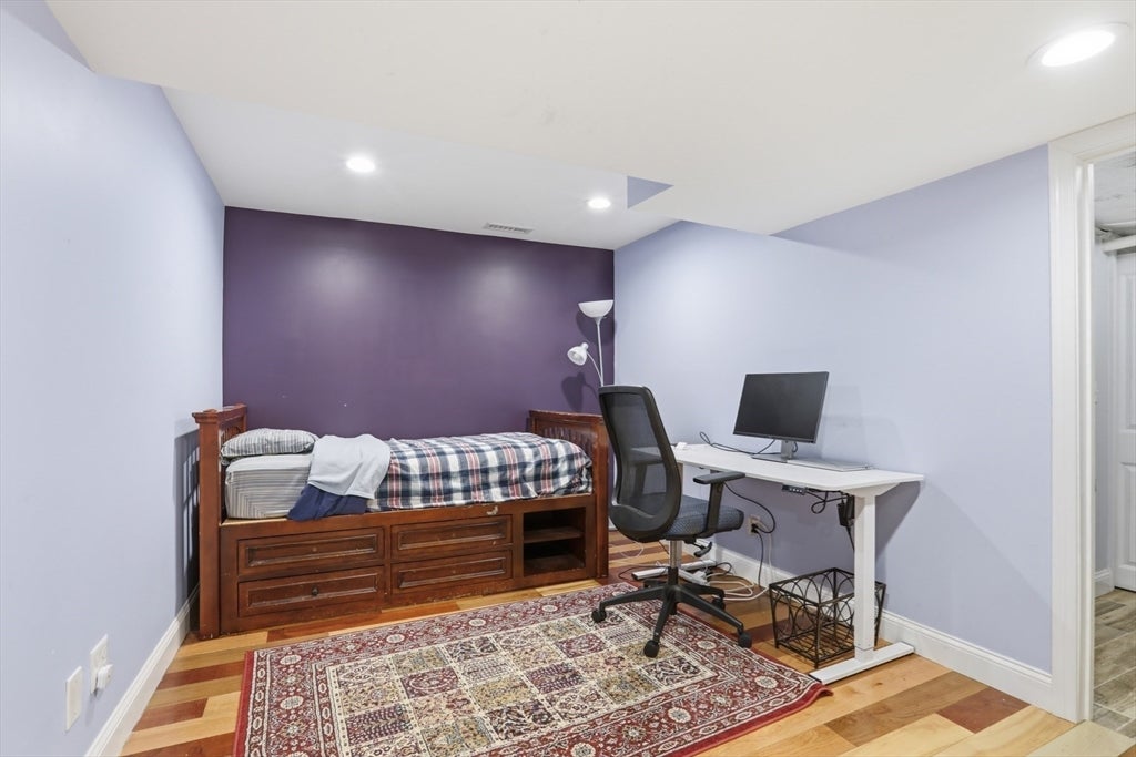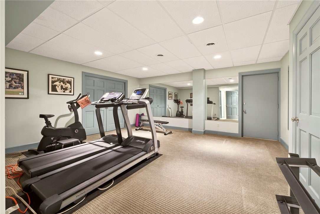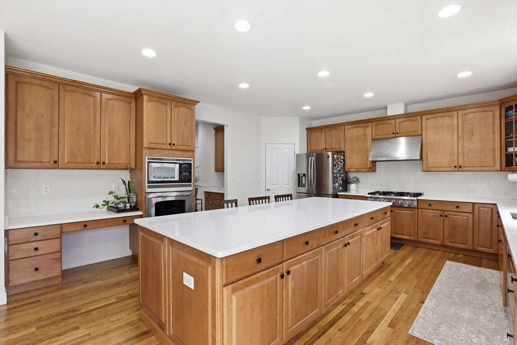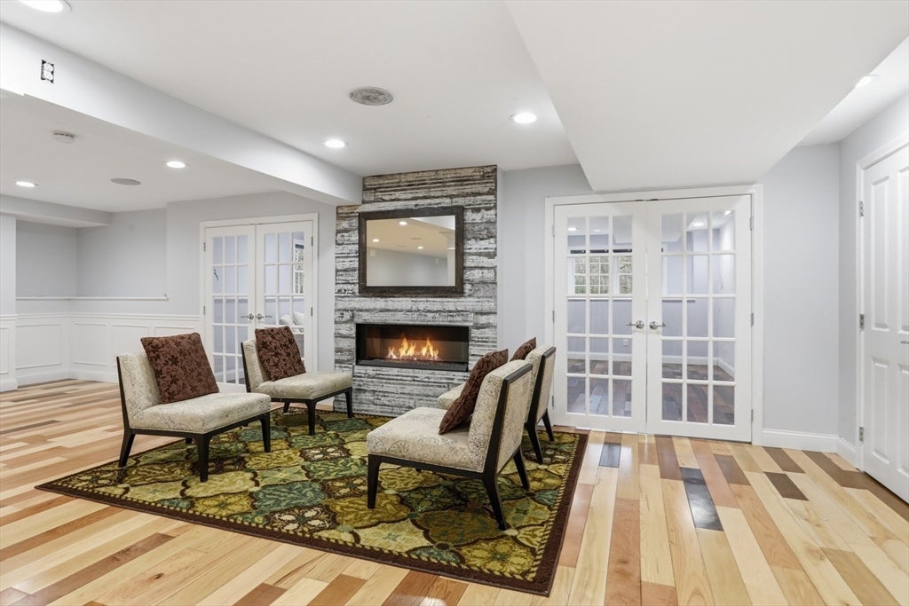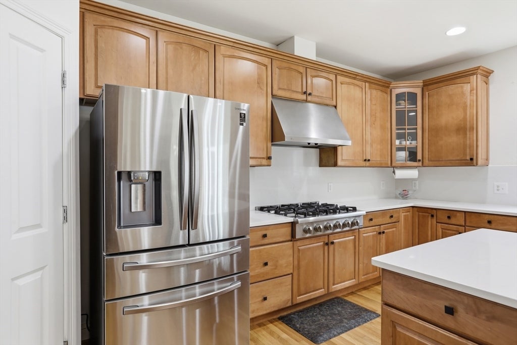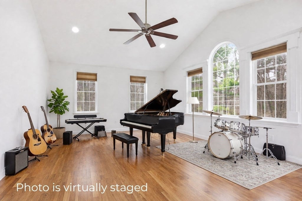 Set back from the main road, this stately Robbins Mill Colonial stands proud on one of the best lots in the neighborhood abutting conservation land and with lawn enough for field sports plus a future pool. A dramatic two-story foyer with an elegant crystal chandelier welcomes you to this open floor plan with flexible spaces. The gourmet kitchen impresses with a large island, quartz countertops and backsplash, and an easy flow into back yard or the family room with its stone fireplace and coffered ceiling. Dedicated entertaining and office space, plus a 1st floor bonus room for work, play or hobbies complete the 1st floor. Upstairs, the primary suite offers generous closet space, a spa-like bath, and sitting area or extra office, plus there are 3 additional bedrooms with ensuite or shared bath. The lower level adds 2,500 SF including a theater room, Bose sound, bath, and potential for a home gym or in-law suite. Fresh paint, updated counters & faucets, plus owned solar panels.