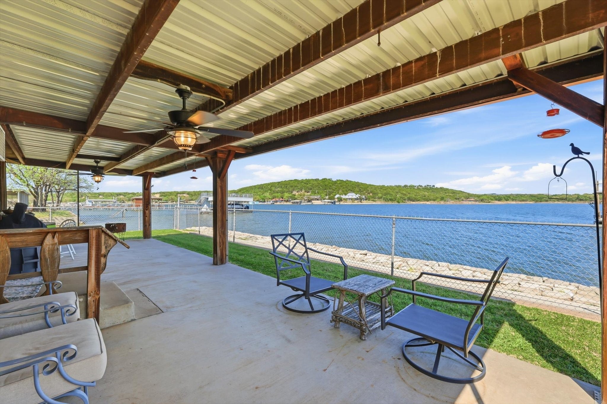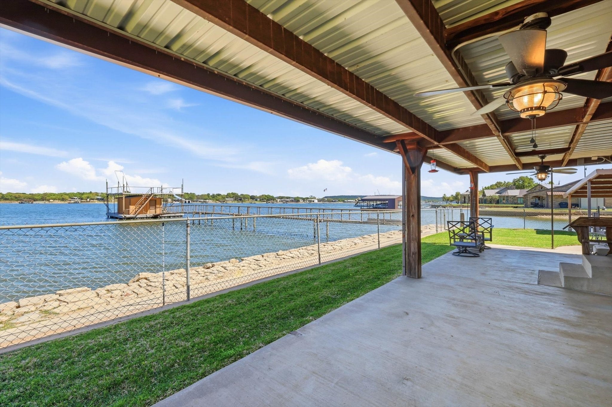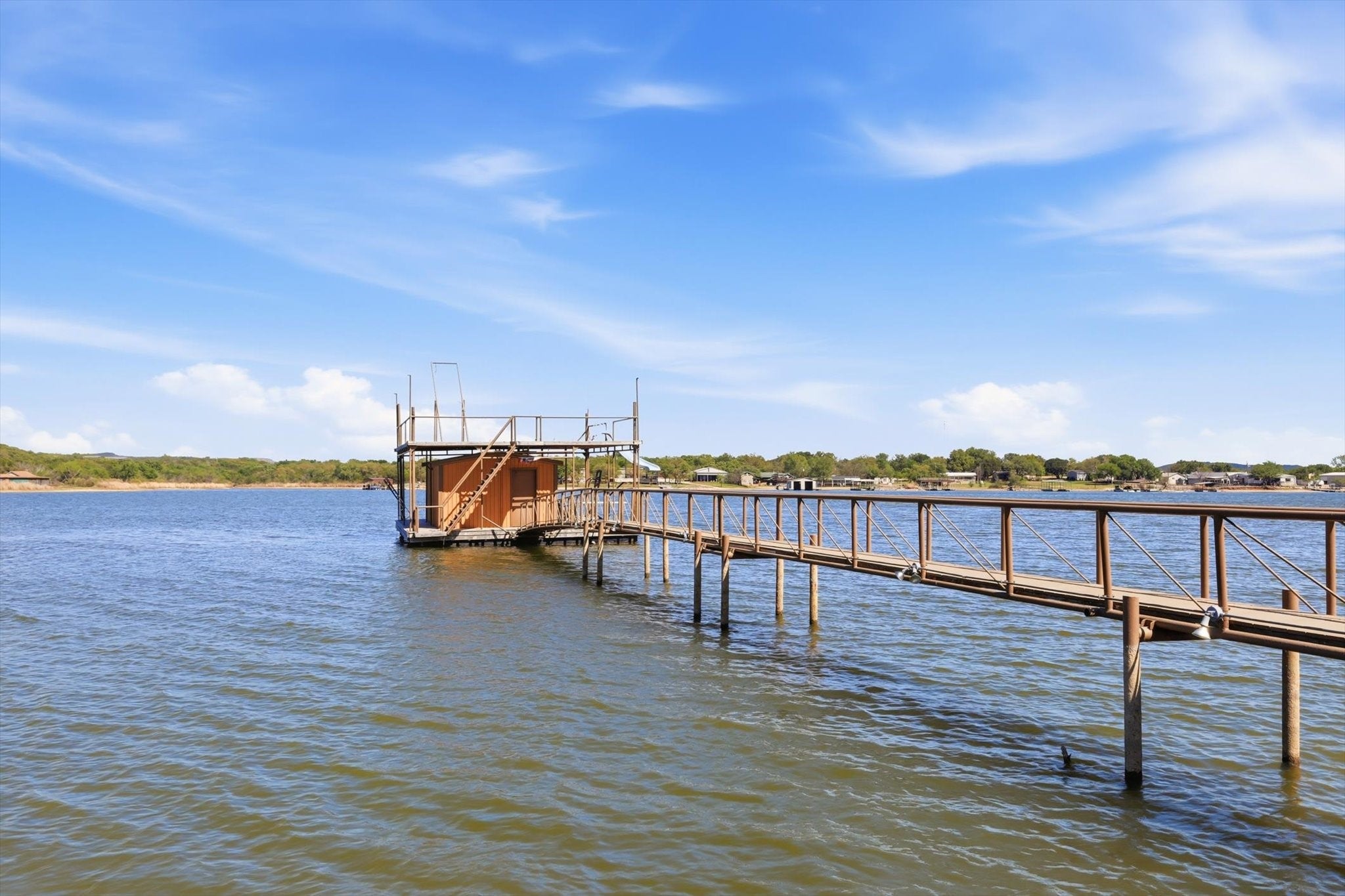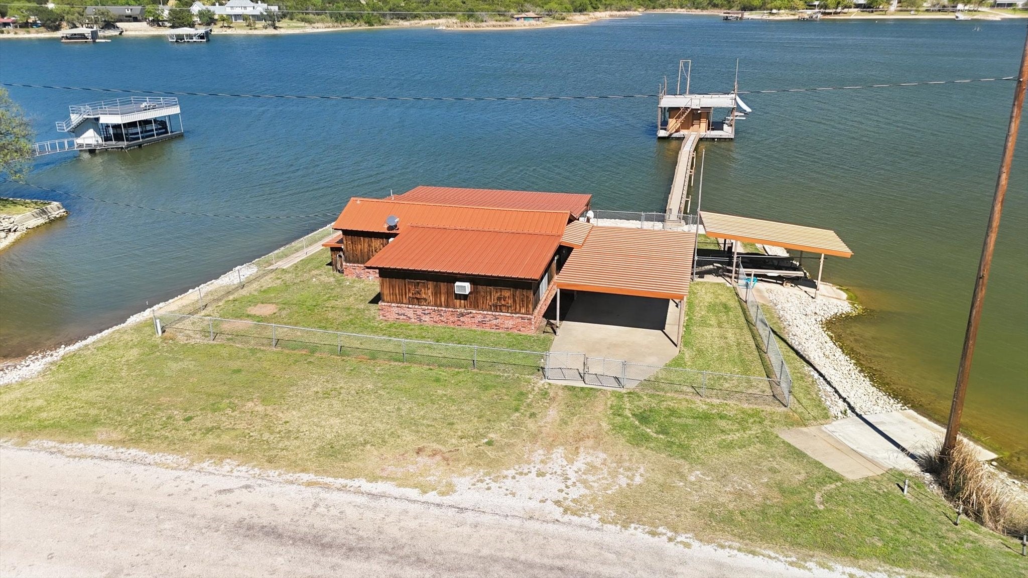 Discover an exceptional waterfront retreat designed for both relaxation and unforgettable entertaining. This stunning 2 bed, 2 bath home sits on the highly sought after west side, offering breathtaking water views and unmatched amenities for lake living at its finest. The home features spacious low maintenance layout, highlighted by an oversized guest suite, large enough to accommodate up to 8 guests, with space for 3 king size beds and a bunk bed. With minimal effort, the expansive room can be converted into 2 separate bedrooms, providing flexible living options for family and visitors. Step outside and experience true waterfront luxury. The property boasts of a private boat ramp and a convenient trolley system, making launching and storing your boat or wave runner effortless. A standout feature is the impressive crappie house, which is grandfathered in, complete with an upper deck and slide for fulfilled days on the water. Positioned over approximately 20 ft of water at the end of the crappie house, offers excellent fishing opportunities year round. In addition, the property includes a massive three-bay shop, ideal for storing boats, equipment and all your lake toys. Whether youre looking for a full-time residence, weekend getaway or income producing property, this one of a kind waterfront home delivers space, functionality and endless recreation in a truly unbeatable setting.