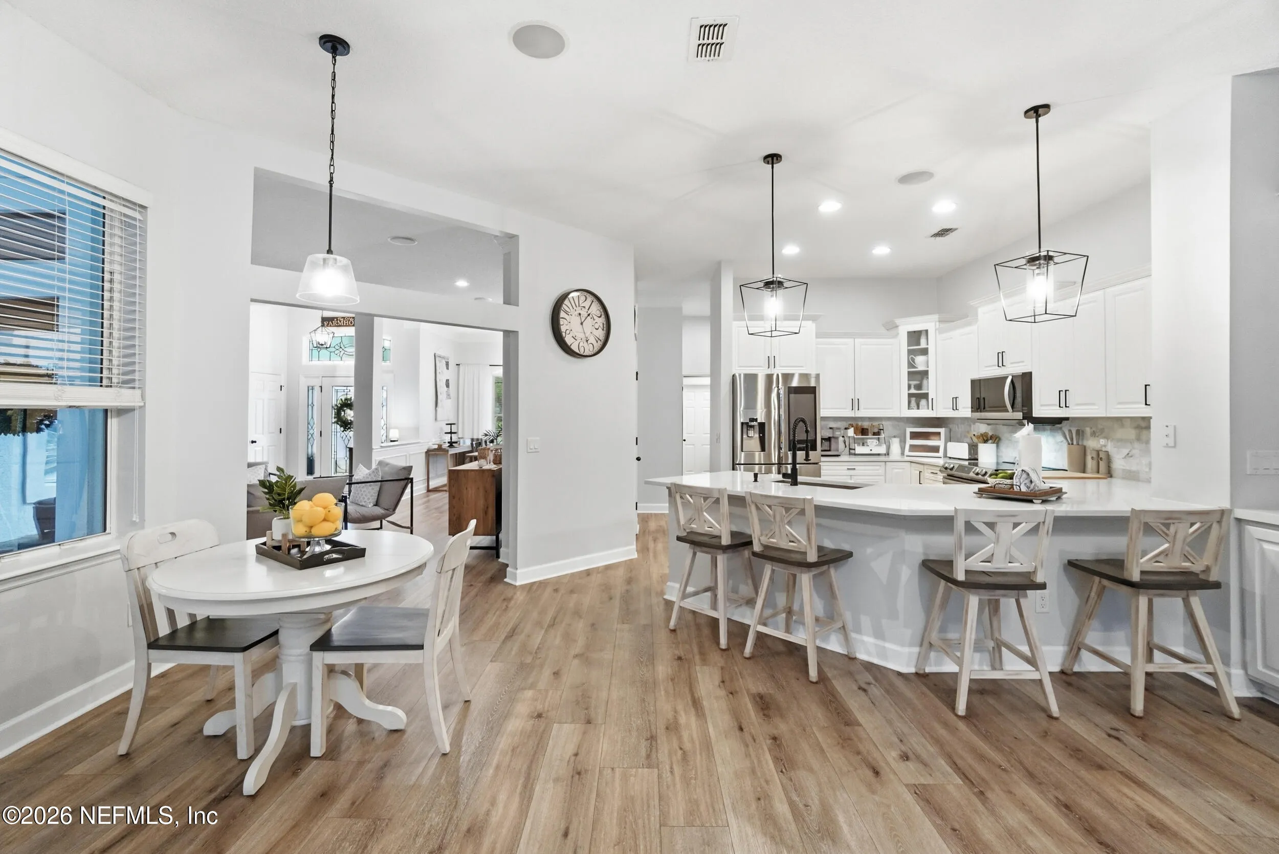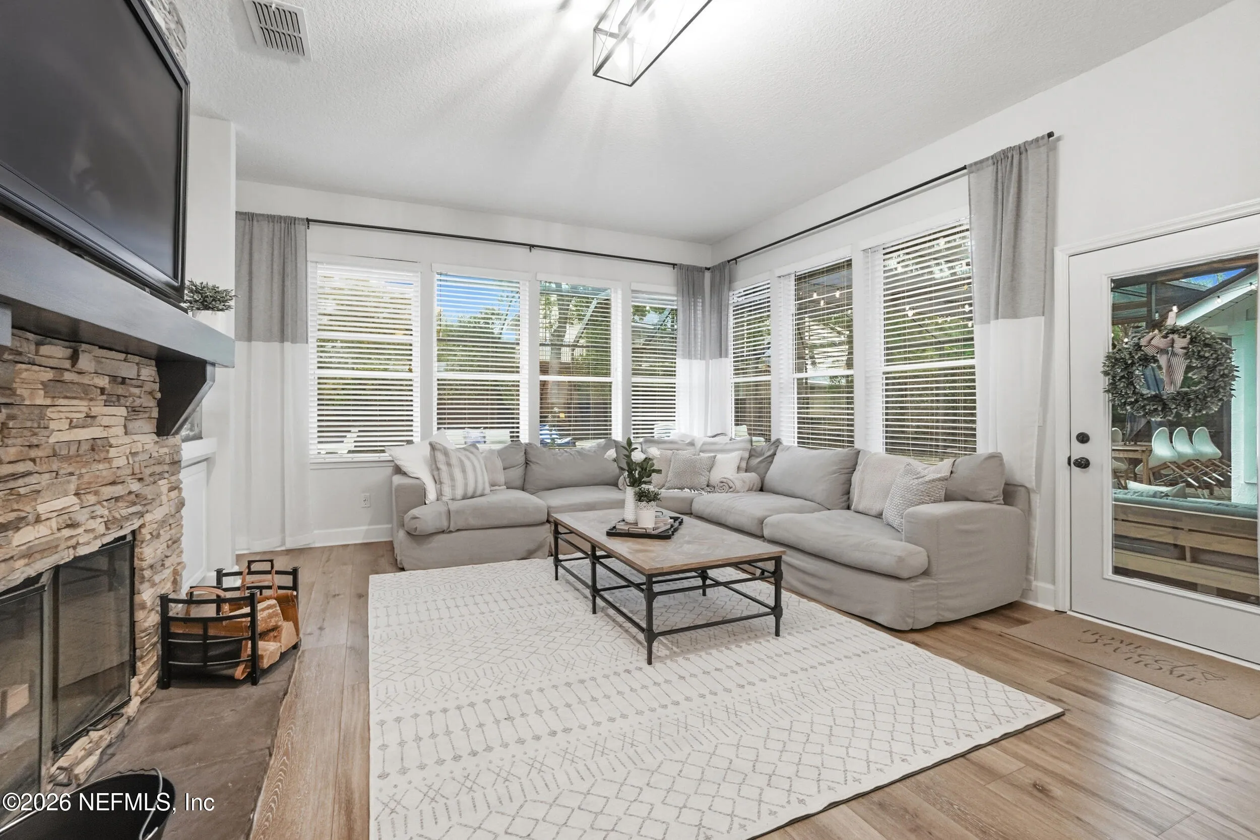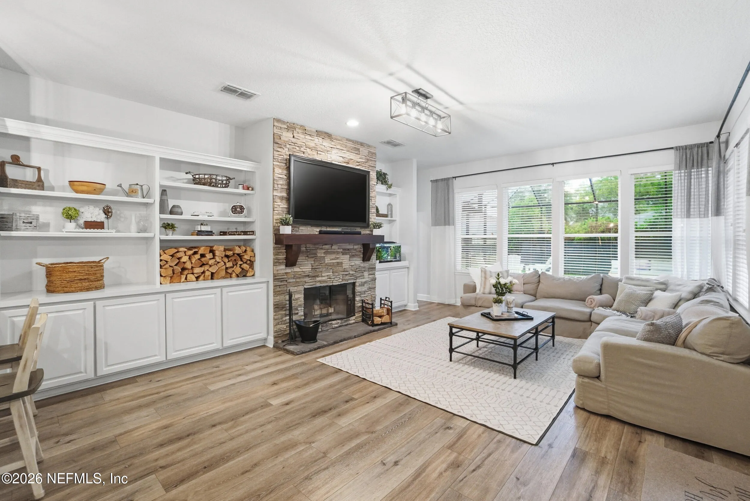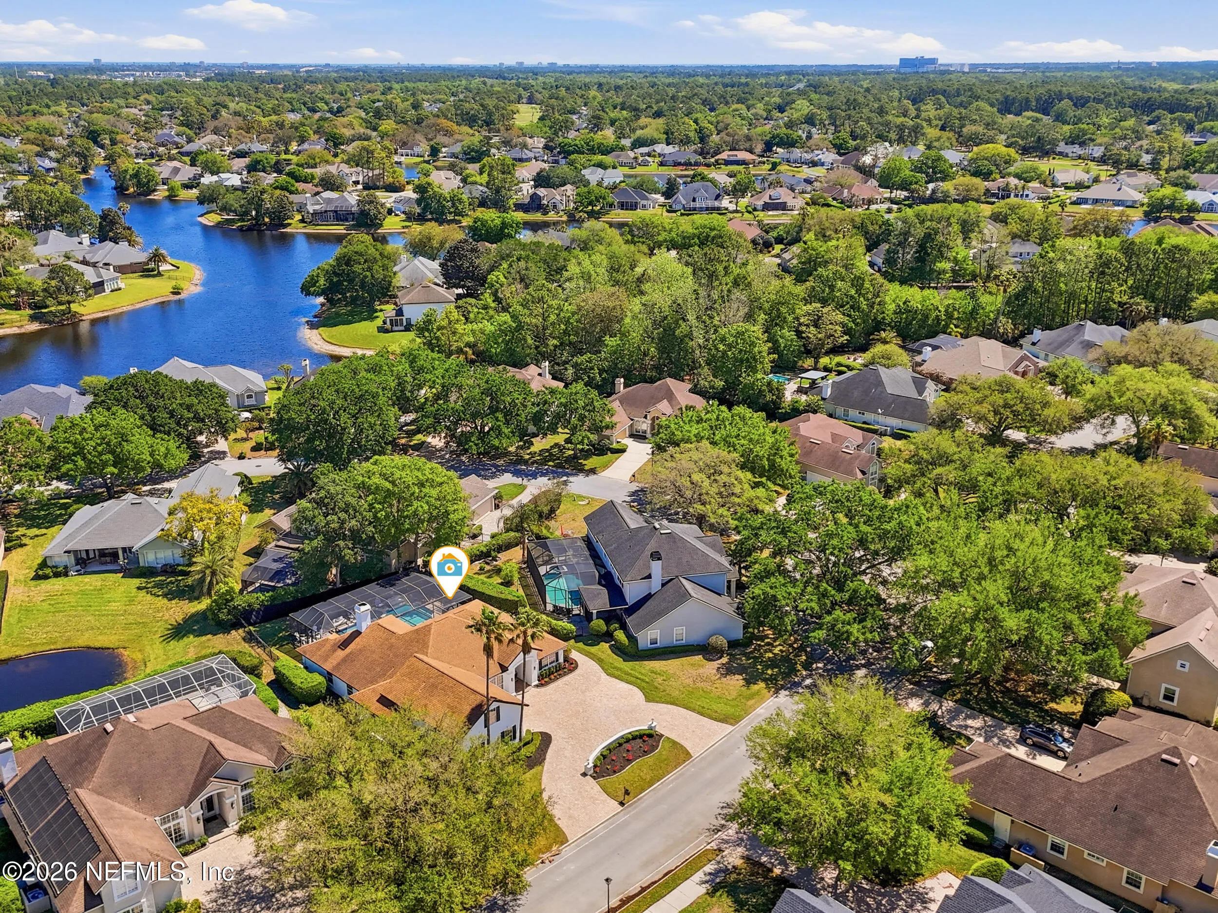 Located in Jacksonville Golf & Country Club, one of the areas premier gated communities, this beautiful 5 bedroom / 4.5 bathroom pool home offers a truly functional layout. Four bedrooms are located on the main level, including the primary suite and a dedicated office with custom built-ins. Wide plank flooring runs throughout (no carpet anywhere), and a wood-burning fireplace anchors the main living area. The kitchen features updated stainless appliances, beautiful countertops, and opens easily to the living and dining spaces. Interior and exterior paint colors are fresh and neutral. A large upstairs bonus room with ensuite bath serves as the 5th bedroom - ideal for guests or a private retreat. Step outside to a screened pool and patio, along with a private backyard featuring lovely lake views. A circular paver driveway offers extra parking and great curb appeal. Enjoy this special home and the vibrant community with access to pickleball, basketball, sports fields, and playground.