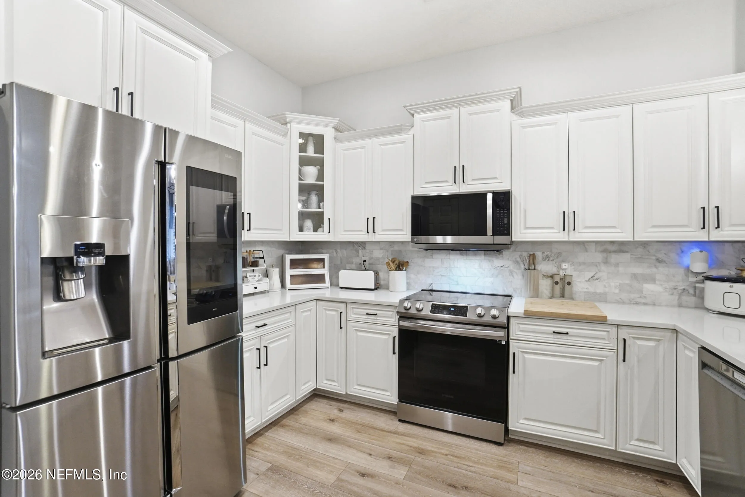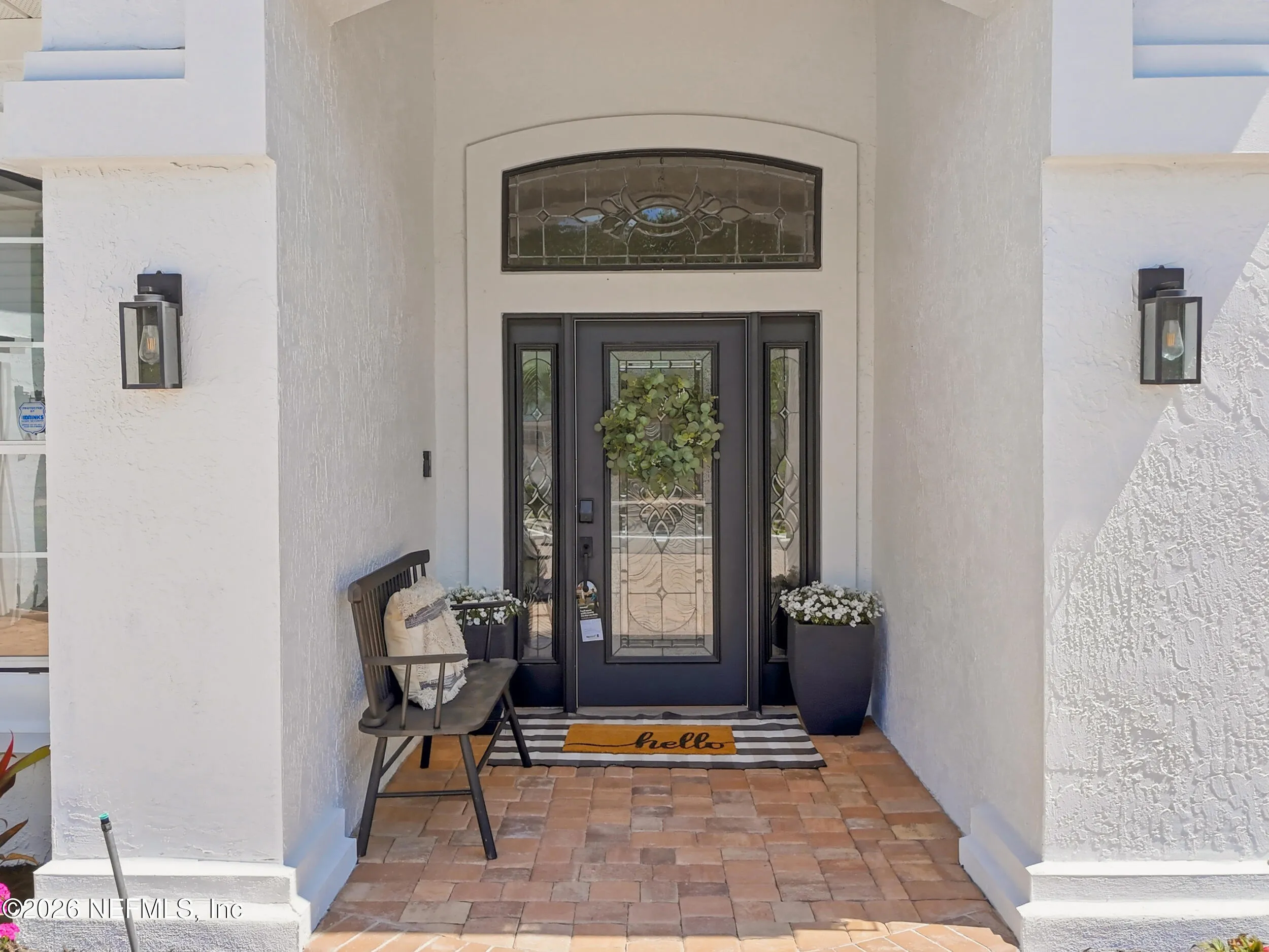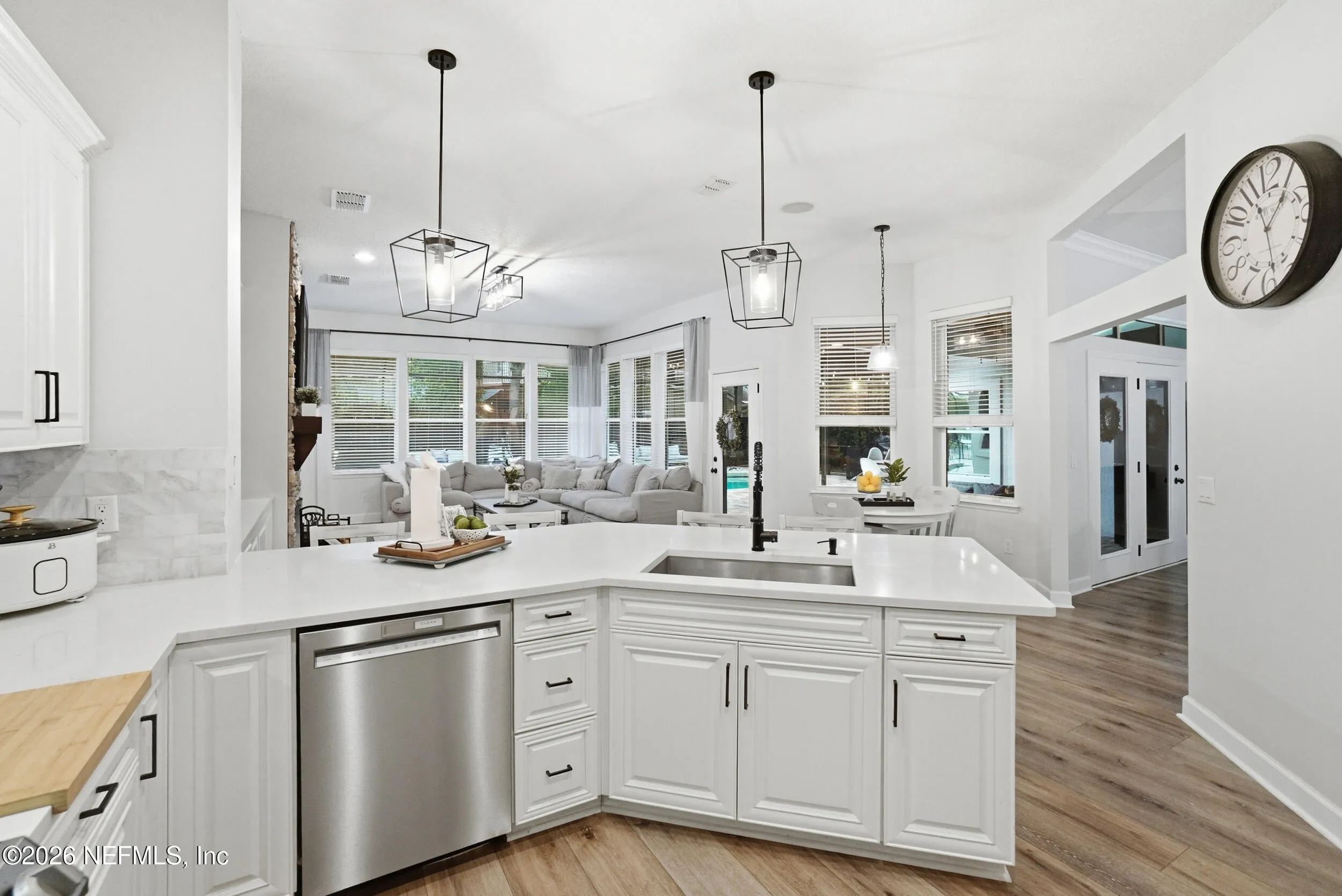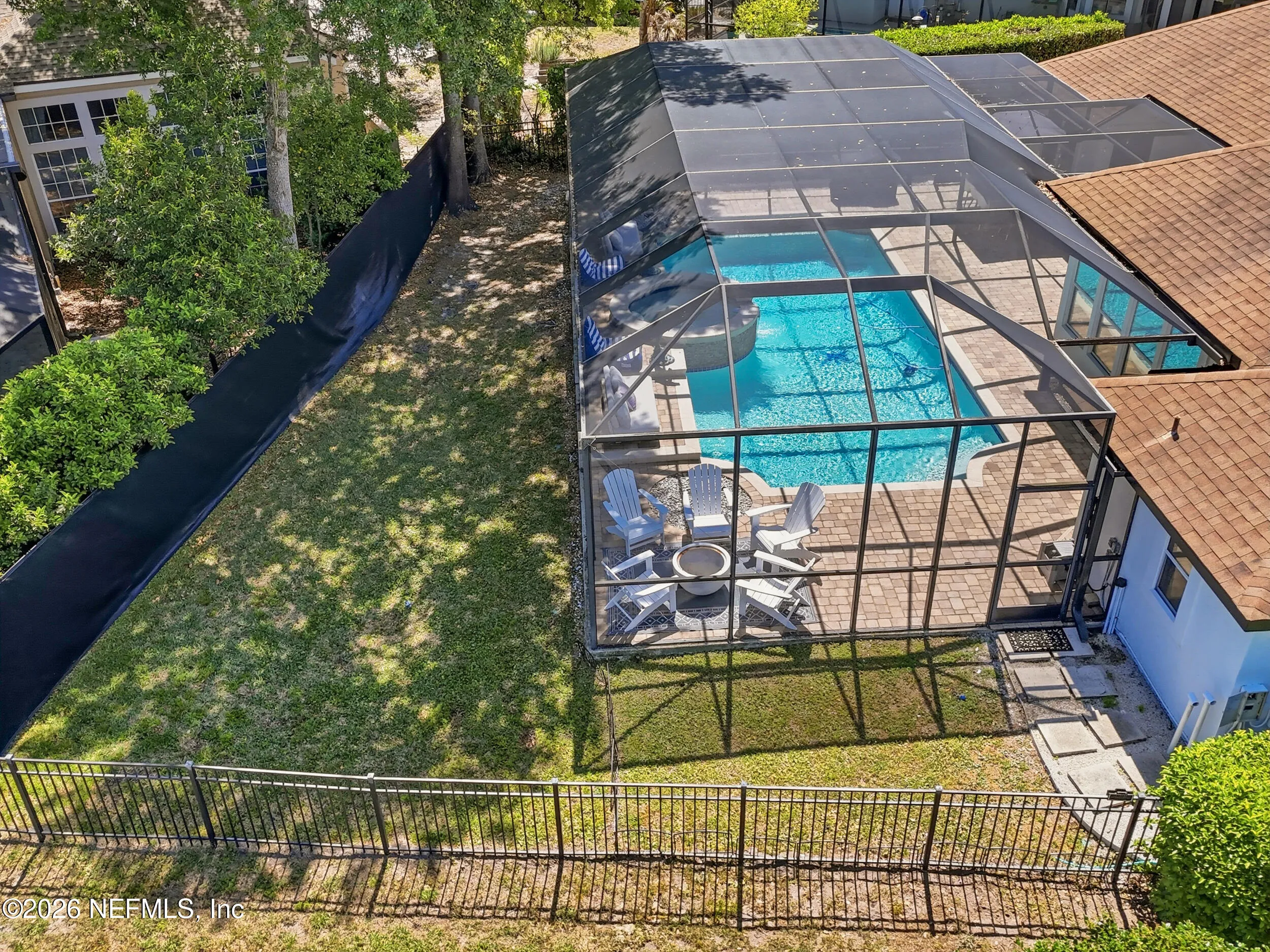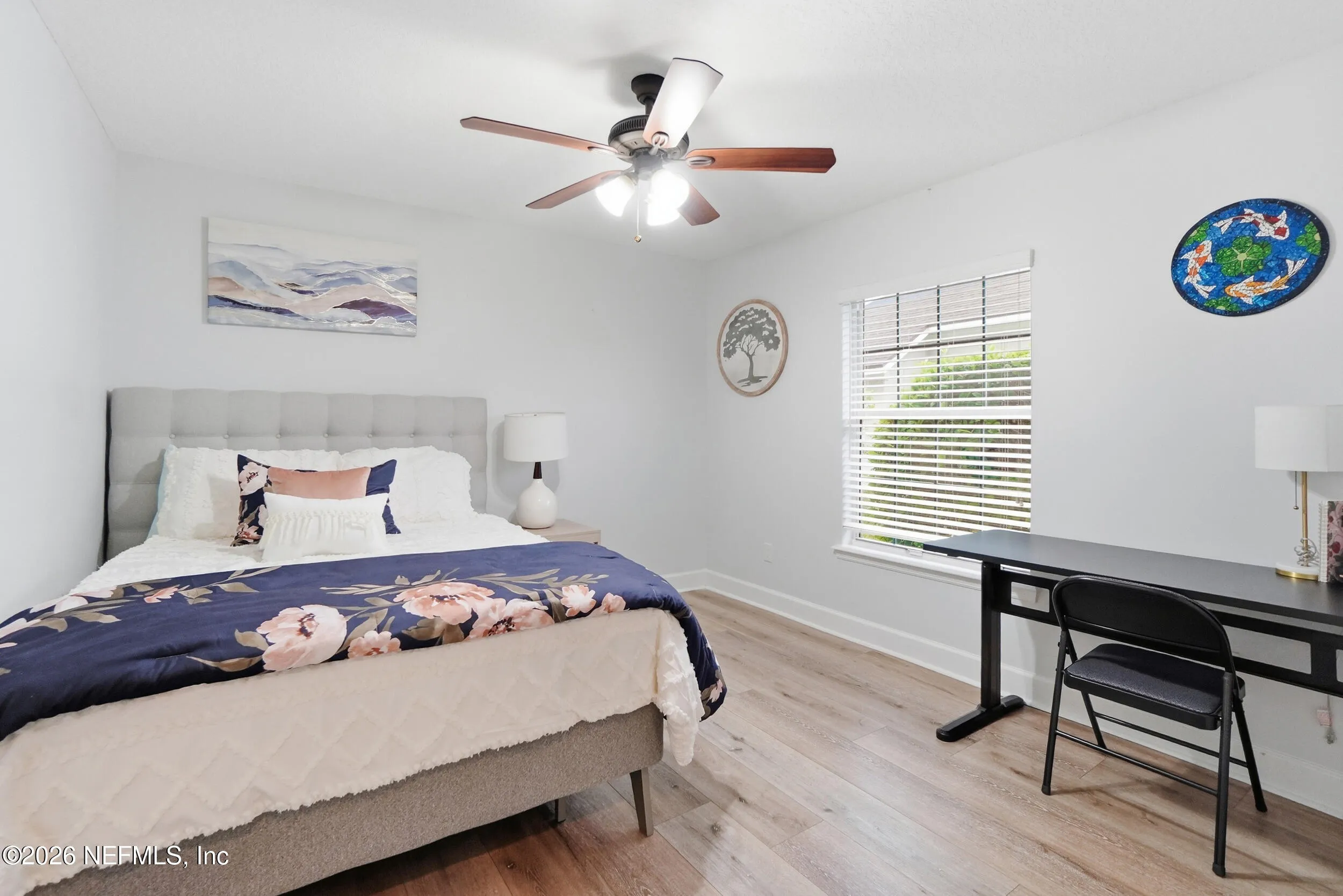 Located in Jacksonville Golf & Country Club, one of the areas premier gated communities, this beautiful 5 bedroom / 4.5 bathroom pool home offers a truly functional layout. Four bedrooms are located on the main level, including the primary suite and a dedicated office with custom built-ins. Wide plank flooring runs throughout (no carpet anywhere), and a wood-burning fireplace anchors the main living area. The kitchen features updated stainless appliances, beautiful countertops, and opens easily to the living and dining spaces. Interior and exterior paint colors are fresh and neutral. A large upstairs bonus room with ensuite bath serves as the 5th bedroom - ideal for guests or a private retreat. Step outside to a screened pool and patio, along with a private backyard featuring lovely lake views. A circular paver driveway offers extra parking and great curb appeal. Enjoy this special home and the vibrant community with access to pickleball, basketball, sports fields, and playground.