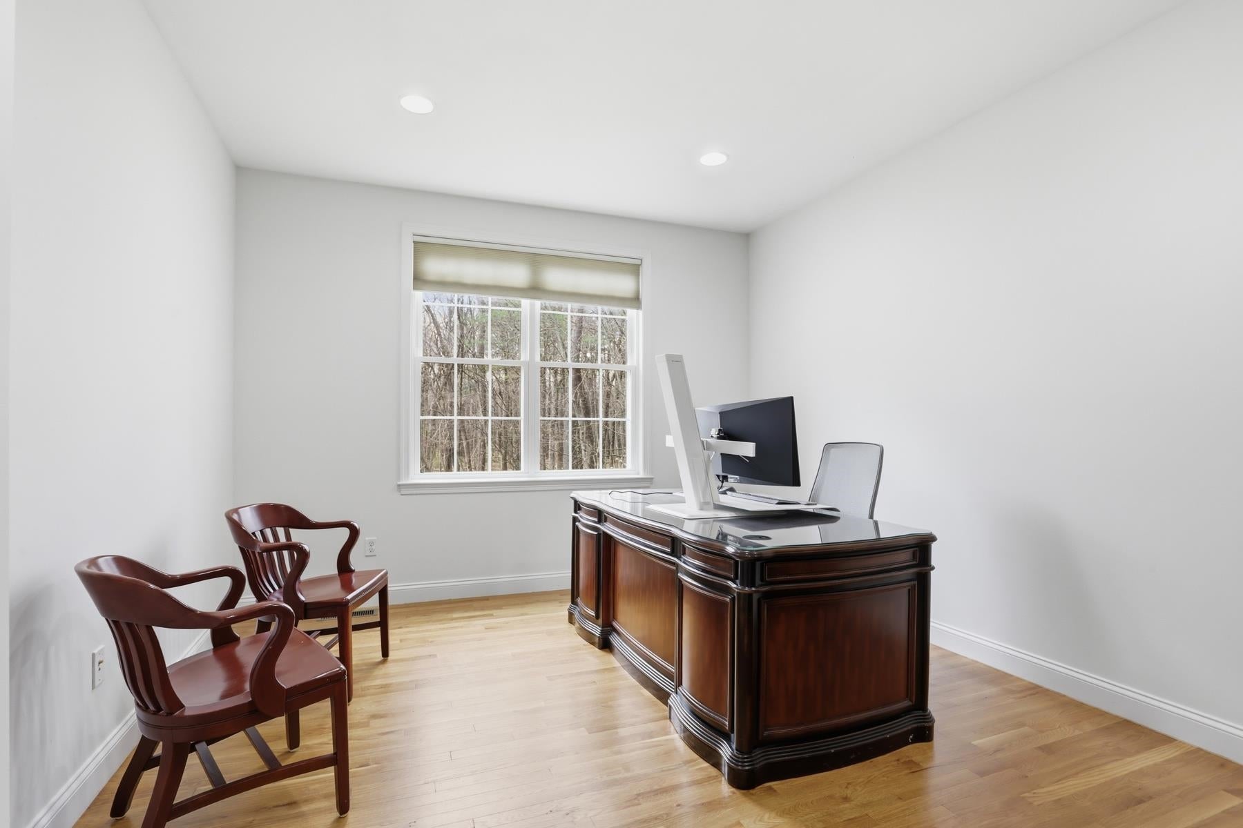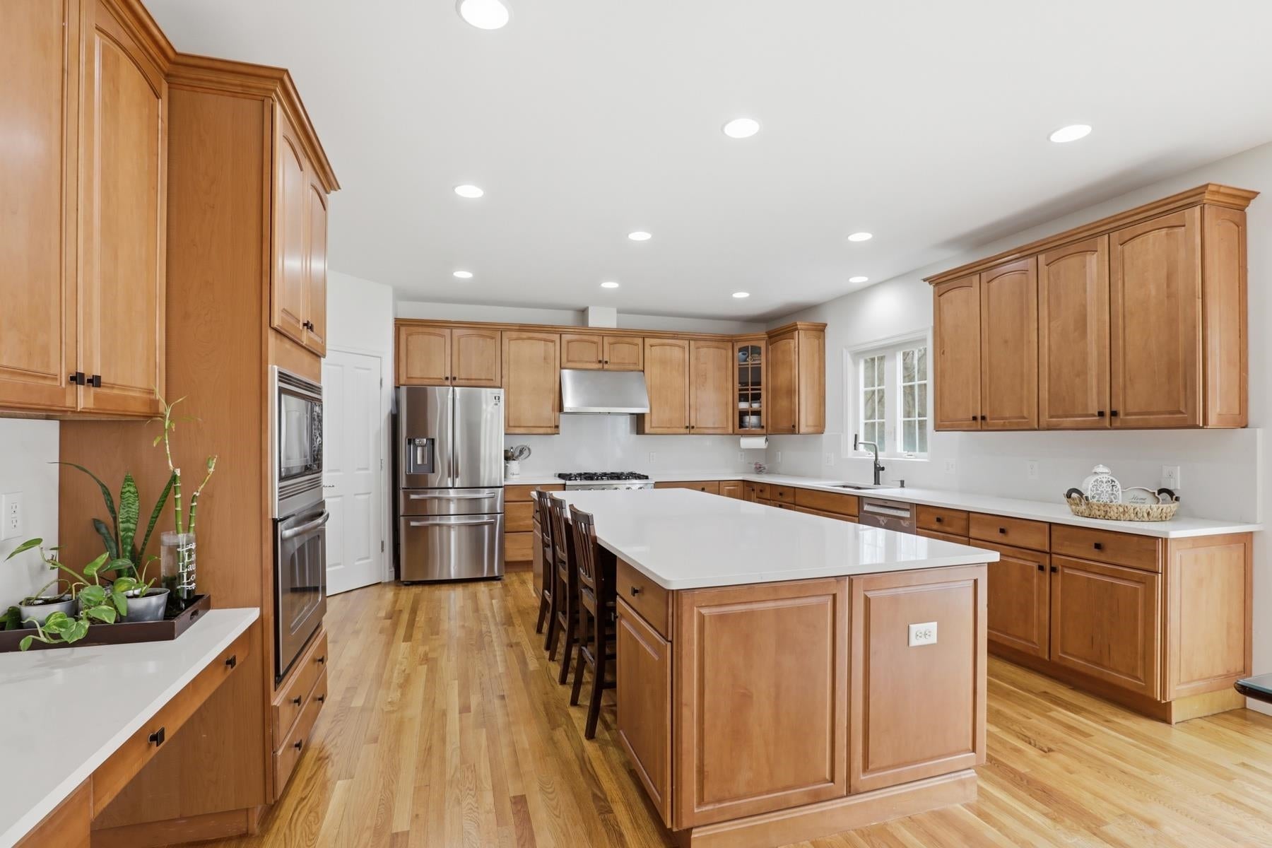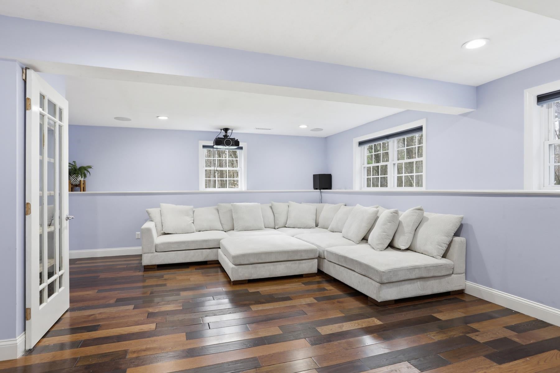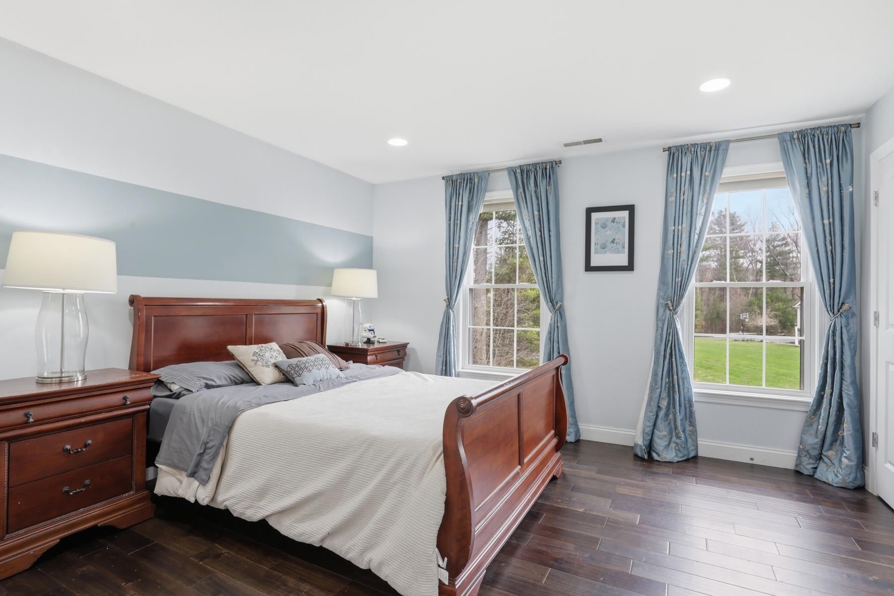 Set back from the main road, this stately Robbins Mill Colonial stands proud on one of the best lots in the neighborhood abutting conservation land and with lawn enough for field sports plus a future pool. A dramatic two-story foyer with an elegant crystal chandelier welcomes you to this open floor plan with flexible spaces. The gourmet kitchen impresses with a large island, quartz countertops and backsplash, and an easy flow into back yard or the family room with its stone fireplace and coffered ceiling. Dedicated entertaining and office space, plus a 1st floor bonus room for work, play or hobbies complete the 1st floor. Upstairs, the primary suite offers generous closet space, a spa-like bath, and sitting area or extra office, plus there are 3 additional bedrooms with ensuite or shared bath. The lower level adds 2,300 SF including a theater room, Bose sound, bath, and potential for a home gym or in-law suite. Fresh paint, updated counters & faucets, plus owned solar panels.